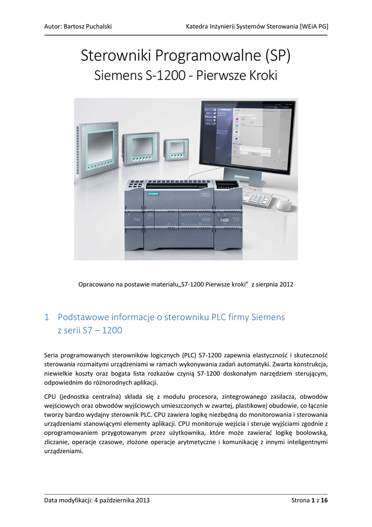 Autor: Bartosz Puchalski Katedra Inżynierii Systemów Sterowania [WEiA PG] Sterowniki Programowalne (SP) Siemens S-1200 - Pierwsze Kroki Opracowano na postawie materiału„S7-1200 Pierwsze kroki” z sierpnia 2012 1 Podstawowe informacje o sterowniku PLC firmy Siemens z serii S7 – 1200 Seria programowanych sterowników logicznych (PLC) S7-1200 zapewnia elastyczność i skuteczność sterowania rozmaitymi urządzeniami w ramach wykonywania zadań automatyki. Zwarta konstrukcja, niewielkie koszty oraz bogata lista rozkazów czynią S7-1200 doskonałym narzędziem sterującym, odpowiednim do różnorodnych aplikacji. CPU (jednostka centralna) składa się z modułu procesora, zintegrowanego zasilacza, obwodów wejściowych oraz obwodów wyjściowych umieszczonych w zwartej, plastikowej obudowie, co łącznie tworzy bardzo wydajny sterownik PLC. CPU zawiera logikę niezbędną do monitorowania i sterowania urządzeniami stanowiącymi elementy aplikacji. CPU monitoruje wejścia i steruje wyjściami zgodnie z oprogramowaniem przygotowanym przez użytkownika, które może zawierać logikę boolowską, zliczanie, operacje czasowe, złożone operacje arytmetyczne i komunikację z innymi inteligentnymi urządzeniami. Data modyfikacji: 4 października 2013 Strona 1 z 16 Autor: Bartosz Puchalski Katedra Inżynierii Systemów Sterowania [WEiA PG] CPU jest wyposażana w port PROFINET umożliwiający komunikację poprzez sieć PROFINET. Dostępne są również moduły komunikacyjne komunikacyjne pozwalające na łączność poprzez interfejsy RS485 lub RS232. Na Rysunek 1 przedstawiono sterownik S7-1200 S7 1200 oraz jego charakterystyczne elementy. 1. Diody LED statusu wbudowanych portów I/O 2. Diody LED statusu operacyjnego CPU 3. Złącze PROFINET 4. Slot karty pamięciowej (pod klapką) 5. Rozpinane złącza na kable Rysunek 1 Budowa sterownika S7-1200 Różne modele CPU zapewniają różnorodne cechy i możliwości. możliwośc Pozwalają ozwalają tworzyć wydajne rozwiązania w rozmaitych aplikacjach. W pracowni E200 znajdują się sterowniki o oznaczeniach oznaczenia S7 – 1200 CPU 1214C AC/DC/RLY co oznacza, że jest to: to sterownik zasilany poprzez napięcie zmienne AC (85 – 264 VAC), wejścia zasilane są napięciem stałym DC (24 VDC) a wyjścia są typu przekaźnikowego (RLY) (5 – 30 VDC lub 5 – 250 VAC). Dodatkowo sterownik wyposażony jest w: • • dwa wejścia analogowe (niesymetryczne) o zakresie od 0 do 10 V (rozdzielczość 10 bitów); płytkę sygnałową wyposażona w jedno wyjście analogowe typu napięcie/prąd o zakresie +/+/ 10 V (rozdzielczość 12 bitów) lub 0 – 20 mA (rozdzielczość 11 bitów). 2 Konfiguracja adresu IP sterownika 1. W celu konfiguracji adresu IP sterownika należy uruchomić środowisko dowisko Totally Integrated Automation Portal (TIA), klikając dwukrotnie na ikonę znajdującą się na pulpicie lub poprzez menu Start - > Programy -> Siemens Automation ->TIA Portal V11.. 2. W oknie aplikacji TIA należy wybrać polecenie Online and Diagnostics a następnie wybrać Accessible devices (Rysunek Rysunek 2) Rysunek 2 Okno aplikacji TIA - konfiguracja adresu IP Data modyfikacji: 4 października 2013 Strona 2 z 16 Autor: Bartosz Puchalski Katedra Inżynierii Systemów Sterowania [WEiA PG] 3. Po wybraniu polecenia Accessible devices pojawi się okno z listą dostępnych sterowników do konfiguracji.. Gdy skanowanie dostępnych urządzeń w sieci lokalnej dobiegnie końca w polu Online status information: pojawi się komunikat Scanning ended (Rysunek 3). 3 Rysunek 3 Okno z dostępnymi urządzeniami do konfiguracji 4. Na liście urządzeń należy odszukać urządzenie które jest przydzielone do stanowiska po adresie MAC.. Adres MAC sterownika znajduje się nad złączem PROFINET. 5. Klikamy polecenie show. 6. Po wybraniu polecenia Show środowisko przełączy się w tryb TIA Project View 7. Po lewej stronie okna znajduje się lista w której będzie rozwinięta pozycja ze ze sterownikiem który został wybrany w kroku 4. 8. Z listy należy wybrać polecenie Online and diagnostics klikając na nie podwójnie lewym przyciskiem myszy. 9. W oknie dialogowym należy wybrać polecenie Functions -> Assign IP adress (Rysunek ( 4) Rysunek 4 Zmiana adresu IP sterownika 10. Aby ułatwić prace ze sterownikami w laboratorium E200 każdemu sterownikowi terownikowi na stanowisku powinien zostać nadany adres IP zależny od numeru stanowiska. Odpowiednie adresy a IP dla każdego stanowiska zostaną podane przez prowadzącego. 11. Następnym krokiem jest podanie maski podsieci w polu Subnet mask.. W laboratorium E200 wykorzystywana maska podsieci jest następująca: 255.255.255.0. 12. Po wprowadzeniu adresu IP sterownika oraz maski podsieci należy należy zaakceptować zmiany poleceniem Assign IP address. address Data modyfikacji: 4 października 2013 Strona 3 z 16 Autor: Bartosz Puchalski Katedra Inżynierii Systemów Sterowania [WEiA PG] 13. Po ustanowieniu nowego adresu IP sterownika należy odświeżyć listę urządzeń poleceniem Update accessible devices w celu sprawdzenia czy został nadany nowy adres IP. Polecenie Update accessible devices znajduje się w okienku Project tree w zakładce Devices. 3 Konfiguracja i prosty program w TIA portal v 11 SP2 1. W celu utworzenia nowego projektu należy uruchomić Totally Integrated Automation Portal (TIA), klikając dwukrotnie na ikonę znajdującą się na pulpicie lpicie lub poprzez menu Start - > Programy ->> Siemens Automation ->TIA Portal V11. Jeżeli wcześniej otwarto aplikacje TIA Portal V11 np. w celu nadania adresu IP sterownikowi, należy zmienić widok projektu poleceniem Portal view . Polecenie to znajduje się w lewym dolnym roku okna aplikacji TIA. 2. Po uruchomieniu aplikacji TIA Portal i przejściu do widoku Portal View ukaze się okno z widokiem Portal View (Rysunek 5). ). W celu utworzenia nowego projektu należy wybrać opcje Create new project. Rysunek 5 Okno aplikacji TIA Portal View 3. W 