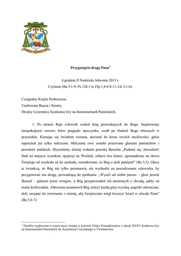 Przygotujcie drogę Panu1 6 grudnia II Niedziela Adwentu 2015 r. Czytania (Ba 5,1-9; Ps 126,1-6; Flp 1,4-6.8-11; Łk 3,1-6). Czcigodny Księże Proboszczu, Umiłowani Bracia i Siostry, Drodzy Uczestnicy Konkursu Gry na Instrumentach Pasterskich, 1. Po utracie Raju człowiek szukał dróg prowadzących do Boga. Inspirowany niespokojnym sercem, które pragnęło spoczynku, szedł po śladach Boga obecnych w przyrodzie. Kierując się światłem rozumu, docierał do kresu swoich możliwości, gdzie napotykał już tylko milczenie. Milczenie owo zostało przerwane głosami patriarchów i proroków pańskich. Słyszeliśmy dzisiaj wołanie proroka Barucha „Podnieś się, Jeruzalem! Stań na miejscu wysokim, spojrzyj na Wschód, zobacz twe dzieci, zgromadzone na słowo Świętego od wschodu aż do zachodu, rozradowane, że Bóg o nich pamiętał” (Ba 5,5). Głosy te świadczą, że Bóg nie tylko przemawia, ale wychodzi na poszukiwanie człowieka, by przygotować mu drogę, prowadzącą do spotkania: „Wyszli od ciebie pieszo – głosi prorok Baruch – pędzeni przez wrogów, a Bóg przyprowadził ich niesionych z chwałą, jakby na tronie królewskim. Albowiem postanowił Bóg zniżyć każdą górę wysoką, pagórki odwieczne, doły zasypać do zrównania z ziemią, aby bezpiecznie mógł kroczyć Izrael w chwale Pana” (Ba 5,6-7). 1 Homilia wygłoszona w czasie mszy świętej w kościele Trójcy Przenajświętsze z okazji XXXV Konkursu Gry na Instrumentach Pasterskich im. Kazimierza Uszyńskiego w Ciechanowcu 2. Zapowiedzi i obietnice Boga, nawiązujące do poszukiwania człowieka i przygotowania mu drogi, spełniły się w Nazarecie podczas Zwiastowania Maryi. Posłuszeństwo Dziewicy z Nazaretu sprawiło, że wraz z poczęciem Jezusa Chrystusa nastąpiło spotkanie Boga z człowiekiem. Myśli Boże stały się myślami człowieka, a drogi człowieka – drogami Boga. W Jezusie Chrystusie raz i na zawsze dokonało się pojednanie nieba z ziemią oraz bóstwa z człowieczeństwem. Narodziny Syna Człowieczego dały początek drodze, która prowadzi z Raju na ziemię i z ziemi do Raju. Tak o swojej misji wrazi się Chrystus: „Wyszedłem od Ojca i przyszedłem na świat; znowu opuszczam świat i idę do Ojca” (J 16,28). Syn Boży przyszedł na świat sam, ale wraca już nie sam: „A Ja, gdy zostanę nad ziemię wywyższony – powie Chrystus – przyciągnę wszystkich do siebie” (J 12,32). 3. Tym, który zapowiadał bezpośrednio przyjście Pana na ziemię, był Jan Chrzciciel, jeden z największych proroków. „Obchodził więc [On] całą okolicę nad Jordanem i głosił chrzest nawrócenia dla odpuszczenia grzechów, jak jest napisane w księdze mów proroka Izajasza: Głos wołającego na pustyni” (Łk 3,3-4). Tym głosem jest wołanie Jana Chrzciciela, skierowane do ludzi: „Przygotujcie drogę Panu, prostujcie ścieżki dla Niego! Każda dolina niech będzie wypełniona, każda góra i pagórek zrównane” (J 3,4). W myśl tego wołania należy odrzucić pychę oraz fałszywą pokorę i stanąć w prawdzie przed Bogiem, który posyła swego Syna, Jezusa Chrystusa: „On przez pierwsze przyjście w ludzkiej naturze – śpiewamy w 1. Prefacji Adwentowej – spełnił Twoje odwieczne postanowienie, a nam otworzył drogę wiecznego zbawienia”. Nasze przeżywanie Adwentu jest przygotowaniem do Świąt Bożego Narodzenia, ale nade wszystko przygotowaniem i oczekiwaniem na powtórne przyjście Pana. I tak, we wspomnianej Prefacji modlimy się słowami: „On ponownie przyjdzie w blasku swej chwały, aby nam udzielić obiecanych darów, których, czuwając z ufnością oczekujemy”. 4. Czas Adwentu, msze roratnie są naszym wołaniem do Boga: „Spuśćcie nam na ziemskie niwy Zbawcę z niebios, obłoki. Świat przez grzechy nieszczęśliwy, wołał w nocy głębokiej…” Pobyt nasz w Ciechanowcu, w parafii Trójcy Przenajświętszej, w okresie Adwentu ma związek z wielowiekową tradycją ludową związaną z grą na instrumentach pasterskich. Instrument ten – nazywany ligawką – był nie tylko pomocny pasterzom w ich pracy, lecz również służył do celów religijnych. Był głosem wzywającej trąby, niczym odpowiedź na słowa proroka Izajasza: „Wołaj na całe gardło, nie powściągaj się, podnieś jak trąba swój głos” (Iz 58,1). Otóż w grze na ligawce nie wystarczy wdmuchiwać w ten instrument powietrze, lecz grający musi wydobyć z siebie głos. 2 5. Dzisiaj, w II niedzielę Adwentu, przeżywamy 35. Konkurs Gry na Instrumentach Pasterskich im. Kazimierza Uszyńskiego, dawnego dyrektora Muzeum Rolnictwa w Ciechanowcu. Czterdzieści jeden lat temu, w 1974 r., odnalazł on na strychu jednego z zabudowań starą, porzuconą ligawkę, co zainspirowało go do zorganizowania pierwszego konkursu. Ligawka jest polskim ludowym instrumentem dętym z grupy aerofonów. Aerofony z kolei są grupą instrumentów muzycznych, których wibratorem (źródłem dźwięku) jest drgający słup powietrza, zamknięty w przestrzeni rezonansowej, pobudzony do wibracji za pomocą zadęcia. Instrument ten jest zazwyczaj wystrugany z drewna świerkowego, wierzbowego, olchowego lub z osiki. Składa się z dwóch połówek sklejonych woskiem, często owiniętych łykiem. Nazwa „ligawka” pochodzi od legania, czyli opierania instrumentu w czasie trąbienia, z racji jego długości i ciężaru, zwykle na ramieniu drugiego człowieka, na płocie lub na studni. W tym ostatnim przypadku chodziło dodatkowo o wzmocnienie dźwięku. Instrument ma kształt rogu, jest długości ponad jednego metra (wg dawnych opisów mierzy 2-3 łokcie). 6. Ligawka znana jest na ziemiach polskich od XI w., spotykana na pograniczu Mazowsza i Podlasia. Sam instrument i jego dźwięk został utrwalony w twórczości pisarzy: np. Henryk Sienkiewicz w noweli pt. Za chlebem tak napisał: „Potem spod boru, spod ciemnego ozwała się przeciągle ligawka…”; Władysław Reymont w utworze zatytułow