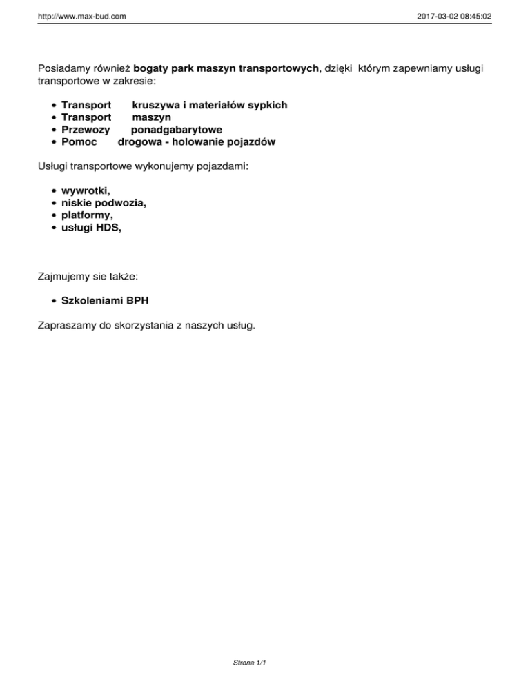 http://www.max-bud.com 2017-03-02 08:45:02 Posiadamy również bogaty park maszyn transportowych, dzięki którym zapewniamy usługi transportowe w zakresie: Transport kruszywa i materiałów sypkich Transport maszyn Przewozy ponadgabarytowe Pomoc drogowa - holowanie pojazdów Usługi transportowe wykonujemy pojazdami: wywrotki, niskie podwozia, platformy, usługi HDS, Zajmujemy sie także: Szkoleniami BPH Zapraszamy do skorzystania z naszych usług. Strona 1/1