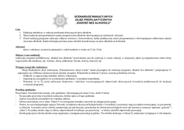 SCENARIUSZ WAKACYJNYCH ZAJÊÆ PROFILAKTYCZNYCH RADOÆ BEZ ALKOHOLU Cele: 1. Edukacja m³odzie¿y w zakresie przekonañ dotycz¹cych picia alkoholu. 2. Wprowadzenie (przypomnienie) zasady niespo¿ywania alkoholu obowi¹zuj¹cej na koloniach i obozach. 3. Przed realizacj¹ programu zalecamy odbycie rozmowy z kierownikiem, kadr¹ dydaktyczn¹ celem przypomnienia o obowi¹zuj¹cym ca³kowitym zakazie u¿ywania alkoholu. Kadra kolonijna powinna jasno okreliæ konsekwencje za picie alkoholu na koloniach. Adresaci: dzieci i m³odzie¿, uczniowie gimnazjów i szkó³ rednich w wieku od 12 do 18 lat. Miejsce i czas realizacji: wakacyjny program profilaktyczny Radoæ bez alkoholu przewidziany jest do realizacji w czasie wakacji, w miejscach, gdzie s¹ zorganizowane ró¿ne formy wypoczynku dla m³odzie¿y, np.: kolonie, obozy, pó³kolonie, biwaki, festyny, koncerty itp. Wstêpne uwagi dla realizatora: Drogi Realizatorze akcji wakacyjnej Pomarañczowa Akcja Letnia zanim przyst¹pisz do realizacji programu Radoæ bez alkoholu, proponujemy Ci zapoznanie siê z kilkoma zamieszczonymi poni¿ej uwagami. Wskazówki te u³atwi¹ Ci pracê i uczyni¹ j¹ bardziej owocn¹. - Podkrel, ¿e zajêcia maj¹ charakter zabawy wakacyjnej. - Zapoznaj siê szczegó³owo ze scenariuszem spotkania i wszystkimi materia³ami. - Pamiêtaj, ¿e to Ty jeste g³ównym ekspertem i udzielasz rozstrzygaj¹cych odpowiedzi dotycz¹cych twierdzeñ poddawanych do dyskusji w naszym programie. Przebieg spotkania: Przywitanie. Przedstawienie tematu, celu spotkania i obowi¹zuj¹cych zasad. Czas: oko³o 9 minut. - Na pocz¹tku przywitaj wszystkich serdecznie, krótko opisz cel tego spotkania. - Zapro wszystkich uczestników do wspólnej zabawy. - Mo¿esz powiedzieæ co o sobie. U³atwi Ci to nawi¹zanie kontaktu i pozwoli na zintegrowanie grupy. - Omów, na czym bêd¹ polega³y zajêcia. Powiedz, ¿e bêdziesz odczytywa³ kolejno ka¿de z 5 twierdzeñ, a uczestnicy maj¹ za zadanie rozstrzygn¹æ, co jest prawd¹, co fa³szem. Uczestnicy przez chwilê zastanawiaj¹ siê nad decyzj¹ i przechodz¹ do dwóch przeciwleg³ych stron sali (mo¿na je oznaczyæ napisami prawda i fa³sz). Po jednej stronie staj¹ ci, którzy odpowiedzieli twierdz¹co, po przeciwnej ci którzy udzielili odpowiedzi przecz¹cej. - Ka¿da grupa przez chwilê okrela swoje argumenty, a nastêpnie prezentuje je g³ono. Trwa krótka dyskusja, w której Ty ostatecznie wystêpujesz w roli eksperta. Treci edukacyjne Element spotkania PRAWDA Twierdzenie nr 1 Napoje alkoholowe sprzedawane w sklepach zawieraj¹ szkodliw¹ substancjê chemiczn¹. Twierdzenie nr 2 Sprzedawca podaj¹cy alkohol osobie niepe³noletniej pope³nia przestêpstwo. Twierdzenie nr 3 Piwo jest mniej szkodliwym alkoholem. Uzasadnienie: 1. Alkohol jest substancj¹ chemiczn¹, która nazywa siê ETANOL (jego wzór chemiczny to C2H5OH) i wystêpuje we wszystkich napojach alkoholowych: piwie, winie, szampanie, wódce i drinkach. Etanol, niezale¿nie w którym z wymienionych napojów wystêpuje, jest zawsze ten sam i dzia³a tak samo: w pó³litrowej puszce piwa jest 29 g ETANOLU; w piêædziesi¹tce wódki jest 20 g ETANOLU; w du¿ym kieliszku wina jest 12 g ETANOLU. 2. ETANOL jest usypiaczem, dzia³a toksycznie, os³abia pracê mózgu i zatruwa biologiczne rodowisko cz³owieka. PRAWDA Uzasadnienie: 1. Polskie prawo zabrania sprzeda¿y alkoholu osobom poni¿ej 18. roku ¿ycia. 2. Ka¿dy kto sprzedaje alkohol osobie niepe³noletniej pope³nia przestêpstwo (okrelone w art. 43 w zwi¹zku z art. 15 ust. 2 ustawy o wychowaniu w trzewoci i przeciwdzia³aniu alkoholizmowi)*. 3. W przypadku w¹tpliwoci co do pe³noletnoci nabywcy sprzedaj¹cy lub podaj¹cy napoje alkoholowe uprawniony jest do ¿¹dania okazania dokumentu stwierdzaj¹cego wiek nabywcy. 4. Za z³amanie prawa i sprzedanie alkoholu osobie niepe³noletniej sprzedawca powinien ponieæ przewidzian¹ ustawowo karê i utraciæ koncesjê na sprzeda¿ alkoholu. FA£SZ Uzasadnienie: 1. Alkohol zawarty w piwie jest taki sam i dzia³a tak samo jak ten w wódce, drinku czy winie, i tak samo szkodzi. 2. Wielu m³odych ludzi nigdy nie zdecydowa³oby siê na wypicie kieliszka wódki, dopuszczaj¹ jednak wypicie butelki piwa, mimo ¿e jest w niej tyle samo alkoholu. 3. W Polsce nie ma piwa bezalkoholowego, to które mo¿esz kupiæ w sklepach zawiera alkohol. Nawet w tym bezalkoholowym jest do 1,5% alkoholu. Uwagi dla realizatora Czas trwania Przeczytaj na g³os twierdzenie nr 1. Pozwól uczestnikom zastanowiæ siê przed udzieleniem odpowiedzi, poczekaj, aby zd¹¿yli zaj¹æ miejsca zgodnie z w³asnym wyborem. Nastêpnie daj czas, aby ka¿da z grup przygotowa³a w³asne argumenty i mog³a przekonywaæ siê wzajemnie. Pamiêtaj, ¿e je¿eli nie wszystko zosta³o powiedziane przez m³odzie¿, Twoim zadaniem jest to dopowiedzieæ, jednoznacznie rozstrzygaj¹c, co jest prawd¹. Zadbaj o to, aby informacje wypisane w rubryce treci edukacyjne zosta³y powiedziane. Je¿eli w trakcie dyskusji kto chcia³by zmieniæ zdanie, jest to mo¿liwe. 5 min. Wa¿ne jest podkrelenie roli sprzedawców w ograniczaniu dostêpnoci alkoholu dla nieletnich. Szczególnie w okresie wakacji ta dostêpnoæ zdecydowanie siê zwiêksza, naszym celem jest wiêc zwrócenie uwagi na ³amanie prawa i niebezpieczeñstwa wynikaj¹ce z tego dla m³odzie¿y. Wyjanij, ¿e sprzeda¿ alkoholu nie dotyczy wy³¹cznie sklepów, ale równie¿ restauracji, pubów, klubów, stanowisk zorganizowanych na koncertach lub w miejscach rekreacji na wolnym powietrzu. 5 min. M³odzi ludzie i doroli w du¿ej mierze maj¹ przekonanie, ¿e piwo nie jest alkoholem. Je¿eli nawet wiedz¹, ¿e jest to alkohol, to nadal s¹ przekonani, ¿e jest on bezpieczny, co jest oczywicie nieporozumieniem. To twierdzenie ma byæ pocz¹tkiem zmiany przekonañ dotycz¹cych piwa. Pozwól uczestnikom na wzajemn¹ wymianê pogl¹dów i ewentualne spory. Po g³osowaniu pamiêtaj o przekazaniu prawid³owej odpowiedzi. 5 min. Treci edukacyjne El