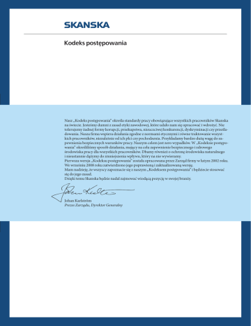 Kodeks postępowania Nasz „Kodeks postępowania” określa standardy pracy obowiązujące wszystkich pracowników Skanska na świecie. Jesteśmy dumni z zasad etyki zawodowej, które udało nam się opracować i wdrożyć. Nie tolerujemy żadnej formy korupcji, przekupstwa, nieuczciwej konkurencji, dyskryminacji czy prześladowania. Nasza firma wspiera działania zgodne z normami etycznymi i równe traktowanie wszystkich pracowników, niezależnie od ich płci czy pochodzenia. Przykładamy bardzo dużą wagę do zapewnienia bezpiecznych warunków pracy. Naszym celem jest zero wypadków. W „Kodeksie postępowania” określiliśmy sposób działania, mający na celu zapewnienie bezpiecznego i zdrowego środowiska pracy dla wszystkich pracowników. Dbamy również o ochronę środowiska naturalnego i nieustannie dążymy do zmniejszenia wpływu, który na nie wywieramy. Pierwsza wersja „Kodeksu postępowania” została opracowana przez Zarząd firmy w lutym 2002 roku. We wrześniu 2008 roku zatwierdzono jego poprawioną i zaktualizowaną wersję. Mam nadzieję, że wszyscy zapoznacie się z naszym „Kodeksem postępowania” i będziecie stosować się do jego zasad. Dzięki temu Skanska będzie nadal zajmować wiodącą pozycję w swojej branży. Johan Karlström Prezes Zarządu, Dyrektor Generalny Kodeks postępowania Zasady ogólne Relacje z pracownikami Głównym celem wszystkich spółek należących do Grupy Skanska (zwanej dalej Skanska) jest prowadzenie rentownej działalności gospodarczej. Zawsze przyjmujemy na siebie odpowiedzialność za nasze działania i wywiązujemy się ze zobowiązań wobec społeczności lokalnych i środowiska, w którym funkcjonujemy, a także wobec pracowników, partnerów i całego społeczeństwa. Dlatego też zdefiniowaliśmy podstawowe zasady naszej działalności: Jedną z podstawowych wartości Skanska są silne i zgodne związki z pracownikami, zbudowane na wzajemnym szacunku i poszanowaniu godności osobistej. Oferowane przez nas warunki pracy muszą spełniać przynamniej minimum wymagań wynikających z prawodawstwa danego kraju oraz konwencji międzynarodowych. • Dążymy do prowadzenia działalności w sposób etyczny i uczciwy. • Przestrzegamy przepisów prawnych obowiązujących w krajach, w których prowadzimy działalność. • Respektujemy postanowienia Deklaracji Praw Człowieka ONZ i przyjmujemy na siebie odpowiedzialność za ich stosowanie w odniesieniu do naszych pracowników oraz środowiska, w którym funkcjonujemy. Obejmuje to również poszanowanie praw mniejszości narodowych. • Zawsze dążymy do otwartego dialogu ze wszystkimi, na których wpływa nasza działalność. Udzielamy odpowiedzi na wszelkie pytania w sposób szybki i rzetelny. • Zapewniamy bezpieczne warunki pracy i dążymy do ich ciągłej poprawy. • Zapewniamy równe traktowanie wszystkich pracowników, niezależnie od rasy, koloru skóry, płci, narodowości, wyznania, pochodzenia etnicznego czy innych wyróżniających cech. Nie akceptujemy jakichkolwiek form dyskryminacji oraz prześladowania w miejscu pracy. • Zapewniamy naszym pracownikom oraz innym osobom związanym ze Skanska możliwość zgłaszania uwag i skarg bez ponoszenia konsekwencji, w sposób gwarantujący ich właściwe rozpatrzenie i podjęcie odpowiednich działań. • Respektujemy prawo pracowników do tworzenia i wstępowania do związków zawodowych zgodnie z przepisami obowiązującymi w danym kraju. • Zapewniamy pracownikom możliwość podnoszenia kwalifikacji i odbywania szkoleń wspierających ich obecne i przyszłe plany zawodowe. Nie zatrudniamy osób poniżej 15 roku życia lub poniżej minimalnej granicy wiekowej wynikającej z przepisów obowiązujących w danym kraju. • Nie korzystamy z pracy przymusowej, niewolniczej czy innych form pracy obowiązkowej. Nie zezwalamy na żadne ograniczenia swobody poruszania się naszych pracowników. Dbamy o to, by nasze projekty, dostawcy, podwykonawcy, przedstawiciele, wspólne przedsięwzięcia i partnerzy również stosowali się do zasad określonych w naszym „Kodeksie postępowania”. Działalność na rynku Odpowiedzialność wobec środowiska Korupcja i działania o charakterze nieuczciwej konkurencji mają niekorzystny wpływ na rynek i gospodarkę oraz rozwój demokratycznego państwa. Skanska zdecydowanie odrzuca stosowanie takich praktyk. Ponieważ wierzymy, że działalność budowlana oraz inne świadczone przez nas usługi mogą w znacznym stopniu przyczynić się do poprawy stanu środowiska naturalnego, stosujemy na wszystkich szczeblach proaktywny sposób zarządzania kwestiami ochrony środowiska. • Nie działamy wbrew obowiązującym przepisom. • Nie proponujemy i nie wręczamy nienależnych gratyfikacji pieniężnych lub innych korzyści majątkowych żadnym osobom lub podmiotom w celu skłonienia ich do działania niezgodnego z ich obowiązkami po to, aby uzyskać korzyści gospodarcze dla Skanska. • Nie akceptujemy i nie zabiegamy o nienależne nam gratyfikacje pieniężne lub inne korzyści majątkowe mające na celu skłonienie nas do działań sprzecznych z zakresem naszych obowiązków. • Wszystkie transakcje finansowe księgujemy zgodnie z Zasadami Rachunkowości obowiązującymi w danym kraju i stosujemy Międzynarodowe Standardy Sprawozdawczości Finansowej oraz procedury i przepisy wewnętrzne. • Wdrożyliśmy standardy kontroli systemów IT zapewniające odpowiedni poziom ochrony danych naszych klientów. • Wprowadziliśmy struktury organizacyjne, systemy zarządzania, procedury oraz plany szkoleniowe zapewniające zgodność naszych działań z obowiązującymi przepisami i normami. • Nasz System Zarządzania Środowiskiem uzyskał certyfikat ISO 14001. Plany działania naszej firmy i procesy wewnętrzne uwzględniają odpowiedzialność kierownictwa liniowego za zagadnienia związane z ochroną środowiska. • W działania mające na celu poprawę stanu środowiska