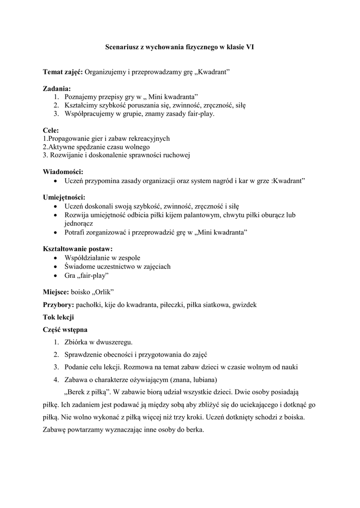 Scenariusz z wychowania fizycznego w klasie VI Temat zajęć: Organizujemy i przeprowadzamy grę „Kwadrant” Zadania: 1. Poznajemy przepisy gry w „ Mini kwadranta” 2. Kształcimy szybkość poruszania się, zwinność, zręczność, siłę 3. Współpracujemy w grupie, znamy zasady fair-play. Cele: 1.Propagowanie gier i zabaw rekreacyjnych 2.Aktywne spędzanie czasu wolnego 3. Rozwijanie i doskonalenie sprawności ruchowej Wiadomości: Uczeń przypomina zasady organizacji oraz system nagród i kar w grze :Kwadrant” Umiejętności: Uczeń doskonali swoją szybkość, zwinność, zręczność i siłę Rozwija umiejętność odbicia piłki kijem palantowym, chwytu piłki oburącz lub jednorącz Potrafi zorganizować i przeprowadzić grę w „Mini kwadranta” Kształtowanie postaw: Współdziałanie w zespole Świadome uczestnictwo w zajęciach Gra „fair-play” Miejsce: boisko „Orlik” Przybory: pachołki, kije do kwadranta, piłeczki, piłka siatkowa, gwizdek Tok lekcji Część wstępna 1. Zbiórka w dwuszeregu. 2. Sprawdzenie obecności i przygotowania do zajęć 3. Podanie celu lekcji. Rozmowa na temat zabaw dzieci w czasie wolnym od nauki 4. Zabawa o charakterze ożywiającym (znana, lubiana) „Berek z piłką”. W zabawie biorą udział wszystkie dzieci. Dwie osoby posiadają piłkę. Ich zadaniem jest podawać ją między sobą aby zbliżyć się do uciekającego i dotknąć go piłką. Nie wolno wykonać z piłką więcej niż trzy kroki. Uczeń dotknięty schodzi z boiska. Zabawę powtarzamy wyznaczając inne osoby do berka. Część przygotowująca Ćwiczenia gimnastyczne: Krążenia ramion w przód, w tył Naprzemienna praca ramion w przód i w tył Skłony tułowia w przód, w bok, skrętoskłony Krążenie bioder, głowy 9(tak-tak, nie-nie) Krok odstawno-dostawny pomiędzy pachołkami Marsz z wysokim unoszeniem nóg Podania i chwyty piłeczki palantowej w czwórkach Podbijanie piłeczki do osoby naprzeciw, prawidłowy chwyt i odrzut w kierunku linii Część główna Gra drużynowa „Kwadrant” Omówienie zasad gry. Wyznaczenie osób do roli sędziego. Podział klasy na dwa zespoły. Jedna drużyna w gnieździe, druga na polu walki. Pierwszy gracz drużyny będącej w gnieździe, wchodzi do półkola i podbija piłkę w taki sposób, aby upadła na pole walki lub poza jej obrębem. Gdy mu się to uda, zostawia palant w półkolach. Sam zaś biegnie po wyznaczonej trasie do momentu usłyszenia gwizdka. Na sygnał musi zatrzymać się przy najbliższym pachołku. Jeśli usłyszy gwizdek w momencie, kiedy znajduje się pomiędzy pachołkami, wraca się do poprzedniego. Jeśli graczowi uda się obiec boisko i wrócić na pole wybijania, zdobywa on punkt dla swojej drużyny. Drużyna w polu ma za zadanie schwycić piłkę i jak najszybciej odrzucić do gniazda. Zmiana pól następuje, gdy: wszyscy gracze drużyny podbijającej podbili piłkę jeden raz lub gracz z drużyny znajdującej się na polu walki schwyci piłkę prawą lub lewą ręką tzw. Kampa. Jeden punkt zdobywa zawodnik, który obiegnie wyznaczone boisko. Dwa punkty – złapanie piłki prawą ręką, trzy – złapanie piłki lewą ręką. Zwycięża drużyna, która zdobędzie większą liczbę punktów. Czas gry – 30 min. Część końcowa. 1. Ćwiczenia uspokajające. Siad skrzyżny, RR w pozycji „skrzydełek”. Dłonie zaciśnięte w pięść, palce wskazujące ustawione pionowo. Wdech nosem ze skrętem głowy w bok, a następnie dmuchnięcie na palec, jakby gasiło się świeczkę. W czasie ćwiczenia powinna być zachowana postawa skorygowana. 2. Omówienie zajęć. Wyróżnienie najlepszych zawodników. Zachęcenie dzieci do aktywności ruchowej na świeżym powietrzu. Opracowała: Elżbieta Siarkowska
