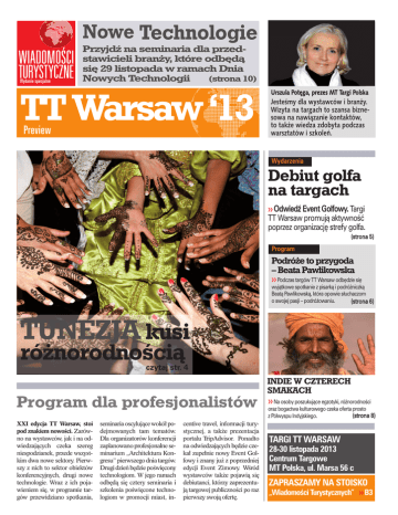 Nowe Technologie Wydanie specjalne Przyjdź na seminaria dla przedstawicieli branży, które odbędą się 29 listopada w ramach Dnia (strona 10) Nowych Technologii TT Warsaw ‘13 Preview Urszula Potęga, prezes MT Targi Polska Jesteśmy dla wystawców i branży. Wizyta na targach to szansa biznesowa na nawiązanie kontaktów, to także wiedza zdobyta podczas warsztatów i szkoleń. Wydarzenia Debiut golfa na targach Odwiedê Event Golfowy. Targi TT Warsaw promujà aktywnoÊç poprzez organizacj´ strefy golfa. (strona 5) Program Podróże to przygoda – Beata Pawlikowska Podczas targów TT Warsaw odb´dzie si´ wyjàtkowe spotkanie z pisarkà i podró˝niczkà Beatà Pawlikowskà, która opowie słuchaczom o swojej pasji – podró˝owaniu. (strona 6) TUNEZJA kusi różnorodnością czytaj str. 4 Program dla profesjonalistów XXI edycja TT Warsaw, stoi pod znakiem nowości. Zarówno na wystawców, jak i na odwiedzających czeka szereg niespodzianek, przede wszystkim dwa nowe sektory. Pierwszy z nich to sektor obiektów konferencyjnych, drugi nowe technologie. Wraz z ich pojawieniem się, w programie targów przewidziano spotkania, seminaria oscylujące wokół podejmowanych tam tematów. Dla organizatorów konferencji zaplanowano profesjonalne seminarium „Architektura Kongresu” pierwszego dnia targów. Drugi dzień będzie poświęcony technologiom. W jego ramach odbędą się cztery seminaria i szkolenia poświęcone technologiom w promocji miast, in- centive travel, informacji turystycznej, a także prezentacja portalu TripAdvisor. Ponadto na odwiedzających będzie czekał zupełnie nowy Event Golfowy i znany już z poprzedniej edycji Event Zimowy. Wśród wystawców także pojawią się debiutanci, którzy zaprezentują targowej publiczności po raz pierwszy swoją ofertę. INDIE W CZTERECH SMAKACH Na osoby poszukujàce egzotyki, ró˝norodnoÊci oraz bogactwa kulturowego czeka oferta prosto (strona 8) z Półwyspu Indyjskiego. TARGI TT WARSAW 28-30 listopada 2013 Centrum Targowe MT Polska, ul. Marsa 56 c ZAPRASZAMY NA STOISKO „Wiadomości Turystycznych” B3 rekomendacje 2013 TT Warsaw Warto inwestować w obecność na targach Krótko Katalog wystawców w nowej formie Tegoroczne targi TT Warsaw odbywajà si´ pod hasłem „Nowych Technologii”. Dlatego organizatorzy postanowili wydaç katalog wystawców w formie elektronicznej. B´dzie on dost´pny ju˝ przed targami na stronie www.ttwarsaw.pl. B´dzie tak˝e rozsyłany drogà elektronicznà. W nowej formie znajdà si´ w nim tradycyjnie: spis bran˝owy oraz wpisy wszystkich wystawców, bioràcych udział w tegorocznej imprezie wraz z numerami stoisk. Targi sà obecne tak˝e w internecie Pełne informacje dla uczestników targów znajdujà si´ na stronie internetowej: www.ttwarsaw.pl. Jest to êródło najÊwie˝szych informacji, aktualizowanych przed i w trakcie trwania wydarzenia. TT Warsaw sà tak˝e obecne w mediach społecznoÊciowych. Targi posiadajà swój fanpage na Facebooku pod adresem: facebook.com/Urlopowicze. Anna Oporska, Wiadomości Turystyczne Najważniejsze warszawskie targi turystyczne TT Warsaw, wkraczają w kolejną dekadę. Tegoroczna, XXI edycja, będzie jednak różnić 2 TT Previev 2013 nie znakomita okazja do spotkań, rozmów biznesowych i towarzyskich, zacieśniania kontaktów i nawiązywania nowych. W końcu to także miejsce konfrontacji oferenta i klienta, popytu i podaży, które obu stronom dostarczają wiedzy i narzędzi do nawiązywania wzajemnych relacji. Obecność tu to inwestycja, która zwraca się zarówno w wymiarze materialnym, jak i niematerialnym. Jednym słowem warszawskie targi turystyczne TT Warsaw to miejsce, gdzie warto być. Targi pod znakiem NOWOŚCI Tegorocznymi targami rozpoczynamy trzecià dekad´ edycji TT Warsaw. Urszula Potęga, prezes MT Targi Polska W Êwiàtecznym klimacie Na miesiàc przed Êwi´tami Bo˝ego Narodzenia targi TT Warsaw odwiedzi prawdziwy Âwi´ty Mikołaj. B´dzie to okazja zarówno dla małych, jak i du˝ych, aby spotkaç si´ ze Êwi´tym. Najmłodsi b´dà mogli napisaç list z proÊbami o choinkowe prezenty i osobiÊcie wr´czyç go Êwi´temu. Mikołaj b´dzie pozował do zdj´ç oraz opowiadał o ˝yciu na Biegunie Północnym. się od poprzednich, przede wszystkim terminem. Po raz pierwszy impreza ma miejsce w listopadzie, a nie we wrześniu jak dotychczas. Ale to nie jedyna nowość jaką przygotowali organizatorzy. Na wystawców i odwiedzających czekają nowe działy, konkursy, wydarzenia i wiele innych atrakcji. Wszystko to potwierdza, że targi ewoluują razem z branżą, aby w pełni odpowiadać na jej potrzeby. TT Warsaw obserwują nowe trendy i nie pozostają wobec nich obojętne. Jednak ponad wszystko targi to niezmien- Uznaliśmy, że powinny to być targi nowości. Tego oczekiwali od nas wystawcy i branża turystyczna. A więc nowy listopadowy termin, udział w targach obiektów konferencyjnych oraz firm zajmujących się nowymi technologiami dla turystyki, wreszcie popularyzacja jednej z aktywności turystycznych. W tym roku proponujemy golf. Nie zabraknie także atrakcji związanych z sezonem świątecznym i zimowym, a także ciekawych prezentacji i spo- Zanim przyjedziesz na TT Warsaw Zarejestruj sie online. Rejestracja przez internet upoważnia do bezpłatnego wstępu na targi. Uczestnicy TT Warsaw, którzy rejestrowali się w zeszłym roku na stronie internetowej mttargionline.pl, mogą zalogować się na swoje konto i zapisać na targi. Rejestracja online na targi, będzie czynna do 26 listopada 2013. Poznaj lokalizację i terminy. Targi odbywają się w warszawskim Centrum Targowo-Kongresowym MT Polska, ul. Marsa 56C, w dniach 28-30 listopada, w godzinach 10.00–17.00. tkań. Zatem na targach będą nowości, ale też nasi wypróbowani od lat wystawcy krajowi i zagraniczni. Zmienia się turystyka, my też chcemy się zmieniać i prezentować to, co jest dzisiaj najciekawsze, najlepsze i najbardziej atrakcyjne w turystyc
