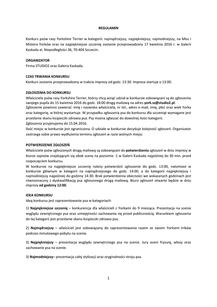 REGULAMIN Konkurs psów rasy Yorkshire Terrier w kategorii: najmądrzejszy, najpiękniejszy, najmodniejszy, na Miss i Mistera Yorków oraz na najpiękniejsze szczenię zostanie przeprowadzony 17 kwietnia 2016 r. w Galerii Kaskada al. Niepodległości 36, 70-404 Szczecin. ORGANIZATOR Firma STUDIO2 oraz Galeria Kaskada. CZAS TRWANIA KONKURSU Konkurs zostanie przeprowadzony w trakcie imprezy od godz. 13:30. Impreza startuje o 13:00. ZGŁOSZENIA DO KONKURSU Właściciele psów rasy Yorkshire Terrier, którzy chcą wziąć udział w konkursie zobowiązani są do zgłoszenia swojego pupila do 15 kwietnia 2016 do godz. 18:00 drogą mailową na adres [email protected]. Zgłoszenie powinno zawierać: imię i nazwisko właściciela, nr tel., adres e-mail, imię, płeć oraz wiek Yorka oraz kategorię, w której wystartuje. W przypadku zgłaszania psa do konkursu dla szczeniąt wymagane jest przesłanie skanu książeczki zdrowia psa. Psy można zgłaszać do dowolnej ilości kategorii. Zgłoszenia przyjmujemy do 15.04.2016. Ilość miejsc w konkursie jest ograniczona. O udziale w konkursie decyduje kolejność zgłoszeń. Organizator zastrzega sobie prawo wydłużenia terminu zgłoszeń w razie wolnych miejsc POTWIERDZENIE ZGŁOSZEŃ Właściciele psów zgłoszonych drogą mailową są zobowiązani do potwierdzenia zgłoszeń w dniu imprezy w biurze zapisów znajdującym się obok sceny na poziomie -1 w Galerii Kaskada najpóźniej do 30 min. przed rozpoczęciem konkursu. W konkursie na najpiękniejsze szczenię należy potwierdzić zgłoszenie do godz. 13:00, natomiast w konkursie głównym w kategorii na najmądrzejszego do godz. 14:00, a do kategorii najpiękniejszy i najmodniejszy najpóźniej do godziny 14:30. Brak potwierdzenia obecności we wskazanych godzinach jest równoznaczny z dyskwalifikacją psa zgłoszonego drogą mailową. Biuro zgłoszeń otwarte będzie w dniu imprezy od godziny 12:00. IDEA KONKURSU Ideą konkursu jest zaprezentowanie psa w kategoriach: 1) Najpiękniejsze szczenię – konkurencja dla właścicieli z Yorkami do 9 miesiąca. Prezentacja na scenie wyglądu zewnętrznego psa oraz umiejętności zachowania się przed publicznością. Warunkiem zgłoszenia do tej kategorii jest przesłanie skanu książeczki zdrowia psa. 2) Najmądrzejszy – właściciel jest zobowiązany do zaprezentowania razem ze swoim Yorkiem trików podczas minutowego pobytu na scenie. 3) Najpiękniejszy – prezentacja wyglądu zewnętrznego psa na scenie. Jury oceni fryzurę, włosy oraz zachowanie psa na scenie. 3) Najmodniejszy– prezentacja całej stylizacji oraz oryginalności stroju psa. 1 Konkurencją dodatkową jest wybór Miss i Mistera. Jury po zaprezentowaniu psów w konkurencjach na najpiękniejszego, najmodniejszego i najmądrzejszego Yorka spośród finalistów tych konkurencji, wyłoni Miss i Mistera imprezy. KRYTERIA OCENY Jury będzie oceniało psy według podanych kryteriów: Kryteria oceny Yorków w kategorii „Najpiękniejsze szczenię” to: • wygląd zewnętrzny • posłuszeństwo wobec właściciela • zachowanie przed publicznością Kryteria oceny yorków w kategorii „Najmądrzejszy” to: • zaprezentowane sztuczki; • aktywność psa; • zachowanie na wybiegu; • współpraca z właścicielem. Kryteria oceny yorków w kategorii „Najpiękniejszy” to: • prezencja; • wygląd zewnętrzny; • zachowanie na wybiegu; • stylizacja; • fryzura. Kryteria oceny yorków w kategorii „Najmodniejszy” to: • wygląd zewnętrzny; • strój; • zachowanie na wybiegu; • zaangażowanie właściciela. Kryteria oceny yorków w wyborze Miss i Mistera to: • suma osiągnięć w kategoriach: najpiękniejszy, najmodniejszy, najmądrzejszy; • dodatkowe głosowanie jury • prezentacja i urok Finaliści wszystkich konkurencji są zobowiązani do pozostania do końca imprezy. NAGRODY W KONKURSIE Nagrody dla czworonogów i ich właścicieli zostały ufundowane przez sponsorów imprezy. W konkursie dla szczeniąt zostanie wyłoniona tylko jedna nagroda główna. W trzech konkurencjach zostaną wyłonieni zwycięzcy, bez podziału na płeć (po trzy nagrody w kategorii najmodniejszy, najpiękniejszy i najmądrzejszy). Po zaprezentowaniu psów w kategoriach (najmodniejszy, najpiękniejszy, najmądrzejszy) zostaną wyłonieni Miss i Mister Yorków (po jednej nagrodzie dla Miss i Mistera). Pierwszych sześćdziesiąt Yorków zapisanych do konkursu otrzyma upominki i pamiątkowe rozety. 2 UCZESTNICY KONKURSU Uczestnikiem konkursu może być każdy pies rasy yorkshire terrier, który zgłoszony będzie zgodnie z podanym terminem zgłoszeń. O dopuszczeniu psa do konkursu decyduje jury. W dniu konkursu właściciel zobowiązany jest do przyniesienia karty szczepień (ewentualnie książeczki zdrowia psa). Impreza ma charakter rozrywkowy, nie wystawowy. Konkurs jest otwarty zarówno dla psów z rodowodem jak i bez rodowodu. Każdy piesek musi być prowadzony na smyczy, należy zachować ostrożność ze względu na bezpieczeństwo innych osób na terenie Galerii Kaskada. Każdy właściciel jest zobowiązany do sprzątania po swoim psie. Uczestnik pokrywa wszelkie koszty związane z przygotowaniem psa do pokazu oraz koszty przyjazdu. OGŁOSZENIE WYNIKÓW Ogłoszenie wyników odbędzie się bezpośrednio po prezentacji w każdej kategorii po obradach jury. Decyzje jury są ostateczne. Wyniki konkursów nie podlegają reklamacji. Ogłoszenie tytułu „Miss i Mistera Yorków” odbędzie się po zakończeniu wszystkich konkurencji konkursowych. Finaliści wszystkich konkurencji są zobowiązani do pozostania do końca imprezy. Odbiór nagrody odbywa się wyłącznie w momencie uroczystego ogłoszenia zwycięzców i ceremonii wręczenia nagród. W przypadku nieobecności podczas ceremonii, nagroda przepada. KOMISJA KONKURSU Skład komisji konkursowej ogłoszony będzie przed konkursem. POSTANOWIENIA KOŃCOWE 1. Organizator zastrzega sobie prawo wydłużenia terminu zgłosze
