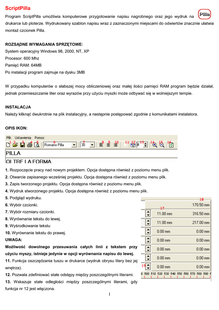 ScriptPilla Program ScriptPilla umoŜliwia komputerowe przygotowanie napisu nagrobnego oraz jego wydruk na drukarce lub ploterze. Wydrukowany szablon napisu wraz z zaznaczonymi miejscami do odwiertów znacznie ułatwia montaŜ czcionek Pilla. ROZSĄDNE WYMAGANIA SPRZĘTOWE: System operacyjny Windows 98, 2000, NT, XP Procesor: 600 Mhz Pamięć RAM: 64MB Po instalacji program zajmuje na dysku 3MB W przypadku komputerów o słabszej mocy obliczeniowej oraz małej ilości pamięci RAM program będzie działał, jednak przemieszczanie liter oraz wyrazów przy uŜyciu myszki moŜe odbywać się w wolniejszym tempie. INSTALACJA NaleŜy kliknąć dwukrotnie na plik instalacyjny, a następnie postępować zgodnie z komunikatami instalatora. OPIS IKON: 1. Rozpoczęcie pracy nad nowym projektem. Opcja dostępna równieŜ z poziomu menu plik. 2. Otwarcie zapisanego wcześniej projektu. Opcja dostępna równieŜ z poziomu menu plik. 3. Zapis tworzonego projektu. Opcja dostępna równieŜ z poziomu menu plik. 4. Wydruk stworzonego projektu. Opcja dostępna równieŜ z poziomu menu plik. 5. Podgląd wydruku. 6. Wybór czcionki. 7. Wybór rozmiaru czcionki. 8. Wyrównanie tekstu do lewej. 9. Wyśrodkowanie tekstu 10. Wyrównanie tekstu do prawej. UWAGA: MoŜliwość dowolnego przesuwania całych linii z tekstem przy uŜyciu myszy, istnieje jedynie w opcji wyrównania napisu do lewej. 11. Funkcja oszczędzania tuszu w drukarce (wydruk obrysu litery bez jej wnętrza). 12. Pozwala zdefiniować stałe odstępy między poszczególnymi literami. 13. Wskazuje stałe odległości między poszczególnymi literami, gdy funkcja nr 12 jest włączona. 1 14. Powiększenie napisu w oknie podglądu. 15. Zmniejszenie napisu w oknie podglądu. 16. Powrót odległości między czcionkami do wartości domyślnych. 17. Wskazuje odległość danej linii z wpisywanym tekstem od linii znajdującej się nad nią. 18. Pokazuje szerokość napisu znajdującego się w danej linii. 19. Suwak zmiany odległości między poszczególnymi liniami. 20. Wskazuje łączną wysokość stworzonego napisu. MENU USTAWIENIA 1. UmoŜliwia zmianę takich ustawień jak wybór drukarki, rozmiaru papieru. Wskazany druk w orientacji poziomej. 2. UmoŜliwia wydruk samych zaznaczeń do odwiertów bez liter. Opcja pozwala na dodatkową oszczędność tuszu. Szczególnie przydatna w przypadku uŜycia plotera. 3. Drukuje pionową oś symetrii stworzonego napisu, dzięki czemu moŜliwe jest dokładne ustawienie napisu na płycie nagrobnej. 4. W przypadku połączenia z internetem informuje uŜytkownika o dostępności nowej wersji programu i umoŜliwia jej pobranie. OKNO PODGLĄDU Okno podglądu prezentuje aktualny podgląd stworzonego napisu. Litery oraz całe wyrazy moŜna przemieszczać chwytając je lewym klawiszem myszy, a następnie przesuwając w poŜądane miejsce. WSKAZÓWKI DOTYCZĄCE UśYTKOWANIA PROGRAMU 1. Aby uzyskać Ŝądane odległości między literami naleŜy najpierw ustalić stałe odstępy między literami przy uŜyciu funkcji nr 12 oraz 13 (ikony na górze ekranu), a następnie dostosować odległości (według własnych preferencji) poruszając myszką poszczególne części napisu. W razie potrzeby zwiększenia precyzji w ustawianiu liter myszką, naleŜy powiększyć litery w oknie poglądu przy uŜyciu opcji nr 14 oraz 15 2 . 2. W programie dostępna jest opcja tzw. schowka windows. Przy uŜyciu klawiszy CTRL+C moŜna skopiować dowolną część napisu (równieŜ z innego pliku np. Word), a następnie wkleić ją w okno tworzenia napisu przy uŜyciu klawiszy CTRL+V. Przykład: Zaznaczamy w wordzie kursorem fragment tekstu, naciskamy klawisze CTRL+V. Następnie przechodzimy do okna programu ScriptPilla, klikamy kursorem w wybraną linię do wpisywania tekstu i naciskamy klawisze CTRL+V jednocześnie. Zaznaczona część napisu ulegnie przeniesieniu do programu ScriptPilla. 3. Po wpisaniu napisu w okno tekstowe moŜna zmienić rozmiar wpisanych liter. NaleŜy zaznaczyć kursorem część napisu, którego rozmiar ma być zmieniony, a następnie wybrać Ŝądany rozmiar przy uŜyciu opcji nr 7 4. Aby zmienić odległości między poszczególnymi liniami naleŜy uŜyć suwaka nr 19 . . Wartość odległości po prawej stronie ulegnie zmianie. 5. MoŜliwość dowolnego przesuwania całych linii z tekstem istnieje jedynie w opcji wyrównania napisu do lewej. 6. Jeśli po naciśnięciu znaku na klawiaturze nie wyświetla się on na ekranie, oznacza to, iŜ w wybranym rozmiarze znak nie istnieje. NaleŜy zmienić rozmiar czcionki i ponownie wybrać Ŝądany znak. 7. Jeśli wydruki z Państwa drukarki nie odzwierciedlają rzeczywistych odległości bolców, moŜe oznaczać to nieprawidłową konfigurację drukarki. Aby sprawdzić poprawność konfiguracji naleŜy wykonać wydruk próbny i zmierzyć linijką pasek „linijki” znajdujący się u góry wydrukowanej strony. Jego rozmiar (np. na odległości 20cm) powinien pokrywać się z tą samą długością na linijce. 8. Przed dokonaniem odwiertów naleŜy upewnić się, czy wydruk został wykonany w sposób prawidłowy. 9. W przypadku błędów w przesuwaniu lub wyświetlaniu napisu naleŜy klikniąć opcję odświeŜ (nr 16). W razie uwag technicznych oraz problemów w działaniu programu prosimy o informacje pod adresem [email protected] lub kontakt telefoniczny pod nr 46 814 30 23. Licencja uŜytkownika 1.ScriptPilla jest programem bezpłatnym. MoŜe być kopiowany, rozpowszechniany oraz uŜytkowany na dowolnej liczbie stanowisk bez zgody firmy Pilla S.r.l. 2. Firma Pilla S.r.l. nie ponosi odpowiedzialności za wszelkie szkody wynikłe na skutek uŜytkowania niniejszego oprogramowania. 3. Wszelkie zmiany w kodzie programu są zabronione. 4. Instalacja programu ScriptPilla oznacza akceptację warunków licencji. 3