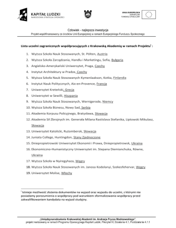 Lista uczelni zagranicznych współpracujących z Krakowską Akademią w ramach Projektui : 1. Wyższa Szkoła Nauk Stosowanych, St. Pölten, Austria 2. Wyższa Szkoła Zarządzania, Handlu i Marketingu, Sofia, Bułgaria 3. Angielsko-Amerykański Uniwersytet, Praga, Czechy 4. Instytut Architektury w Pradze, Czechy 5. Wyższa Szkoła Nauk Stosowanych Kymenlaakson, Kotka, Finlandia 6. Instytut Nauk Politycznych, Aix-en-Provence, Francja 7. Uniwersytet Kreteński, Grecja 8. Uniwersytet w Sewilli, Hiszpania 9. Wyższa Szkoła Nauk Stosowanych, Wernigerode, Niemcy 10. Wyższa Szkoła Biznesu, Nowy Sad, Serbia 11. Akademia Korpusu Policyjnego, Bratysława, Słowacja 12. Akademia Sił Zbrojnych im. Generała Milana Rastislava Stefanika, Liptowski Mikulasz, Słowacja 13. Uniwersytet Katolicki, Rużomberok, Słowacja 14. Juniata College, Huntingdon, Stany Zjednoczone 15. Dniepropietrowski Uniwersytet Ekonomii i Prawa, Dniepropietrowsk, Ukraina 16. Ekonomiczno-Humanistyczny Uniwersytet im. Stepana Diemianchuka, Równe, Ukraina 17. Wyższa Szkoła w Nyiregyhaza, Węgry 18. Wyższa Szkoła Nauk Stosowanych im. Janosa Kodolanyi, Szekesfehervar, Węgry 19. Uniwersytet Molise, Włochy i Istnieje możliwość złożenia dokumentów na wyjazd oraz wyjazdu do uczelni, z którymi nie posiadamy porozumienia o współpracy pod warunkiem sformalizowania współpracy przed zakwalifikowaniem kandydata na wyjazd studyjny.