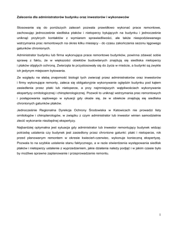 Zalecenia dla administratorów budynku oraz inwestorów i wykonawców Stosowanie się do poniższych zaleceń pozwala prawidłowo wykonać prace remontowe, zachowując jednocześnie siedliska ptaków i nietoperzy bytujących na budynku i jednocześnie uniknąć przykrych kontaktów z wymiarem sprawiedliwości, ale także niespodziewanego wstrzymania prac remontowych na okres kilku miesięcy - do czasu zakończenia sezonu lęgowego gatunków chronionych. Administrator budynku lub firma wykonująca prace remontowe budynków, powinna zdawać sobie sprawę z faktu, że w większości obiektów budowlanych znajdują się siedliska nietoperzy i ptaków objętych ochroną. Zwierzęta te przystosowały się do życia w mieście, a budynki są zwykle ich jedynym miejscem bytowania. Ze względu na słabą znajomość biologii tych zwierząt przez administratorów oraz inwestorów i firmy wykonujące remonty, zaleca się obligatoryjnie wykonywanie oględzin budynku pod kątem zasiedlenia przez ptaki lub nietoperze, a przy najmniejszych wątpliwościach wykonywanie ekspertyzy ornitologicznej i chiropterologicznej. Pozwoli to uniknąć wstrzymania prac remontowych i postępowania sądowego w sytuacji gdy okaże się, że w obiekcie znajdują się siedliska chronionych gatunków ptaków. Jednocześnie Regionalna Dyrekcja Ochrony Środowiska w Katowicach nie prowadzi listy ornitologów i chiropterologów, w związku z czym administrator lub inwestor winien samodzielnie zlecić wykonanie niezbędnej ekspertyzy. Najbardziej optymalna jest sytuacja gdy administrator lub inwestor remontujący budynek widząc potrzebę ustalenia czy budynek jest zasiedlony przez chronione gatunki: ptaki i nietoperze, rok przed planowanym remontem w okresie kwiecień-czerwiec, wykonuje konieczną ekspertyzę. Pozwala to na szybkie ustalenie stanu faktycznego, a w razie stwierdzenia występowania siedlisk ptaków i nietoperzy ustalenie z wyprzedzeniem, jakie działania należy podjąć i w jakim czasie było by możliwe sprawne zaplanowanie i przeprowadzenie remontu. 1 Harmonogram przygotowania obiektu do remontu w sytuacji gdy mogą w nim znajdować się lub znajdują się siedliska chronionych gatunków ptaków. Rok kalendarzowy przed rokiem planowanego remontu Marzec - ustalenie przewidywanego harmonogramu czasowego remontu w przyszłym roku; - ustalenie czy stropodach budynku będzie ocieplany i jakim rodzajem materiału; - jeśli stropodach będzie ocieplany materiałami wtłaczanymi do stropodachu takimi jak fibra celulozowa, granulat wełny mineralnej lub granulat styropianu, to konieczne jest uniemożliwienie ptakom dostępu do stropodachu - zakratowanie otworów wentylacyjnych; - ustalenie czy przewiduje się zamkniecie okienek strychowych lub zamkniecie otworów w stropodachu; - ustalenie czy w budynku (wolne przestrzenie między płytami, stropodach itp.) nie zimują nietoperze, Jeśli planowane jest zamknięcie dostępu ptaków do stropodachu (na ogół zakratowanie otworów wentylacyjnych), to konieczne będzie podjęcie działań kompensacji przyrodniczej w postaci wywieszenia obok otworów wentylacyjnych budek lęgowych dla ptaków, których liczbę ustali ornitolog, na podstawie oględzin obiektów; - uzgodnienie z ornitologiem i chiropterologiem terminów sprawdzenia obiektu pod kątem występowania siedlisk ptaków. Kwiecień - zapoznanie ornitologa z zakresem i harmonogramem planowanego remontu obiektu; - sprawdzenie obiektu pod kątem występowania siedlisk ptaków, m.in.: szczeliny dylatacyjne, szczeliny miedzy płytami, ubytki cegieł, otwory technologiczne, szczeliny za rynnami, szczeliny pod parapetami okiennymi, otwory wentylacyjne w stropodachu, inne otwory do strychów i stropodachu – to miejsca zasiedlane przez wróbla domowego, szpaka, kopciuszka, sikory bogatki, sikory modrej (modraszki), kawki, gołębie miejskie, czasami pustułki; półki, gzymsy, duże wnęki, czasami wnęki balkonowe, parapety okien niedostępnych (często są to parapety okien w klatkach schodowych) - to miejsca wybierane na założenie gniazda przez gołębie miejskie, pustułki, czasami kosa, sierpówkę i gołębia grzywacza; pnącza na elewacji budynku, czasami także niektóre wnęki balkonowe - to miejsca chętnie wybierane przez kosy, sierpówki, czasami dzwońce, kulczyki, szczygły, muchołówki szare, kopciuszki; - wskazane jest sprawdzenie stropodachów jeśli jest to tylko możliwe (często nie ma do nich w ogóle dostępu lub są zbyt niskie by łatwo dokonać ich przeglądu), natomiast strychy należy 2 sprawdzać bardzo dokładnie, gdyż mogą być zasiedlone przez gołębie miejskie, kopciuszki, wróble, sowy i czasami nietoperze; Czasami nawet pobieżne zajrzenie przez właz do stropodachu pozwala na stwierdzenie, że jest on zasiedlony przez gołębie miejskie. Zdarza się, że ptaki nie mają dostępu do strychu lub stropodachu gdyż są one np. od dawna zamknięte (zamknięte włazy, okienka, otwory w stropodachu), ale po wejściu na dach okazuje się, że w znajdujących się na nim przybudówkach, kominach znajdują się szczeliny niewidoczne z poziomu parteru, umożliwiające wejście do tych pomieszczeń strychowych, a czasami po prostu właz do stropodachu lub strychu znajdujący się na dachu budynku zostanie odsunięty przez silny wiatr, co umożliwia zasiedlenie przez ptaki pomieszczenia strychowego. W takiej sytuacji, taki właz można zamknąć dopiero wtedy gdy mamy pewność, że na strychu lub w stropodachu nie przebywają ptaki lub znajdują się gniazda z jajami lub pisklętami. Wywiad z użytkownikami obiektu - warto zapytać czy i jakie ptaki gnieżdżą się w budynku portierów, pracowników ochrony, mieszkańców. Co prawda zebrane w ten sposób informacje należy traktować wyłącznie jako wskazówka, gdyż często osoby te twierdzą, że nie obserwowały tu żadnego ptaka, a w tym samym czasie obserwujemy np. jerzyka wlatującego do stropodachu. Najczęściej jednak informacje ta