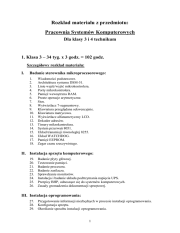 Rozkład materiału z przedmiotu: Pracownia Systemów Komputerowych Dla klasy 3 i 4 technikum 1. Klasa 3 – 34 tyg. x 3 godz. = 102 godz. Szczegółowy rozkład materiału: I. Badanie sterownika mikroprocesorowego: 1. 2. 3. 4. 5. 6. 7. 8. 9. 10. 11. 12. 13. 14. 15. 16. 17. 18. Wiadomości podstawowe. Architektura systemu DSM-51. Linie wejść/wyjść mikrokontrolera. Porty mikrokontrolera. Pamięć wewnętrzna RAM. Proste operacje arytmetyczne. Stos. Wyświetlacz 7-segmentowy. Klawiatura przeglądana sekwencyjnie. Klawiatura matrycowa. Wyświetlacz alfanumeryczny LCD. Dekoder adresów. Timery mikrokontrolera. System przerwań 8051. Układ transmisji równoległej 8255. Układ WATCHDOG. Pamięć EEPROM. Zegar czasu rzeczywistego. II. Instalacja sprzętu komputerowego: 19. 20. 21. 22. 23. 24. 25. 26. Badanie płyty głównej. Testowanie pamięci. Badanie procesora. Badanie zasilacza. Sprawdzanie monitorów. Instalacja i badanie układu podtrzymania napięcia UPS. Przepisy BHP, odnoszące się do systemów komputerowych. Zasady gromadzenia dokumentacji sprzętowej. III. Instalacja oprogramowania: 27. 28. 29. Przygotowanie informacji niezbędnych w procesie instalacji oprogramowania. Konfiguracja sprzętu. Określanie sposobu instalacji oprogramowania. 1 30. 31. 32. 33. Instalacja sieciowa oprogramowania. Uaktualnianie oprogramowania. Inwentaryzacja oprogramowania. Sprawdzanie legalności zainstalowanego oprogramowania, audyt. IV. Obsługa urządzeń peryferyjnych: 34. 35. 36. 37. 38. 39. 40. 41. 42. V. Badanie działania klawiatury. Badanie urządzeń wskazujących, myszy, trackballe. Badanie kart graficznych. Tryby pracy kart graficznych i monitorów. Programowa zmiana trybów pracy. Przystosowanie urządzeń peryferyjnych i systemu dla potrzeb użytkownika. Znaki narodowe. Profile użytkownika. Wspomaganie pracy użytkowników niepełnosprawnych. Urządzenia prezentacji danych: 43. 44. 45. 46. 47. Badanie drukarki igłowej. Badanie drukarki atramentowej. Badanie drukarki laserowej. Ploter, konfiguracja, działanie. Badanie specjalizowanych systemów graficznych. VI. Instalacja i konfiguracja systemów WINDOWS: 48. 49. 50. 51. 52. 53. 54. 55. 56. 57. 58. 59. 60. 61. 62. 63. 64. 65. 66. 67. 68. 69. 70. Rodziny systemów operacyjnych Windows opartych na technologii NT. Wielozadaniowość, wielodostępność, wieloprocesorowość. Obsługa pamięci. NTFS. Instalacja usług terminalowych. Instalacja zdalna. Instalacja nienadzorowana. Logowanie do Windows. Badanie cech grupy roboczej. Domena, drzewo domen, las domen. Cechy domeny i Aktywnego Kataloqu. Uwierzytelnianie użytkowników i komputerów. Kontrolowany dostęp. Scentralizowane zarządzanie. Jednostki organizacyjne. Lokalizowanie informacji. Skalowalność. Zadania administracyjne. Harmonogram zadań. Narzędzia administracyjne. Dziennik zdarzeń. Menedżer zadań. Monitor systemu. 2 71. 72. 73. 74. 75. 76. 77. 78. 79. 80. 81. 82. 83. 84. 85. 86. 87. 88. 89. 90. 91. 92. 93. 94. 95. 96. 97. 98. 99. 100. 101. 102. Optymalizacja wydajności. Zasady zabezpieczeń. Konta użytkowników, lokalne, i domenowe. Grupy użytkowników. Prawa użytkowników. Uprawnienia NTFS: do plików, do folderów. Uprawnienia do drukarek i innych obiektów. Zasady tworzenia nowych kont użytkowników. Zarządzanie kontami lokalnymi. Zarządzanie kontami domenowymi. Profile użytkownika. Grupy użytkowników w środowisku. Grupy lokalne. Typy i zasięg grup domenowych. Wbudowane i predefiniowane domenowe grupy lokalne i globalne. Strategia wykorzystania grup. Uprawnienia NTFS do folderów i plików. Uprawnienia specjalne NTFS. Kompresja danych na partycjach NTFS. Przydziały dyskowe. Zabezpieczanie danych przy użyciu EFS (Encrypting File System). Publikowanie udostępnionych folderów w usłudze Active Directory. System DFS (Distributed File System). Usługa drukowania w systemie Windows. Uprawnienia do drukarek. Drukowanie w Internecie. Partycje na dyskach podstawowych. Woluminy na dyskach dynamicznych. Podstawowe zadania związane z zarządzaniem dyskami. Serwer plików. Serwer wydruku. Serwer sieci Web. Serwery DNS, WINS oraz DHCP. 3 2. Klasa 4 – 30 tyg. x 4 godz. = 120 godz. Szczegółowy rozkład materiału: I. Tworzenie serwerów UNIX/LINUX: 1. 2. 3. 4. 5. 6. 7. 8. 9. 10. 11. 12. 13. 14. 15. 16. 17. 18. 19. 20. 21. 22. 23. 24. 25. 26. 27. 28. 29. 30. 31. 32. 33. 34. Podstawowe informacje o systemie Unix/Unux. Operacje na plikach i katalogach. Nadzorowanie uprawnień plików. Praca w sieci. Podstawowe czynności administracyjne. Zarządzanie uprawnieniami do plików i katalogów. Wykonywanie podstawowych czynności administracyjnych. Instalacja i konfiguracja serwera Unix/Linux. Przygotowanie dysku twardego. Partycje i systemy plików. Interfejs programu instalacyjnego. Przebieg instalacji. Wybór sposobu startowania systemu. Konfiguracja karty sieciowej. Ustawienia protokołu TCP/IP. Moduły jądra. Konfiguracja i kompilacja jądra. Sprawdzanie systemu plików (fsck, e2fsck). Instalacja, aktualizacja, deinstalacja, pakietów. Weryfikacja zainstalowanych pakietów. Przynależność plików. Instalacja z kompilacją. Demony sieciowe. Telnet - zdalny dostęp do serwera. FTP (File Transfer Protocol). Finger - informacje o użytkownikach. SMTP - dostarczanie i odbieranie poczty. Usługa POP - poczta kurierska. Samba -współpraca z siecią Windows. IP Masquerading. Porty, przerwania, urządzenia. Firewalle programowe. Obsługiwane drukarki. Urządzenia dotyczące drukarki w jądrze. System Ipd. Bezpieczeństwo systemu operacyjnego. Logi systemowe. Konie trojańskie. Bezpieczeństwo pracy sieciowej. Firewall - zapora sieciowa. Narzędzia wspomagające nadzór sieci. Zapobieganie włamaniom. Szyfrowanie danych. Prywatne kanały danych VPN. 4 II. Programowanie w asemblerze i języku C: 35. 36. 37. 38. 39. 40. 41. 42. 43. 44. 45. 46. 47. 48. 49. 50. 51. 52. 53. 54. Składnia asemblera w systemie WINDOWS i LINUX. Kompilacja programów. Programy exe, i com. Zasady 