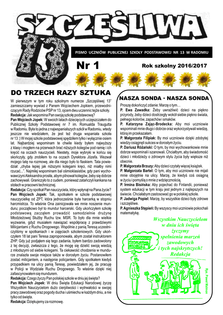 PISMO UCZNIÓW PUBLICZNEJ SZKOŁY PODSTAWOWEJ NR 13 W RADOMIU Nr 1 DO TRZECH RAZY SZTUKA NASZA SONDA • NASZA SONDA Proszę dokończyć zdanie: Marzę o tym… P. Ewa Zawadka: Żeby uwrażliwić dzieci na piękno przyrody, żeby dzieci dostrzegły wokół siebie piękno świata, pełnego kolorów, zapachów i smaków. P. Katarzyna Zając-Brodecka: Aby moi uczniowie wspominali mnie długo i dobrze oraz wykorzystywali wiedzę, którą im przekazałam. P. Małgorzata Filipiak: By moi uczniowie dzięki zdobytej wiedzy osiągnęli sukces w dorosłym życiu. P. Dariusz Różański: O tym, by moi wychowankowie mnie dobrze wspominali i szanowali. Chciałbym, aby świadomość dzieci i młodzieży o zdrowym stylu życia były większe niż obecnie. P. Małgorzata Brzuzy: Aby dzieci czytały więcej książek. P. Małgorzata Bartel: O tym, aby moi uczniowie nie mijali mnie obojętnie na ulicy. Marzę, że kiedyś coś osiągną w życiu i pomyślą o mnie z wdzięcznością. P. Irmina Bisińska: Aby pojechać do Finlandii, ponieważ system edukacji w tym kraju jest jednym z najlepszych na świecie. Chciałabym zastosować go w polskiej szkole. P. Jadwiga Popiel: Marzę, by wszystkie dzieci były zdrowe i szczęśliwe. P. Agnieszka Stępień: By wszyscy moi uczniowie pokochali matematykę. Wszystkim Nauczycielom w dniu ich święta życzymy spełnienia marzeń zawodowych i tych najskrytszych! Redakcja Rys. Paweł Malmon W pierwszym w tym roku szkolnym numerze „Szczęśliwej 13” zamieszczamy wywiad z Panem Wojciechem Jopkiem, przewodniczącym Rady Rodziców PSP nr 13, ojcem dwu uczennic tejże szkoły. Redakcja: Jak wspomina Pan swoją szkołę podstawową? Pan Wojciech Jopek: W swoich latach dziecięcych uczęszczałem do Publicznej Szkoły Podstawowej nr 7 im. Romualda Traugutta w Radomiu. Była to jedna z najwspanialszych szkół w Radomiu, wtedy jeszcze nie wiedziałem, że jest też druga wspaniała szkoła nr 13 :) W mojej szkole podstawowej spędziłem tylko i wyłącznie osiem lat. Najbardziej wspominam te chwile kiedy byłem najwyższy z klasy i mogłem na przerwach brać niższych kolegów pod ramię i ich kręcić na oczach nauczycieli. Niestety, moje wybryki w końcu się skończyły, gdy zrobiłem to na oczach Dyrektora Józefa. Wezwał mojego tatę na rozmowę, ale dla niego było to fiaskiem. Tata powiedział: „chyba lepiej jak niższymi kolegami kręci, niż miałby nimi rzucać...”. Najmilej wspominam bal ośmioklasistów, gdy pani wychowawczyni Aleksandra prosiła, abym pilnował kolegów, żeby się dobrze zachowywali. Graniczyło to z cudem, ponieważ zatańczyli kankana na stołach w pracowni technicznej. Redakcja: Czy spotkał Pan nauczyciela, który wpłynął na Pana życie? Pan Wojciech Jopek: Tak, spotkałem w szkole podstawowej nauczycielkę od ZPT, która jednocześnie była harcerką w stopniu harcmistrza. To właśnie Ona zainicjowała we mnie noszenie munduru; początkowo był to mundur harcerski. Gdy ukończyłem szkołę podstawową zacząłem prowadzić samodzielnie drużynę Młodzieżowej Służby Ruchu tzw. MSR. To było dla mnie wielkie wyzwanie, gdyż musiałem nawiązać współpracę z prawdziwymi Milicjantami z Ruchu Drogowego. Wspólnie z panią Teresą uczestniczyliśmy w spotkaniach i w zajęciach szkoleniowych. Gdy ukończyłem 18 lat pani Teresa zaproponowała, abym został instruktorem ZHP. Gdy już podjąłem się tego zadania, byłem bardzo zadowolony z tej decyzji, zwłaszcza z tego, że mogę się dzielić swoją wiedzą z młodszymi od siebie kolegami. Ta ciekawość chodzenia w mundurze znalazła swoje miejsce także w dorosłym życiu. Postanowiłem zostać milicjantem, a następnie policjantem. Gdy spotkałem kiedyś przypadkiem na ulicy panią Teresę, powiedziałem jej, że pracuję w Policji w Wydziale Ruchu Drogowego. To właśnie dzięki niej zafascynowałem się mundurem. Redakcja: Czego życzy Pan polskiej szkole w dniu jej święta? Pan Wojciech Jopek: W dniu Święta Edukacji Narodowej życzę Wszystkim Nauczycielom dużo cierpliwości i wytrwałości w swojej pracy zawodowej oraz pogody ducha i uśmiechu w każdym dniu, a nie tylko od święta. Redakcja: Dziękujemy za rozmowę. Rok szkolny 2016/2017 EUROPEJSKI DZIEŃ JĘZYKÓW OBCYCH 27 września 2016 r. nasza klasa, wraz z panią wychowawczynią I. Bisińską, została zaproszona do gimnazjum językowego na Europejski Dzień Języków Obcych. Tam mieliśmy poznać kulturę Francji i Kanady oraz niektóre zwroty w języku francuskim oraz angielskim. O godzinie 9:30 zebraliśmy się przed szkołą. Pani wychowawczyni sprawdziła, czy wszyscy są, po czym udaliśmy się w stronę gimnazjum. W szkole serdecznie powitali nas uczniowie oraz organizatorzy imprezy, a także Pani Dyrektor Anna Maciejewska . Potem usłyszeliśmy piosenki w języku angielskim i francuskim. Były też prezentacja mody francuskiej oraz tańce. Wszystko wypadło świetnie, więc pani zaprosiła nas do perfumerii, gdzie nie tylko mogliśmy sprawdzić zapach perfum, ale dowiedzieć się, jakie zioła są wykorzystywane do ich produkcji i jak przygotować tonik z ryżu oraz liści laurowych. Zorganizowana została również loteria polegająca na tym, że wybrana osoba odpowiadała na pytanie i po udzieleniu prawidłowej odpowiedzi losowała nagrodę. Po loterii oglądaliśmy przedstawienie pod tytułem “Ania z Zielonego Wzgórza”. Uczniowie przygotowali je w języku angielskim. Przedstawienie było ciekawe i podobało mi się. Następnie udaliśmy się na degustację przysmaków kanadyjskich. Nie mieliśmy na to zbyt wiele czasu, ponieważ musieliśmy przejść do kolejnej sali, gdzie dowiedzieliśmy się więcej o stolicy Kanady – Ottawie. Potem NASZE ZŁOTKA ZNOWU GRAJĄ! W ubiegłym roku „nasze złotka”, czyli drużyna piłki nożnej dziewcząt, zdobyły złoty puchar w zawodach piłki nożnej halowej. W tym roku podjęły rywalizację na boiskach pod gołym niebem. Pierwszy mecz rozegrały 3 