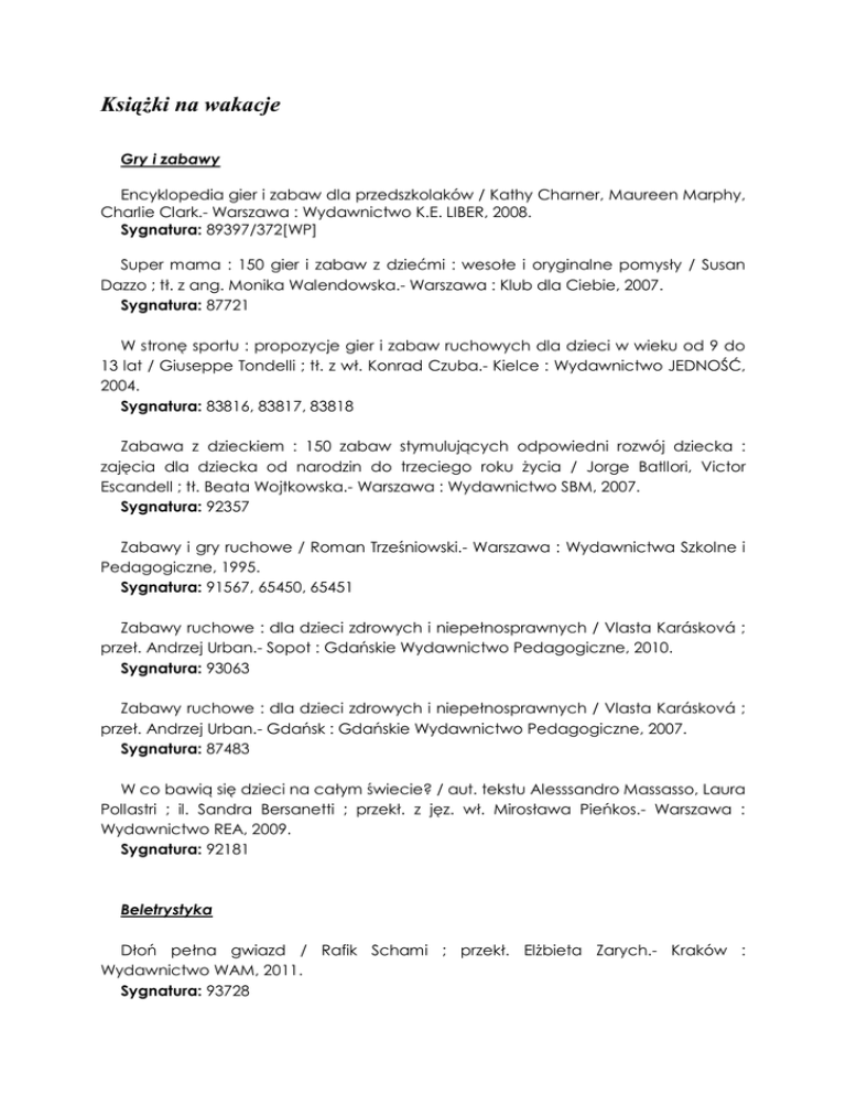 Książki na wakacje Gry i zabawy Encyklopedia gier i zabaw dla przedszkolaków / Kathy Charner, Maureen Marphy, Charlie Clark.- Warszawa : Wydawnictwo K.E. LIBER, 2008. Sygnatura: 89397/372[WP] Super mama : 150 gier i zabaw z dziećmi : wesołe i oryginalne pomysły / Susan Dazzo ; tł. z ang. Monika Walendowska.- Warszawa : Klub dla Ciebie, 2007. Sygnatura: 87721 W stronę sportu : propozycje gier i zabaw ruchowych dla dzieci w wieku od 9 do 13 lat / Giuseppe Tondelli ; tł. z wł. Konrad Czuba.- Kielce : Wydawnictwo JEDNOŚĆ, 2004. Sygnatura: 83816, 83817, 83818 Zabawa z dzieckiem : 150 zabaw stymulujących odpowiedni rozwój dziecka : zajęcia dla dziecka od narodzin do trzeciego roku życia / Jorge Batllori, Victor Escandell ; tł. Beata Wojtkowska.- Warszawa : Wydawnictwo SBM, 2007. Sygnatura: 92357 Zabawy i gry ruchowe / Roman Trześniowski.- Warszawa : Wydawnictwa Szkolne i Pedagogiczne, 1995. Sygnatura: 91567, 65450, 65451 Zabawy ruchowe : dla dzieci zdrowych i niepełnosprawnych / Vlasta Karásková ; przeł. Andrzej Urban.- Sopot : Gdańskie Wydawnictwo Pedagogiczne, 2010. Sygnatura: 93063 Zabawy ruchowe : dla dzieci zdrowych i niepełnosprawnych / Vlasta Karásková ; przeł. Andrzej Urban.- Gdańsk : Gdańskie Wydawnictwo Pedagogiczne, 2007. Sygnatura: 87483 W co bawią się dzieci na całym świecie? / aut. tekstu Alesssandro Massasso, Laura Pollastri ; il. Sandra Bersanetti ; przekł. z jęz. wł. Mirosława Pieńkos.- Warszawa : Wydawnictwo REA, 2009. Sygnatura: 92181 Beletrystyka Dłoń pełna gwiazd / Rafik Schami ; przekł. Elżbieta Zarych.- Kraków : Wydawnictwo WAM, 2011. Sygnatura: 93728 Dom nad rozlewiskiem / Małgorzata Kalicińska.- Poznań : Zysk i S-ka Wydawnictwo, 2006. Sygnatura: 89505, 90644 Fikołki na trzepaku : wspomnienia z podwórka i nie tylko / Małgorzata Kalicińska.Poznań : Zysk i S-ka Wydawnictwo, 2009. Sygnatura: 92047 Kiedy płaczą świerszcze / Charles Martin ; przekł. Jacek Bielas.- Kraków : Wydawnictwo WAM, 2008. Sygnatura: 91184 Matka Wszystkich Lalek / Monika Szwaja.- Grójec : Wydawnictwo SOL, 2011. Sygnatura: 94489 Miłość nad rozlewiskiem / Małgorzata Kalicińska.- Poznań : Zysk i S-ka Wydawnictwo, 2008. Sygnatura: 90645, 90696 Niedobre miejsce / William Wharton ; przeł. Paweł Kruk.- Wyd. 1 (dodr.).- Poznań : Dom Wydawniczy Rebis, 2006. Sygnatura: 93673 Otuleni deszczem / Charles Martin ; przekł. Katarzyna Wydra.- Kraków : Wydawnictwo WAM, 2010. Sygnatura: 93679 Powroty nad rozlewiskiem / Małgorzata Kalicińska.- Poznań : Zysk i S-ka Wydawnictwo, 2007. Sygnatura: 89178, 90643 Serce na temblaku / Katarzyna Grochola.- Warszawa : "W.A.B.", 2002. Sygnatura: 94140 W pogoni za świetlikami / Charles Martin ; przekł. Julita Makowiecka.- Kraków : Wydawnictwo WAM, 2011. Sygnatura: 93711 Wszystkie odcienie pereł / Stacy Hawkins Adams ; przekł. Katarzyna Wydra.Kraków : Wydawnictwo WAM, 2009. Sygnatura: 93717 Zwyczajny facet / Małgorzata Kalicińska.- Poznań : Zysk i S-ka Wydawnictwo, 2010. Sygnatura: 92982