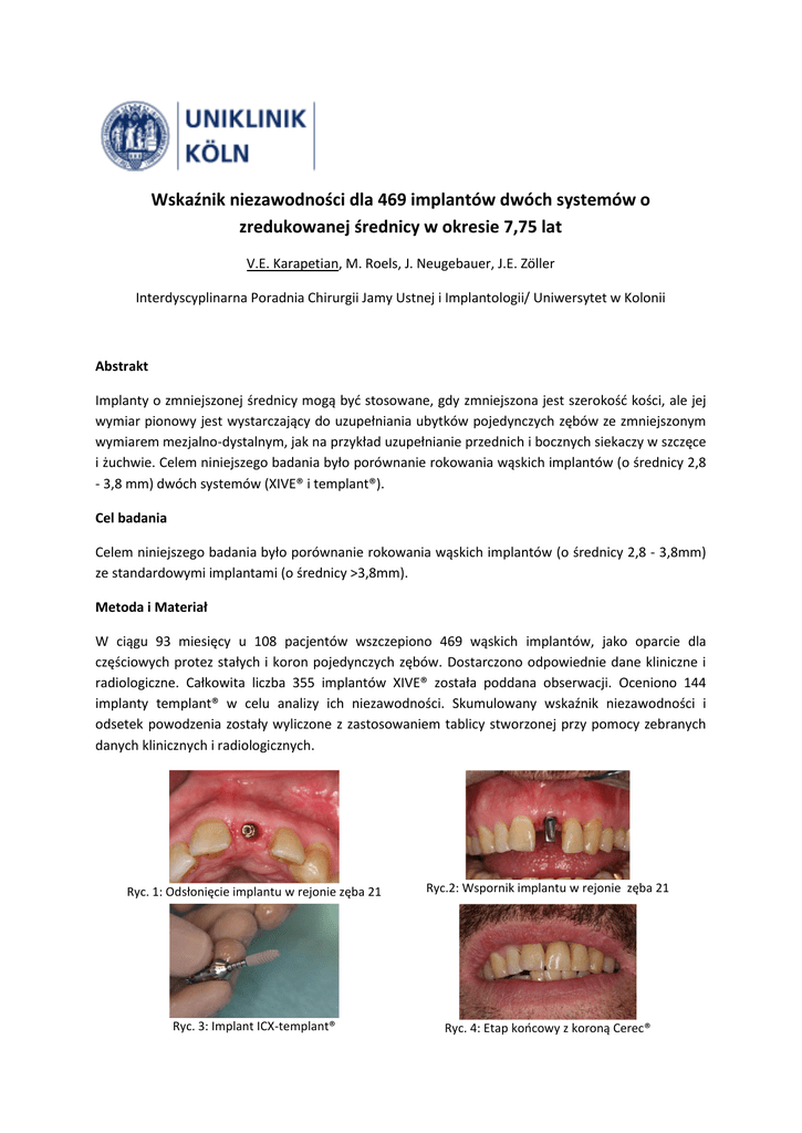 Wskaźnik niezawodności dla 469 implantów dwóch systemów o zredukowanej średnicy w okresie 7,75 lat V.E. Karapetian, M. Roels, J. Neugebauer, J.E. Zöller Interdyscyplinarna Poradnia Chirurgii Jamy Ustnej i Implantologii/ Uniwersytet w Kolonii Abstrakt Implanty o zmniejszonej średnicy mogą być stosowane, gdy zmniejszona jest szerokość kości, ale jej wymiar pionowy jest wystarczający do uzupełniania ubytków pojedynczych zębów ze zmniejszonym wymiarem mezjalno-dystalnym, jak na przykład uzupełnianie przednich i bocznych siekaczy w szczęce i żuchwie. Celem niniejszego badania było porównanie rokowania wąskich implantów (o średnicy 2,8 - 3,8 mm) dwóch systemów (XIVE® i templant®). Cel badania Celem niniejszego badania było porównanie rokowania wąskich implantów (o średnicy 2,8 - 3,8mm) ze standardowymi implantami (o średnicy >3,8mm). Metoda i Materiał W ciągu 93 miesięcy u 108 pacjentów wszczepiono 469 wąskich implantów, jako oparcie dla częściowych protez stałych i koron pojedynczych zębów. Dostarczono odpowiednie dane kliniczne i radiologiczne. Całkowita liczba 355 implantów XIVE® została poddana obserwacji. Oceniono 144 implanty templant® w celu analizy ich niezawodności. Skumulowany wskaźnik niezawodności i odsetek powodzenia zostały wyliczone z zastosowaniem tablicy stworzonej przy pomocy zebranych danych klinicznych i radiologicznych. Ryc. 1: Odsłonięcie implantu w rejonie zęba 21 Ryc.2: Wspornik implantu w rejonie zęba 21 Ryc. 3: Implant ICX-templant® Ryc. 4: Etap końcowy z koroną Cerec® Wyniki Wszczepienie 5 z 355 implantów Xive® (1,4%) nie powiodło się. Podobnie stało się w przypadku 2 ze 144 implantów templant® (1,8%), (tabela 1+2). Skumulowany wskaźnik niezawodności i odsetek powodzenia zostały wyliczone z zastosowaniem tablicy stworzonej przy pomocy zebranych danych klinicznych i radiologicznych. Dla implantów Xive® skumulowany wskaźnik niezawodności wyniósł 98,6%. Dla implantów templant® skumulowany wskaźnik niezawodności wyniósł 98,2%. Skumulowany wskaźnik niezawodności i odsetek powodzenia dwóch badanych systemów implantów o małej średnicy nie różniły się istotnie statystycznie (P > 0,05). Templant® (n=114) N=114 % 112 98,2 2 1,8 poluzowanie 2 1,8 Xive® (n=355) n=355 % 350 98,6 5 1,4 3 2 0,8 0,6 in situ eksplantowane Przyczyny utraty implantów in situ eksplantowane Przyczyny utraty implantów poluzowanie zapalenie tkanek okołowszczepowych (Periimplantitis) Wnioski Niniejsze wyniki świadczą o tym, iż nie ma różnicy między wąskimi implantami a implantami o standardowej średnicy pod względem osseointegracji. Istotną zaletą wydaje się być fakt, iż stosowanie implantów o zmniejszonej średnicy u pacjentów z kością o niewielkiej szerokości pozwala stomatologowi zrezygnować z bocznej augmentacji. Piśmiennictwo 1. Christensen G.J.: The 'mini'-implant has arrived. 2006 Mar;137(3):387-90. 2. De Wijs, F.L., Van Dongen, R.C., De Lange, G.L., et al.,Front tooth replacement with Tubingen implants. J Oral Rehabil 1994 (1): 11-26. 3. Froum, S., Emtiaz, S., Bloom, M.J., et al., The use of transitional implants for immediate fixed temporary prostheses in cases of implant restorations. Pract Periodontics Aesthet Dent 1998 (6): 737-767 4. Romeo E., Lops D., Amorfini L., Chiapasco M., Ghisolfi M., Vogle G.: Clinical andradiographic evaluation of small-diameter (3.3-mm) implants followed for 1-7 years: a longitudinal study. 2006 Apr;17(2):139-48.
