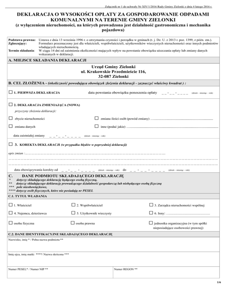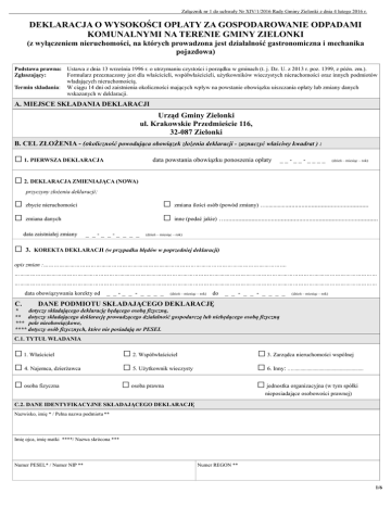 Załącznik nr 1 do uchwały Nr XIV/1/2016 Rady Gminy Zielonki z dnia 4 lutego 2016 r. DEKLARACJA O WYSOKOŚCI OPŁATY ZA GOSPODAROWANIE ODPADAMI KOMUNALNYMI NA TERENIE GMINY ZIELONKI (z wyłączeniem nieruchomości, na których prowadzona jest działalność gastronomiczna i mechanika pojazdowa) Podstawa prawna: Ustawa z dnia 13 września 1996 r. o utrzymaniu czystości i porządku w gminach (t. j. Dz. U. z 2013 r. poz. 1399, z późn. zm.). Zgłaszający: Formularz przeznaczony jest dla właścicieli, współwłaścicieli, użytkowników wieczystych nieruchomości oraz innych podmiotów władających nieruchomością. Termin składania: W ciągu 14 dni od zaistnienia okoliczności mających wpływ na powstanie obowiązku uiszczania opłaty lub zmiany danych wskazanych w deklaracji. A. MIEJSCE SKŁADANIA DEKLARACJI Urząd Gminy Zielonki ul. Krakowskie Przedmieście 116, 32-087 Zielonki B. CEL ZŁOŻENIA - (okoliczność powodująca obowiązek złożenia deklaracji - zaznaczyć właściwy kwadrat ) : □ 1. PIERWSZA DEKLARACJA data powstania obowiązku ponoszenia opłaty __-__-____ (dzień – miesiąc – rok) □ 2. DEKLARACJA ZMIENIAJĄCA (NOWA) przyczyny złożenia deklaracji: □ zbycie nieruchomości □ zmiana danych data zaistniałej zmiany □ zmiana ilości osób (powód zmiany) …................................................................ □ inne (podać jakie) …............................................................................................. _ _-_ _-_ _ _ _ (dzień – miesiąc – rok) □ 3. KOREKTA DEKLARACJI (w przypadku błędów w poprzedniej deklaracji) opis zmian :…………………………………………………………………………………………………………………………. ……………………………………………………………………………………………………………………………………………………………………………………… ……………………………………………………………………………………………………………………………………………………………………………………… data obowiązywania korekty od C. _ _-_ _ - _ _ _ _ (dzień – miesiąc – rok) do _ _ - _ _ - _ _ _ _ (dzień – miesiąc – rok) DANE PODMIOTU SKŁADAJĄCEGO DEKLARACJĘ * dotyczy składającego deklarację będącego osobą fizyczną, ** dotyczy składającego deklarację prowadzącego działalność gospodarczą lub niebędącego osobą fizyczną *** pole nieobowiązkowe, **** dotyczy osób fizycznych, które nie posiadają nr PESEL C.1. TYTUŁ WŁADANIA □ 1. Właściciel □ 4. Najemca, dzierżawca □ osoba fizyczna □ 2. Współwłaściciel □ 5. Użytkownik wieczysty □ osoba prawna □ 3. Zarządca nieruchomości wspólnej □ 6. Inny: □ jednostka organizacyjna (w tym spółki …...................................................... nieposiadające osobowości prawnej) C.2. DANE IDENTYFIKACYJNE SKŁADAJĄCEGO DEKLARACJĘ Nazwisko, imię * / Pełna nazwa podmiotu ** Imię ojca, imię matki ****/ Nazwa skrócona *** Numer PESEL* / Numer NIP ** Numer REGON ** 1/6 C.3. MIEJSCE ZAMIESZKANIA */ SIEDZIBY ** Ulica Numer domu Miejscowość Kod pocztowy Telefon kontaktowy *** Numer lokalu Poczta Adres e-mail *** C.4. ADRES KORESPONDENCYJNY (należy wypełnić, jeżeli jest inny niż w części C.3.) Ulica Numer domu Miejscowość Kod pocztowy Numer lokalu Poczta C.5. DANE IDENTYFIKACYJNE NIERUCHOMOŚCI POŁOŻONEJ NA TERENIE GMINY ZIELONKI, NA KTÓREJ POWSTAJĄ ODPADY KOMUNALNE Typ nieruchomości (zaznaczyć właściwy kwadrat): □ 1. Zabudowa jednorodzinna □ 2. Zabudowa dwurodzinna (bliźniacza) □ 3. Zabudowa szeregowa □ 4. Zabudowa wielorodzinna (blok) □ 5. Działalność gospodarcza (podać rodzaj działalności) …...................................................................................................................... □ 6. Domki letniskowe □ 7. Nieruchomości wykorzystywane na cele rekreacyjno – wypoczynkowe przez część roku. C.6. ADRES NIERUCHOMOŚCI, NA KTÓREJ POWSTAJĄ ODPADY KOMUNALNE (wypełnić, jeżeli jest inny niż w części C.3.) Ulica Numer domu Miejscowość Kod pocztowy Numer lokalu Poczta C.7. INFORMACJA O SPOSOBIE ZBIERANIA ODPADÓW BIODEGRADOWALNYCH (odpady zielone, pochodzące z pielęgnacji terenów zielonych, resztki żywności itp.). Oświadczam, że na terenie nieruchomości wskazanej w części C.3 lub C.6. niniejszej deklaracji odpady biodegradowalne będą gromadzone w następujący sposób: □ Własny kompostownik □Oddawanie odpadów zielonych do punktów □ Nie dotyczy selektywnego zbierania odpadów C.8. NIERUCHOMOŚĆ WSKAZANA W CZĘŚCI C.3. LUB C.6. jest: □ □ □ □ ZAMIESZKAŁA NIEZAMIESZKAŁA MIESZANA DOMEM LETNISKOWYM LUB NIERUCHOMOŚCIĄ WYKORZYSTYWANĄ NA CELE REKREACYJNO – WYPOCZYNKOWE, PRZEZ CZĘŚĆ ROKU Należy wypełnić dział D Należy wypełnić dział E Należy wypełnić dział D,E,G Należy wypełnić dział F 2/6 D. WYSOKOŚĆ OPŁATY ZA GOSPODAROWANIE ODPADAMI KOMUNALNYMI DLA NIERUCHOMOŚCI ZAMIESZKAŁYCH 1. Oświadczam, że na terenie nieruchomości wskazanej w części C.3. lub C.6. niniejszej deklaracji zamieszkuje.....................osób 1). 2. Odpady komunalne będą gromadzone (zaznaczyć właściwy kwadrat): □ w sposób selektywny (segregowany) □ w sposób nieselektywny (zmieszany) (papier, tworzywa sztuczne, szkło, opakowania wielomateriałowe) (odpady komunalne niepoddane segregacji) Do ustalenia opłaty przyjmuje się stawkę …........ zł Do ustalenia opłaty przyjmuje się stawkę …........ zł 3. Wyliczenie miesięcznej opłaty za gospodarowanie odpadami komunalnymi: ….......................................................... x …......................................................................... (liczba mieszkańców objętych obowiązkiem uiszczania opłaty*) 1) = …...................................