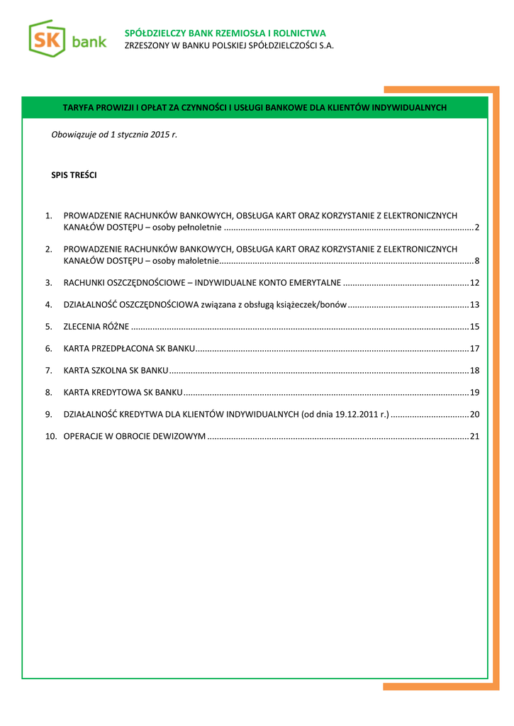 SPÓŁDZIELCZY BANK RZEMIOSŁA I ROLNICTWA ZRZESZONY W BANKU POLSKIEJ SPÓŁDZIELCZOŚCI S.A. TARYFA PROWIZJI I OPŁAT ZA CZYNNOŚCI I USŁUGI BANKOWE DLA KLIENTÓW INDYWIDUALNYCH Obowiązuje od 1 stycznia 2015 r. SPIS TREŚCI 1. PROWADZENIE RACHUNKÓW BANKOWYCH, OBSŁUGA KART ORAZ KORZYSTANIE Z ELEKTRONICZNYCH KANAŁÓW DOSTĘPU – osoby pełnoletnie ......................................................................................................... 2 2. PROWADZENIE RACHUNKÓW BANKOWYCH, OBSŁUGA KART ORAZ KORZYSTANIE Z ELEKTRONICZNYCH KANAŁÓW DOSTĘPU – osoby małoletnie........................................................................................................... 8 3. RACHUNKI OSZCZĘDNOŚCIOWE – INDYWIDUALNE KONTO EMERYTALNE ..................................................... 12 4. DZIAŁALNOŚĆ OSZCZĘDNOŚCIOWA związana z obsługą książeczek/bonów ................................................... 13 5. ZLECENIA RÓŻNE .............................................................................................................................................. 15 6. KARTA PRZEDPŁACONA SK BANKU................................................................................................................... 17 7. KARTA SZKOLNA SK BANKU .............................................................................................................................. 18 8. KARTA KREDYTOWA SK BANKU ........................................................................................................................ 19 9. DZIAŁALNOŚĆ KREDYTWA DLA KLIENTÓW INDYWIDUALNYCH (od dnia 19.12.2011 r.) ................................. 20 10. OPERACJE W OBROCIE DEWIZOWYM .............................................................................................................. 21 1. PROWADZENIE RACHUNKÓW BANKOWYCH, OBSŁUGA KART ORAZ KORZYSTANIE Z ELEKTRONICZNYCH KANAŁÓW DOSTĘPU – osoby pełnoletnie Rozdział 1 Rachunki oszczędnościowo-rozliczeniowe – konto osobiste PLAN TARYFOWY TYTUŁ V Student*** *** warunkiem korzystania z planu jest zaświadczenie szkoły/uczelni wyższej lub aktualna legitymacja oraz wiek od 18 do 26 lat IV Senior** ** warunkiem korzystania z planu jest udokumentowanie otrzymywania świadczenia z ZUS lub KRUS III Internetowy* warunkiem korzystania z planu jest posiadanie dostępu aktywnego do systemu bankowości internetowej eKonto24 II Aktywny * I Standardowy LP 0,00 zł 0,00 zł 0,00 zł 0,00 zł 0,00 zł 2,00 zł 10,00 zł 0,00 zł/ 4,00 zł2 2,00 zł 0,00 zł 4,00 zł 4,00 zł X 4,00 zł 4,00 zł 1,00 zł 1,00 zł X 1,00 zł 1,00 zł 15,00 zł 15,00 zł 15,00zł 15,00 zł 15,00 zł 22,00 zł 22,00 zł 22,00 zł 22,00 zł 22,00 zł 0,00 zł 0,00 zł 0,00 zł 0,00 zł 0,00 zł Otwarcie i prowadzenie rachunku 1. Otwarcie rachunku 1 2. Miesięczna opłata za prowadzenie rachunku 3. Sporządzenie i przekazanie wyciągu po każdej zmianie salda: a) w formie papierowej3 b) w formie elektronicznej 4. 5. 3,4 Sporządzenie historii rachunku za rok bieżący5 5 Sporządzenie historii rachunku za każdy rok poprzedni Korzystanie z elektronicznych kanałów dostępu 6. Udostępnienie elektronicznych kanałów dostępu 6 7. Miesięczna opłata za posiadanie dostępu do eKonta24 1,00 zł 0,00 zł 0,00 zł 1,00 zł 1,00 zł 8. Udostępnienie autoryzacji za pośrednictwem haseł otrzymywanych przez SMS 0,00 zł 0,00 zł 0,00 zł 0,00 zł 0,00 zł 9. Udostępnienie autoryzacji za pośrednictwem haseł jednorazowych 0,00 zł 0,00 zł 0,00 zł 0,00 zł 0,00 zł 1 Opłaty nie pobiera się za miesiąc w którym rachunek prowadzony jest mniej niż 15 dni kalendarzowych w danym cyklu prowizyjnym oraz za miesiąc w którym zamknięto rachunek Opłata 0,00 zł w przypadku gdy do konta wydana i aktywowana jest karta, w przypadku braku aktywowanej karty opłata 4,00 zł 3 Opłata pobierana za każdy wyciąg łącznie do 10 dnia cyklu prowizyjnego za poprzedni cykl prowizyjny 4 Od momentu udostępnienia usługi przez SK bank 5 Opłata pobierana za każdą stronę wydruku wykonaną przez placówkę SK banku 6 Opłaty nie pobiera się za miesiąc w którym usługa jest udostępniona mniej niż 15 dni kalendarzowych w danym cyklu prowizyjnym oraz za miesiąc w którym zrezygnowano z usługi 2 2 LP TYTUŁ I II III IV V 5,00 zł 2,00 zł 5,00 zł 5,00 zł 5,00 zł 3 szt. 10 szt. 5 szt. 3 szt. 5 szt. 0,20 zł 0,20 zł 0,20 zł 0,20 zł 0,20 zł 13. Wpłata gotówkowa 0,00 zł 0,00 zł 0,00 zł 0,00 zł 0,00 zł 14. Wypłata gotówkowa 0,00 zł 0,00 zł 0,00 zł 0,00 zł 0,00 zł a) eKonto24 0,00 zł 0,00 zł 0,00 zł 0,00 zł 0,00 zł b) placówkę SK banku 0,00 zł 0,00 zł 0,00 zł 0,00 zł 0,00 zł 1,00 zł 0,00 zł 0,00 zł 1,00 zł 0,00 zł 5,00 zł 5,00 zł 5,00 zł 5,00 zł 5,00 zł 25,00 zł 25,00 zł 25,00 zł 25,00 zł 25,00 zł a) systemu Elixir 2,50 zł 1,00 zł 7,00 zł 2,50 zł 1,00 zł b) systemu Sorbnet 50,00 zł 50,00 zł 50,00 zł 50,00 zł 50,00 zł 5,00 zł 5,00 zł 5,00 zł 5,00 zł 5,00 zł a) eKonto24 0,00 zł 0,00 zł 0,00 zł 0,00 zł 0,00 zł b) placówkę SK banku 0,00 zł 0,00 zł 7,00 zł 0,00 zł 0,00 zł 1 10. Wydanie listy haseł jednorazowych 11. Liczba darmowych komunikatów informacyjnych z SMSbank w cyklu prowizyjnym 12. Wysłanie komunikaty informacyjnego z SMSbank 2 Wpłaty i wypłaty gotówkowe w placówce SK banku Przelewy 15. Przelew na rachunek w SK banku realizowany przez: 16. Przelew do innego banku krajowego realizowany przez eKonto24 za pośrednictwem: a) systemu Elixir b) systemu BlueCash3 c) systemu Sorbnet 3 17. Przelew do innego banku krajowego realizowany przez placówkę SK banku za pośrednictwem: 18. Wydanie przez placówkę SK banku potwierdzenia wykonania przelewu Zlecenia stałe 19. Złożenie zlecenia stałego realizowanego przez: 1 Pierwsza lista haseł jednorazowych wydawana jest bez opłat. Opłata pobierana jest za każdą następną zamówioną listę haseł jednorazowych Opłata pobierana jedn