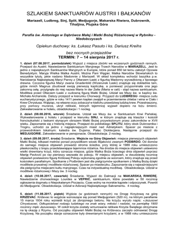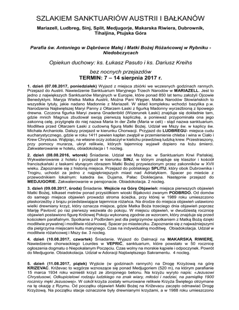 SZLAKIEM SANKTUARIÓW AUSTRII I BAŁKANÓW Mariazell, Ludbreg, Sinj, Split, Medjugorje, Makarska Riwiera, Dubrownik, Tihaljina, Ptujska Góra Parafia św. Antoniego w Dąbrówce Małej i Matki Bożej Różańcowej w Rybniku Niedobczycach Opiekun duchowy: ks. Łukasz Pasuto i ks. Dariusz Kreihs bez nocnych przejazdów TERMIN: 7 – 14 sierpnia 2017 r. 1. dzień (07.08.2017, poniedziałek) Wyjazd z miejsca zbiórki we wczesnych godzinach rannych. Przejazd do Austrii. Nawiedzenie Sanktuarium Maryjnego Trzech Narodów w MARIAZELL. Jest to jedno z największych Sanktuariów Maryjnych w Europie, które ponad 850 lat temu założyli Ojcowie Benedyktyni. Maryja Wielka Matka Austrii, Można Pani Węgier, Matka Narodów Słowiańskich to wszystkie tytuły, jakie nadano Madonnie z Mariazell. W skład kompleksu wchodzi bazylika p.w. Narodzenia Najświętszej Maryi Panny z Ołtarzem Łaski z figurką Madonny wyrzeźbioną z lipowego drewna. Czczona figurka Maryi zwana Gnadenbild (Wizerunek Łaski) znajduje się dokładnie tam, gdzie mnich Magnus zbudował swoją pierwszą kapliczkę, a ponieważ przypominała ona jego zakonną celę, przylgnęła do niej nazwa Maria In der Zelle (Maria w celi) - stąd nazwa sanktuarium. Modlitwa przed Ołtarzem Łaski z cudowną figurą Matki Bożej. Udział we Mszy św. w kaplicy św. Michała Archanioła. Dalszy przejazd w kierunku Chorwacji. Przyjazd do LUDBREGU- miejsca cudu eucharystycznego, gdzie w roku 1411 pewien kapłan zwątpił w przemienienie chleba i wina w Ciało i Krew Chrystusa. Wątpiąc, na własne oczy zobaczył w kielichu prawdziwą ludzką krew. Przestraszony, przy pomocy murarza, ukrył relikwie, których tajemnicę wyjawił dopiero na łożu śmierci. Zakwaterowanie w hotelu, obiadokolacja i 1 nocleg. 2. dzień (08.08.2016, wtorek) Śniadanie. Udział we Mszy św. w Sanktuarium Krwi Pańskiej. Wykwaterowanie z hotelu i przejazd w kierunku SINJ, w którym znajduje się klasztor i kościół franciszkański z łaskami słynącym obrazem Matki Bożej przywiezionym przez zakonników w XVII wieku. Zapoznanie się z historią miejsca. Przejazd do pobliskiego SPLITU, który obok Dubrownika i Trogiru, uchodzi za jedno z najpiękniejszych miast nad Adriatykiem. Spacer po mieście z przewodnikiem lokalnym: katedra św. Dujama, Pałac Dioklecjana. Następnie przejazd do MEDJUGORIE. Zakwaterowanie w pensjonacie. Obiadokolacja. 2 nocleg. 3. dzień (09.08.2017, środa) Śniadanie. Wejście na Górę Objawień: miejsca pierwszych objawień Matki Bożej, kilkaset metrów ponad przysiółkiem wioski Bijakovici zwanym PODBRDO. Od domów do samego miejsca objawień prowadzi stroma ścieżka, przy której w 1989 roku umieszczono płaskorzeźby z brązu przedstawiające tajemnice różańca. Na drodze do miejsca objawień ustawiono wielki drewniany krzyż, który oznacza miejsce, gdzie Matka Boża trzeciego dnia objawień poprzez Mariję Pavlović po raz pierwszy wezwała do pokoju. W miejscu objawień, w dwudziestą rocznicę objawień postawiono figurę Królowej Pokoju wykonaną zgodnie ze wzorcem, który znajduje się przed kościołem parafialnym. Spotkanie z Podbrdem jest dla pielgrzymów spotkaniem z Matką Bożą dzięki modlitwie prywatnej i modlitwie różańcowej. Spacer po miasteczku. Zapoznanie się z najważniejszymi dla pielgrzyma miejscami kultu maryjnego. Czas na indywidualną modlitwę. Obiadokolacja. Udział w modlitwie różańcowej i Mszy św. 3 nocleg. 4. dzień (10.08.2017, czwartek) Śniadanie. Wyjazd do Dalmacji na MAKARSKĄ RIWIERĘ. Nawiedzenie chorwackiego Lourdes w VEPRIĆ, sanktuarium, które powstało w 50 rocznicę ogłoszenia dogmatu o Niepokalanym Poczęciu. Czas wolny na morskie kąpiele i odpoczynek. Powrót do Medjugorie. Obiadokolacja. Udział w Adoracji Najświętszego Sakramentu. 4 nocleg. 5. dzień (11.08.2017, piątek) Wyjście (w godzinach rannych) na Drogę Krzyżową na górę KRIZEVAC. Križevac to wzgórze wznoszące się ponad Medjugoriem (520 m), na którym parafianie 15 marca 1934 roku wznieśli krzyż ze zbrojonego betonu. Na krzyżu wyryto napis: «Jezusowi Chrystusowi, Odkupicielowi rodzaju ludzkiego na znak wiary, miłości i nadziei, na pamiątkę 1900 rocznicy męki Jezusowej». W cokół krzyża zostały wmurowane relikwie Krzyża Świętego otrzymane na tę okazję z Rzymu. Od początku objawień Matki Bożej na Križevacu zaczęto odmawiać Drogę Krzyżową. Na początku stacje oznaczone były drewnianymi krzyżami, a w 1988 roku umieszczono tam płaskorzeźby wykonane z brązu. Na każdej z nich (oprócz modlitwy w ogrodzie Getsemani) znajduje się postać Matki Bożej. Dla pielgrzymów Križevac oznacza wezwanie, by spotkać Jezusa w Jego męce i odkryć Jego miłość. Powrót do pensjonatu na śniadanie. Odpoczynek. Wczesnym popołudniem wyjazd nad wodospady Kravice. Obiadokolacja. Wieczorami udział w modlitwie różańcowej, Mszy św. i Adoracji Krzyża. 5 nocleg. 6. dzień (12.08.2017, sobota) Śniadanie. Przejazd do DUBROWNIKA, miasta potocznie nazywanego „Perłą Adriatyku” Zwiedzanie starówki z przewodnikiem miejscowym (Studnia Onufrego, katedra, kościół św. Błażeja, port). Udział we Mszy św. w kościele św. Błażeja – głównego Patrona miasta. Czas wolny nad Adriatykiem. Przyjazd do Medjugorie. Obiadokolacja. Udział w nocnej Adoracji Najświętszego Sakramentu. 6 nocleg. 7. dzień (13.08.2017, niedziela) Śniadanie. Wykwaterowanie z pensjonatu. Przejazd do TIHALJINY, gdzie znajduje się jeden z najsłynniejszych wizerunków Królowej Pokoju. Udział we Mszy św. w kościele Proroka Eliasza. Przejazd do hotelu w okolicy Zagrzebia. Obiadokolacja. 7 nocleg. 8. dzień (14.08.2017, poniedziałek) Śniadanie. Wykwaterowanie z hotelu. Przejazd do Słowenii. Nawiedzenie sanktuarium maryjnego na PTUJSKIEJ GÓRZE, do którego pielgrzymują wierni od sześciu wieków. Nawiedzenie świątyni uchodzącej za perłę słoweńskiego gotyku. Modlitwa przed łaskami słynącą płaskorzeźbą M
