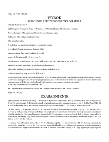 Sygn. akt VI Ka 1182/15 WYROK W IMIENIU RZECZYPOSPOLITEJ POLSKIEJ Dnia 29 stycznia 2016 r. Sąd Okręgowy Warszawa-Praga w Warszawie VI Wydział Karny Odwoławczy w składzie : Przewodniczący: SSO Agnieszka Wojciechowska-Langda (spr.) Sędziowie: SSO Małgorzata Bańkowska SSO Anna Zawadka Protokolant p.o. protokolant sądowy Monika Suwalska przy udziale Prokuratora Anny Radyno-Idzik po rozpoznaniu dnia 29 stycznia 2016 r. w W. sprawy D. K. (1) syna M. i E. ur. (...) w O. oskarżonego o przestępstwa z art. 279 § 1 kk w zw. z art. 64 § 1 kk w zw. z art. 91 § 1 kk na skutek apelacji wniesionej przez obrońcę oskarżonego od wyroku Sądu Rejonowego dla Warszawy Pragi-Południe w W. z dnia 9 kwietnia 2015 r. sygn. akt III K 673/12 utrzymuje w mocy wyrok co do oskarżonego D. K. (1) w zaskarżonej części; zwalnia oskarżonego od uiszczenia kosztów sądowych w postępowaniu odwoławczym przejmując je na rachunek Skarbu Państwa; zasądza od Skarbu Państwa na rzecz adwokat M. P. kwotę 516,60 złotych obejmującą wynagrodzenie za obronę z urzędu w instancji odwoławczej oraz podatek VAT. SSO Agnieszka Wojciechowska-Langda SSO Małgorzata Bańkowska SSO Anna Zawadka Sygn. akt 1182/15 UZASADNIENIE Sąd Rejonowy dla Warszawy Pragi – Południe w Warszawie wyrokiem z dnia 9 kwietnia 2015 roku w sprawie III K 637/12 oskarżonego D. K. (1) uniewinnił od popełnienia czynów zarzucanych mu w pkt I, II, III, IV,V, VIII, IX, X,XI,XII aktu oskarżenia, a w ramach zarzucanych mu czynów w pkt VI i VII uznał za winnego tego, że: - w nocy z 16 na 17 maja 2004 roku w W. W., dokonał włamania do samochodu marki P. o nr rej. (...) o wartości 4000 zł w ten sposób, że przy pomocy śrubokręta otworzył zamek w przednich drzwiach od strony pasażera, a następnie zabrał ten pojazd w celu przywłaszczenia na szkodę M. C., przy czym czynu tego dopuścił się w ciągu 5 lat po odbyciu co najmniej 6 miesięcy kary pozbawienia wolności orzeczonej za umyślne przestępstwo podobne tj. czynu z art. 279 § 1 k.k. w zw. z art. 64 § 1 k.k.; - w nocy z 7 na 8 kwietnia 2004 roku w W. W. działając wspólnie i w porozumieniu z M. W. dokonał włamania do samochodu marki H. (...) o nr rej (...), poprzez wyrwanie klamki wraz z obudową w prawych przednich drzwiach, skąd zabrał w celu przywłaszczenia radio marki P. o wartości 1000 zł na szkodę M. K., przy czym czynu tego dopuścił się w ciągu 5 lat po odbyciu co najmniej 6 miesięcy kary pozbawienia wolności orzeczonej za umyślne przestępstwo podobne tj. czynu z art. 279 § 1 k.k. w zw. z art. 64 § 1 k.k i ustalił, że przestępstwa te zostały popełnione w krótkich odstępach czasu i w podobny sposób, w ramach ciągu przestępstw z art. 91 § 1 k.k. i za to za każdy z tych czynów na podstawie art. 279 § 1 k.k. w zw. z art. 64 § 1 k.k. skazał go, a na podstawie art. 279 § 1 k.k. w zw. z art. 91 § 1 k.k. wymierzył mu karę roku i 6 miesięcy pozbawienia wolności; na podstawie art. 44 § 2 k.k. orzekł przepadek na rzecz Skarbu Państwa dowodu rzeczowego w postaci noża opisanego w wykazie dowodów rzeczowych Drz 36/04 na k. 148 akt III K 1245/12 pod poz. 1; a na podstawie art. 192a § 1 k.p.k. uznał za zbędne i nakazał zniszczyć ślady kryminalistyczne opisane w wykazie dowodów rzeczowych Drz 54/04 na k. 34 akt III K 1245/12 pod poz. od 1 do 3 oraz wykazie dowodów rzeczowych Drz 44/04 na k. 94 akt III K 1245/12 pod poz. od 1 do 4; zasądził od Skarbu Państwa na rzecz adw. M. P. z tytułu obrony z urzędu oskarżonego D. K. (1) przed Sądem I Instancji kwotę 1653,12 zł brutto w tym 23 % VAT za obronę przy pierwszym rozpoznaniu sprawy oraz kwotę 1212 zł netto plus VAT za obronę przy ponowym rozpoznaniu sprawy; na podstawie art. 624 § 1 k.p.k. zwolnił oskarżonego od ponoszenia kosztów postępowania w całości, stwierdzając, że na podstawie art. 632 pkt 2 k.p.k. w części uniewinniającej koszty postępowania ponosi Skarb Państwa. Od powyższego wyroku apelację wniósł obrońca oskarżonego zaskarżając wyrok w części, co do punktu III. Wyrokowi temu zarzucił błąd w ustaleniach faktycznych wnosząc o zmianę zaskarżonego wyroku co do punktu III poprzez uniewinnienie oskarżonego od zarzutu popełnienia przypisanych mu w punktach VI i VII czynów, ewentualnie o uchylenie zaskarżonego orzeczenia i przekazanie sprawy Sądowi Rejonowemu do ponownego rozpoznania. Sąd Okręgowy zważył, co następuje: Wniesiona przez obronę apelacja nie zasługuje na uwzględnienie. W pierwszej kolejności, jedynie dla porządku, podkreślić należy prawidłowość rozstrzygnięcia co do pozostałych czynów zarzuconych oskarżonemu i słuszny tok rozumowania Sądu Rejonowego przedstawiony w sposób drobiazgowy w uzasadnieniu. Zgodzić należy się, że materiał dowodowy zgromadzony w aktach sprawy nie pozwalał na zakwestionowanie stanowiska oskarżonego co do czynów od I do V i od VIII do XII opisanych w akcie oskarżenia. Tym samym zasadnym było uniewinnienie go od popełnienia przedmiotowych czynów. Natomiast - wbrew sugestiom obrońcy przedstawionym w apelacji - odmienna sytuacja występuje w przypadku czynów ujętych w pkt VI i VII aktu oskarżenia, które przypisane zostały oskarżonemu zaskarżonym wyrokiem. Trafną jest jedynie uwaga skarżącego, że oskarżony w toku postępowania konsekwentnie nie przyznawał się do popełnienia zarzucanych mu czynów. W tym aspekcie zgodzić należy się z Sądem Rejonowym, że zakwestionowanie przedmiotowego stanowiska procesowego oskarżonego, w świetle zgromadzonego materiału dowodowego było możliwe w zakresie czynów opisanych w pkt VI i VII. Wskazane przez Sąd Rejonowy dowody w postaci zeznań świadków D. R., A. G. (1) oraz M. W., w powiązaniu z zeznaniami pokrzywdzonych tymi czynami M. K. i M. C., wskazują na sprawstwo oskarżonego. Z uwagi na szczegółowe i obszerne uzasadnienie Sądu I Instancji w zakresie stanu faktycznego podkreślić jedynie 