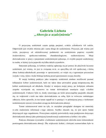 Gabriela Lichota „Aborcja a uzaleŜnienia” O przyczynę uzaleŜnień często pytają pacjenci, a takŜe członkowie ich rodzin. Odpowiedź jest zwykle złoŜona jak i sama droga do uzaleŜnienia. Przyczyn, jak wiemy jest wiele, począwszy od odziedziczonej podatności na uzaleŜnienia poprzez czynniki środowiskowe, społeczno-rodzinne, charakterologiczne, osobowościowe. Moje doświadczenie w pracy z pacjentami uzaleŜnionymi pokazuje, iŜ zwykle pacjent uzaleŜniony to osoba, w której Ŝyciu pojawiło się kilka takich czynników. Statystyki pokazują, Ŝe kobiety rzadziej zgłaszają się po pomoc do placówek leczenia uzaleŜnień, juŜ wiemy, Ŝe jest to związane m.in. ze specyfiką ich roli społecznej, z którą obraz kobiety-alkoholiczki pozostaje w sprzeczności, co wiąŜe się z ogromnym poczuciem wstydu i winy, które z kolei blokuje kobietę przed ujawnieniem swojej choroby. W mojej krótkiej praktyce jako terapeuty uzaleŜnień miałam moŜliwość poznać kilkanaście kobiet uzaleŜnionych, było mi takŜe dane prowadzić grupę terapeutyczną dla kobiet uzaleŜnionych od alkoholu. Kiedyś w miejscu mojej pracy, po kolejnym zebraniu zespołu wywiązała się rozmowa na temat doświadczeń usunięcia ciąŜy u kobiet uzaleŜnionych. Ciekawe było to, kiedy omawiając po kolei poszczególne pacjentki okazało się, Ŝe większość z nich ma takie doświadczenia za sobą, było to wówczas zaskakujące odkrycie, które sprawiło, Ŝe ten temat zapadł mi w pamięci i w późniejszej pracy z kobietami uzaleŜnionymi zawsze zwracałam uwagę na doświadczenia aborcji. Temat zainteresował mnie na tyle, Ŝe zaczęłam przeglądać dostępne mi materiały w celu znalezienia informacji z tego zakresu. Szybko okazało się, Ŝe jest sporo badań dotyczących tego zagadnienia. Przeczytane artykuły potwierdziły moje podejrzenia dotyczące doświadczenia aborcji jako późniejszej konsekwencji uzaleŜnienia u kobiet i nie tylko. Podczas zbierania wywiadów z kobietami uzaleŜnionymi zdziwiła mnie róŜnorodność postrzegania doświadczenia aborcji. Dla większości kobiet, z którymi rozmawiałam było to 1 traumatyczne wydarzenie, mające szereg konsekwencji psychologicznych i somatycznych w późniejszym okresie. Były jednak kobiety, które mówiły o dokonanej aborcji z pozoru bez emocji, podkreślając, iŜ była to ich decyzja z raŜącą wręcz obojętnością. Zastanawiałam się, jak mogą mówić o aborcji w sposób tak pozbawiony emocji. Okazuje się, iŜ jest wręcz przeciwnie, reakcja taka świadczy o powaŜnym zaburzeniu, działają wówczas bardzo silne mechanizmy obronne, które pozwalają jej funkcjonować w miarę „normalnie” i odciąć się od przykrych wspomnień. Badacze (m.in. Reardon) udowodnili takŜe, iŜ kobiety, które mają za sobą doświadczenie aborcji często odreagowują napięcie w kompulsywny sposób – poprzez zajęcie się pracą, zakupami, seksem, a takŜe szukają „znieczulenia” w postaci antydepresantów, neuroleptyków czy wreszcie alkoholu i narkotyków. Niektórzy badacze tego zagadnienia uŜywają pojęcia „zespół postaborcyjny” w celu określenia zespołu reakcji psychologicznych i somatycznych pojawiających się po dokonaniu aborcji. Aborcja niepodwaŜalnie niesie za sobą konsekwencje psychologiczne, które wpływają destrukcyjnie na obraz własnej osoby kobiety oraz na jej funkcjonowanie emocjonalne. Uczucia, jakie towarzyszą wówczas kobiecie to poczucie winy, chaos, rozpacz, wstyd, nieufność lub przeciwnie – emocje mogą zostać zamroŜone. Warto wspomnieć, Ŝe odcięcie się od tych emocji powoduje osłabienie asertywności i sprawia, Ŝe kobiety te łatwiej stają się ofiarami przemocy, czasami po to by „ukarać” siebie za dokonaną aborcję. Częstym skutkiem aborcji jest depresja, pojawienie się myśli i tendencji samobójczych czy innych zachowań autodestrukcyjnych jako przejaw patologicznej identyfikacji z abortowanym dzieckiem, dąŜenie do „spotkania się” z nim. Warto w tym miejscu przytoczyć pewne statystyki: 56-65% kobiet w okresie 5 lat po aborcji przejawia tendencje samobójcze, prób samobójczych dokonuje 28-31% kobiet. UzaleŜnienia (róŜne) występują 5 razy częściej u kobiet po aborcji niŜ po porodzie oraz 4 razy częściej po aborcji niŜ po przebytym poronieniu. ZawęŜając uzaleŜnienia do alkoholizmu – okazuje się, Ŝe 53-61% kobiet po aborcji naduŜywa alkoholu. Kobiety po doświadczeniu aborcji 2 razy częściej uzaleŜniają się od nikotyny, 30 % kobiet po aborcji uzaleŜnia się od benzodiazepin. Statystyki mówią same za siebie. Nie sposób nie zauwaŜyć, iŜ aborcja ma wpływ na psychologiczne funkcjonowanie kobiety i moŜe w znacznym stopniu przyczynić się do uzaleŜnienia od substancji psychoaktywnych. W dniach 20-22 czerwca 2004 roku odbyła się Międzynarodowa Konferencja Naukowa „Aborcja – przyczyny, następstwa, terapia” pod auspicjami Rzecznika Praw Dziecka, Komitetu Demograficznego Polskiej Akademii Nauk oraz Instytutu Psychiatrii i Neurologii. W konferencji brali udział lekarze róŜnych specjalności m.in. psychiatrzy, ginekolodzy, endokrynolodzy, a takŜe psycholodzy i psychoterapeuci z wielu krajów. 2 O uzaleŜnieniu jako konsekwencji aborcji mówił m.in. mgr A. Winkler, psycholog, psychoterapeuta, przekonując, iŜ osoby, które doświadczyły aborcji są bardziej podatne na uzaleŜnienia, które traktują jako „lekarstwo” na bolesne doświadczenia. Okazuje się, Ŝe nie tylko kobieta odczuwa konsekwencje aborcji. W literaturze opisano tzw. „syndrom ocaleńca”. Ocaleniec to osoba, która uniknęła aborcji, której rodzice rozwaŜali tą moŜliwość i z jakiegoś powodu zrezygnowali z zamiaru usunięcia dziecka, takŜe osoba, której wcześniejsze rodzeństwo zostało abortowane. „Nienarodzony jeszcze człowiek rejestruje i zapamiętuje ambiwalentne uczucia oraz wrogość, które pochodzą od jego rodziców”. Cech