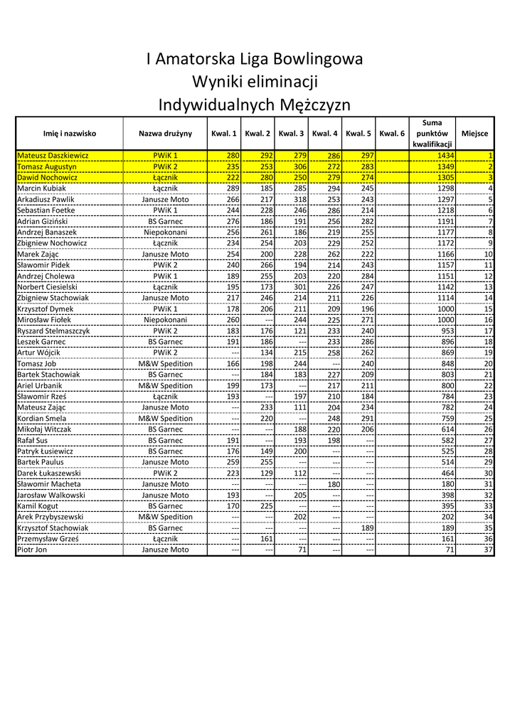 I Amatorska Liga Bowlingowa Wyniki eliminacji Indywidualnych Mężczyzn Imię i nazwisko Mateusz Daszkiewicz Tomasz Augustyn Dawid Nochowicz Marcin Kubiak Arkadiusz Pawlik Sebastian Foetke Adrian Giziński Andrzej Banaszek Zbigniew Nochowicz Marek Zając Sławomir Pidek Andrzej Cholewa Norbert Ciesielski Zbigniew Stachowiak Krzysztof Dymek Mirosław Fiołek Ryszard Stelmaszczyk Leszek Garnec Artur Wójcik Tomasz Job Bartek Stachowiak Ariel Urbanik Sławomir Rześ Mateusz Zając Kordian Smela Mikołaj Witczak Rafał Sus Patryk Łusiewicz Bartek Paulus Darek Łukaszewski Sławomir Macheta Jarosław Walkowski Kamil Kogut Arek Przybyszewski Krzysztof Stachowiak Przemysław Grześ Piotr Jon Nazwa drużyny PWiK 1 PWiK 2 Łącznik Łącznik Janusze Moto PWiK 1 BS Garnec Niepokonani Łącznik Janusze Moto PWiK 2 PWiK 1 Łącznik Janusze Moto PWiK 1 Niepokonani PWiK 2 BS Garnec PWiK 2 M&W Spedition BS Garnec M&W Spedition Łącznik Janusze Moto M&W Spedition BS Garnec BS Garnec BS Garnec Janusze Moto PWiK 2 Janusze Moto Janusze Moto BS Garnec M&W Spedition BS Garnec Łącznik Janusze Moto Kwal. 1 Kwal. 2 Kwal. 3 Kwal. 4 Kwal. 5 Kwal. 6 280 235 222 289 266 244 276 256 234 254 240 189 195 217 178 260 183 191 --166 --199 193 ------191 176 259 223 --193 170 --------- 292 253 280 185 217 228 186 261 254 200 266 255 173 246 206 --176 186 134 198 184 173 --233 220 ----149 255 129 ----225 ----161 --- 279 306 250 285 318 246 191 186 203 228 194 203 301 214 211 244 121 --215 244 183 --197 111 --188 193 200 --112 --205 --202 ----71 286 272 279 294 253 286 256 219 229 262 214 220 226 211 209 225 233 233 258 --227 217 210 204 248 220 198 ------180 ------------- 297 283 274 245 243 214 282 255 252 222 243 284 247 226 196 271 240 286 262 240 209 211 184 234 291 206 ----------------189 ----- Suma punktów Miejsce kwalifikacji 1434 1 1349 2 1305 3 1298 4 1297 5 1218 6 1191 7 1177 8 1172 9 1166 10 1157 11 1151 12 1142 13 1114 14 1000 15 1000 16 953 17 896 18 869 19 848 20 803 21 800 22 784 23 782 24 759 25 614 26 582 27 525 28 514 29 464 30 180 31 398 32 395 33 202 34 189 35 161 36 71 37