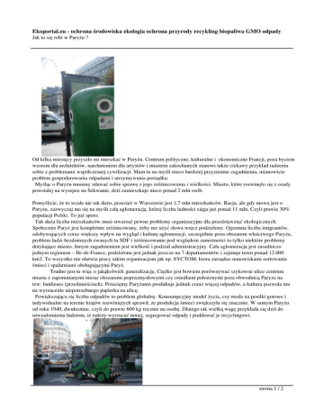 Ekoportal.eu - ochrona środowiska ekologia ochrona przyrody recykling biopaliwa GMO odpady Jak to się robi w Paryżu ? Od kilku miesięcy przyszło mi mieszkać w Paryżu. Centrum polityczne, kulturalne i ekonomiczne Francji, poza byciem wzorem dla architektów, natchnieniem dla artystów i miastem zakochanych stanowi także ciekawy przykład radzenia sobie z problemami współczesnej cywilizacji. Mam tu na myśli nieco bardziej przyziemne zagadnienia, mianowicie problem gospodarowania odpadami i utrzymywania porządku. Myśląc o Paryżu musimy zdawać sobie sprawę z jego zróżnicowania i wielkości. Miasto, które rozwinęło się z osady powstałej na wysepce na Sekwanie, dziś zamieszkuje nieco ponad 2 mln osób. Pomyślicie, że to wcale nie tak dużo, przecież w Warszawie jest 1,7 mln mieszkańców. Racja, ale gdy mowa jest o Paryżu, zazwyczaj ma się na myśli całą aglomerację, której liczba ludności sięga już ponad 11 mln. Czyli prawie 30% populacji Polski. To już sporo. Tak duża liczba mieszkańców musi stwarzać pewne problemy organizacyjne dla przedsięwzięć ekologicznych. Społecznie Paryż jest kompletnie zróżnicowany, żeby nie użyć słowa wręcz podzielony. Ogromna liczba imigrantów, zdobywających coraz większy wpływ na wygląd i kulturę aglomeracji, szczególnie poza obszarem właściwego Paryża, problem ludzi bezdomnych zwanych tu SDF i zróżnicowanie pod względem zamożności to tylko niektóre problemy dotykające miasto. Innym zagadnieniem jest wielkość i podział administracyjny. Cała aglomeracja jest zasadniczo jednym regionem – Ile-de-France, podzielona jest jednak jeszcze na 7 departamentów i zajmuje teren ponad 12.000 km2. To wszystko nie ułatwia pracy takim organizacjom jak np. SYCTOM, ktora zarządza stanowiskami sortowania śmieci i spalarniami obsługującymi Paryż. Trudno jest tu więc o jakąkolwiek generalizację. Ciężko jest bowiem porównywać szykowne ulice centrum miasta z zapomnianymi nieraz obszarami poprzemysłowymi czy osiedlami położonymi poza obwodnicą Paryża na tzw. banlieues (przedmieściach). Przeciętny Paryżanin produkuje jednak coraz więcej odpadów, a kultura pozwala mu na wyrzucenie niepotrzebnego papierka na ulicę. Powiększająca się liczba odpadów to problem globalny. Konsumpcyjny model życia, czy moda na posilki gotowe i indywidualne na terenie krajów rozwiniętych sprawił, że produkcja śmieci zwiększyła się znacznie. W samym Paryżu od roku 1940, dwukrotnie, czyli do prawie 600 kg rocznie na osobę. Dlatego tak wielką wagę przykłada się dziś do uświadomienia ludziom, iż należy wyrzucać mniej, segregować odpady i poddawać je recyclingowi. strona 1 / 2 Ekoportal.eu - ochrona środowiska ekologia ochrona przyrody recykling biopaliwa GMO odpady Jak to się robi w Paryżu ? W Paryżu wprowadzono podział śmieci na trzy rodzaje: odpady przetwarzalne (pojemniki z żółta pokrywką) i odpady gospodarstwa domowego (zielona pokrywka) i szkło (biała pokrywka). Te pierwsze odwożone są do centrów sortowania, których jest pięć i tam poddawane podziałowi na metal, plastik i papier. Reszta zostaje spalona razem z odpadami gospodarstwa domowego. Spalona, ale z odzyskiem energii i ciepła. Według statystyk tak wyprodukowane ciepło służy do ogrzania 210 tyś mieszkań. Prowadzone są także zorganizowane zbiórki odpadów niebezpiecznych jak leki, czy baterie, oraz ubrań, mebli, etc. o których informuje się mieszkańców na plakatach. Nie jest to jednak jedyny sposób komunikacji ze społeczeństwem. Edukacja, kampanie informacyjne i serwis telefoniczny to tylko niektóre sposoby rozwijania świadomości ekologicznej mieszkańców. Tak to wyglada w teorii. W praktyce jednak tylko niewielka ilość ludzi przywiązuje tu większą wagę do problemu odpadów, chyba że dotyczy on ich bardziej bezpośrednio. Wielki znak zapytania pojawia się gdy trzeba wyrzucić starą lodówkę, czy materac. Można je wywieźć do tzw. déchetteries, ale nie łatwo jest zmieścić starą szafę nawet do Jeepa, a opłata za przewóz tego typu sprzętów sprawia, że mieszkańcy wolą porzucić je na ulicy. Innym problemem miasta jest utrzymanie w nim porządku. Ilość mieszkańców, powiększona o ogrom turystów przybywających do regionu naprawdę potrafi nabrudzić. Nie tylko jednak ludzie, ale i ich czteronodzy przyjaciele. Według pewnej książki z powodu psich odchodów rocznie do paryskich szpitali trafia ponad 600 osób. Sprzątanie po zwierzakach teoretycznie jest tu uregulowane prawnie, ale nie wszyscy przestrzegają tej zasady. Przed codziennym, porannym czyszczeniem ulic, opróżnianiem śmietników i zebraniem smieci (30 tyś pojemników na terenie samego Paryza to nadal za mało) czasem ciężko jest się poruszać po chodnikach. Aby to posprzątać potrzebna jest dobrze wyposażona armia pracowników. Chyba, że akurat strajkuje, a strajkowanie to najczęściej uprawiana dyscyplina sportowa Francji. Mniej więcej raz do roku Paryż tonie więc w śmieciach i pojawia sie specyficzny zapach. Częściej widzi się też szczury, które zwykle obecne tylko w metrze, czy w pobliżu kanałów, wychodzą na powierzchnię zachęcone darmową ucztą. W świadomości ludzi Paryż to zazwyczaj urocze uliczki, piękne budynki, kobiety w beretach niosące świeże bagietki i całujące się pary. Miasto to jednak zmienia swoje oblicze. Dziś jest nowoczesną mieszaniną kultur, w centralnej części powstałą na bazie bardzo starego budownictwa z wieloma problemami do rozwiązania. Daleka jestem od skarżenia się na tzw. syndrom paryski, który objawia się przyśpieszeniem pracy serca i halucynacjami zaobserwowanymi u japońskich turystów zwiedzonych rzeczywistym obrazem Paryża, ale na coś w końcu trzeba się skarżyć w jednym z najpiękniejszych miast świata! Agata Kempińska strona 2 / 2