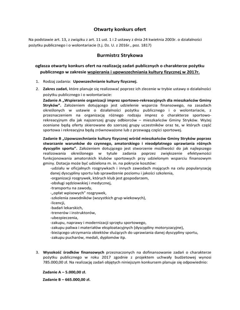 Otwarty konkurs ofert Na podstawie art. 13, z związku z art. 11 ust. 1 i 2 ustawy z dnia 24 kwietnia 2003r. o działalności pożytku publicznego i o wolontariacie (t.j. Dz. U. z 2016r., poz. 1817) Burmistrz Strykowa ogłasza otwarty konkurs ofert na realizację zadań publicznych o charakterze pożytku publicznego w zakresie wspierania i upowszechniania kultury fizycznej w 2017r. 1. Rodzaj zadania: Upowszechnianie kultury fizycznej. 2. Zakres zadań, które planuje się realizować poprzez ich zlecenie w trybie ustawy o działalności pożytku publicznego i o wolontariacie: Zadanie A „Wspieranie organizacji imprez sportowo-rekreacyjnych dla mieszkańców Gminy Stryków”. Założeniem dotującego jest udzielenie wsparcia finansowego, na zasadach określonych w ustawie o działalności pożytku publicznego i o wolontariacie, z przeznaczeniem na organizację różnego rodzaju imprez o charakterze sportoworekreacyjnym dla jak najszerszej grupy odbiorców – mieszkańców Gminy Stryków. Wyżej oceniane będą oferty skierowane do szerszej grupy uczestników oraz te, w których część sportowa i rekreacyjna będą zrównoważone lub z przewagą części sportowej. Zadanie B „Upowszechnianie kultury fizycznej wśród mieszkańców Gminy Stryków poprzez stwarzanie warunków do czynnego, amatorskiego i nieodpłatnego uprawiania różnych dyscyplin sportu”. Założeniem dotującego jest stworzenie możliwości do jak najlepszego realizowania określonego w tytule zadania poprzez zwiększenie efektywności funkcjonowania amatorskich klubów sportowych przy udzielonym wsparciu finansowym gminy. Dotacja może być udzielona m. in. na pokrycie kosztów: -udziału w oficjalnych rozgrywkach i innych zawodach mających na celu popularyzację danej dyscypliny sportu lub sprawdzenie poziomu i jakości szkolenia, -organizacji rozgrywek, których klub jest gospodarzem, -obsługi sędziowskiej i medycznej, -transportu na zawody, -„opłat wpisowych” rozgrywek, -szkolenia zawodników (wszystkich grup wiekowych), -licencji, -badań lekarskich, -trenerów i instruktorów, -ubezpieczenia, -zakupu, naprawy i modernizacji sprzętu sportowego, -zakupu paliwa i materiałów eksploatacyjnych (dyscypliny motoryzacyjne), -bieżącego utrzymania obiektów służących do uprawiania danej dyscypliny sportu, -zakupu pucharów, medali, dyplomów itp. 3. Wysokość środków finansowych przeznaczonych na dofinansowanie zadań o charakterze pożytku publicznego w roku 2017 zgodnie z projektem uchwały budżetowej wynosi 785.000,00 zł. Na realizację zadań objętych niniejszym konkursem planuje się odpowiednio: Zadanie A – 5.000,00 zł. Zadanie B – 665.000,00 zł. 4. Termin realizacji zadań: 01.01.2017 – 31.12.2017r. (lub od dnia podpisania umowy). 5. Zasady przyznawania dotacji. 1) Postępowanie konkursowe odbywać się będzie na zasadach określonych w z dnia 24 kwietnia 2003r. o działalności pożytku publicznego i o wolontariacie (t.j. Dz. U. z 2016r., poz. 1817). 2) Złożenie kompletnej, poprawnie sporządzonej oferty nie jest jednoznaczne z przyznaniem dotacji lub przyznaniem dotacji we wnioskowanej wysokości. 3) Dotację otrzymają stowarzyszenia, które złożą najlepsze pod względem finansowym i merytorycznym oferty, w których jednocześnie w sposób wystarczający uprawdopodobnią, że są w stanie prawidłowo i wystarczająco zrealizować zadanie gminy będące przedmiotem konkursu. 4) W przypadku niewystarczającej kwoty środków finansowych przeznaczonych w budżecie gminy na realizację zadań w porównaniu do sumy wnioskowanych środków wynikających ze złożonych ofert, udzielenie dotacji może zostać ograniczone do jednej oferty na każdą z organizacji. O wyborze oferty i udzieleniu dotacji w tym przypadku w pierwszej kolejności decydować będzie wyższa wartość zadania a następnie ilość uczestników. 5) W przypadku przyznania dotacji w wysokości niższej niż wnioskowana oferent jest zobowiązany zaktualizować kosztorys, a jeżeli zachodzi taka potrzeba również harmonogram lub opis poszczególnych zadań. Zaktualizowane dokumenty należy przedłożyć niezwłocznie, przed podpisaniem umowy. Niezłożenie aktualizacji w terminie 7 dni od otrzymania zawiadomienia może spowodować odrzucenie oferty. 6) Warunkiem niezbędnym otrzymania dofinansowania jest zaangażowanie w realizację zadania własnych środków finansowych w wysokości przynajmniej 5% wnioskowanej kwoty dotacji. Zaangażowanie środków własnych w wysokości powyżej 10% będzie dodatkowo punktowane. 7) Minimalny wkład własny, o którym mowa powyżej nie może być pokryty z opłat uczestników (adresatów zadania) oraz pracy społecznej. 8) Oferty będą opiniowane (oceniane) przez Komisję konkursową powołaną przez Burmistrza Strykowa. Komisja dokona ich oceny formalnej i merytorycznej w trybie określonym w „Rocznym programie współpracy Gminy Stryków z organizacjami pozarządowymi oraz innymi podmiotami, o których mowa w art. 3 ust. 3 ustawy z dnia 24 kwietnia 2003r. o działalności pożytku publicznego i o wolontariacie na rok 2017” przy pomocy formularzy oceny, będących załącznikami do Programu. Burmistrz Strykowa wybierze spośród ofert zgłoszonych na realizację poszczególnych zadań oferty najkorzystniejsze. Od powyższego rozstrzygnięcia nie przysługuje odwołanie. Wybranym podmiotom zostanie udzielona dotacja z budżetu gminy po podpisaniu umowy. 9) Oferty mogą składać organizacje pozarządowe i inne podmioty wymienione w art. 3 ust.3 ustawy o działalności pożytku publicznego i o wolontariacie – prowadzące działalność pożytku publicznego w zakresie zadań objętych konkursem na terenie Gminy Stryków i na rzecz jej mieszkańców. 10) [UWAGA! NOWY WZÓR OFERTY!] Ofertę należy złożyć w formie i treści zgodnej z wzorem oferty stanowiącym załącznik do rozporządzenia Ministra Rodziny, Pracy i Polityki Społecznej z dnia 17 sierpnia 2016r. w spr