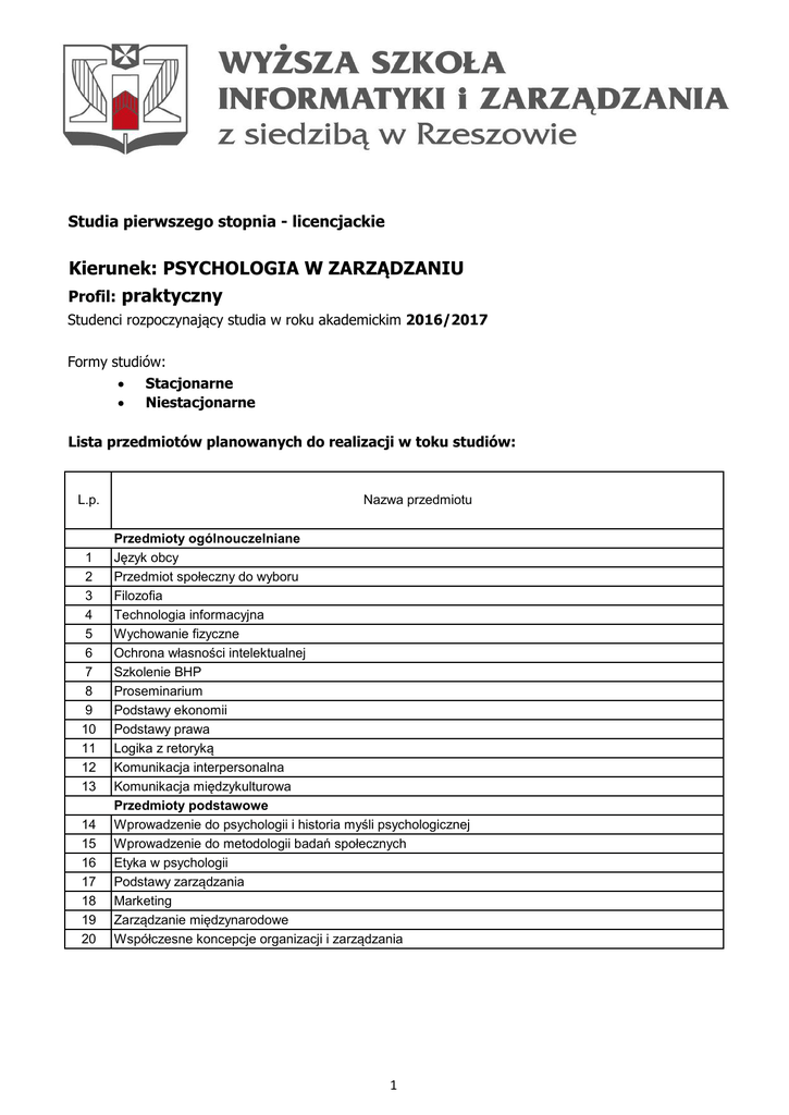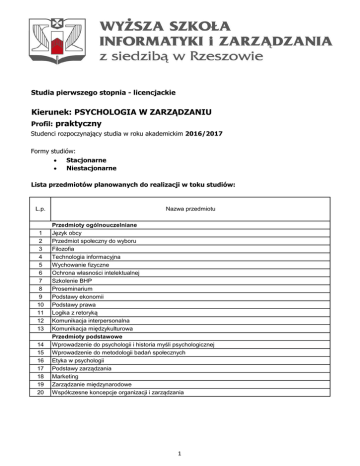 Studia pierwszego stopnia - licencjackie Kierunek: PSYCHOLOGIA W ZARZĄDZANIU Profil: praktyczny Studenci rozpoczynający studia w roku akademickim 2016/2017 Formy studiów: Stacjonarne Niestacjonarne Lista przedmiotów planowanych do realizacji w toku studiów: L.p. 1 2 3 4 5 6 7 8 9 10 11 12 13 14 15 16 17 18 19 20 Nazwa przedmiotu Przedmioty ogólnouczelniane Język obcy Przedmiot społeczny do wyboru Filozofia Technologia informacyjna Wychowanie fizyczne Ochrona własności intelektualnej Szkolenie BHP Proseminarium Podstawy ekonomii Podstawy prawa Logika z retoryką Komunikacja interpersonalna Komunikacja międzykulturowa Przedmioty podstawowe Wprowadzenie do psychologii i historia myśli psychologicznej Wprowadzenie do metodologii badań społecznych Etyka w psychologii Podstawy zarządzania Marketing Zarządzanie międzynarodowe Współczesne koncepcje organizacji i zarządzania 1 21 22 23 24 25 26 27 28 29 30 31 32 33 34 35 36 37 38 39 40 41 Przedmioty kierunkowe Psychologia osobowości i różnic indywidualnych Psychologia emocji i motywacji Psychologia poznawcza Psychologia społeczna Psychologia pracy i organizacji Psychologia podejmowania decyzji Podstawy psychopatologii Psychologia międzykulturowa Statystyka i komputerowa analiza danych Kierowanie zespołami ludzkimi Gra decyzyjna - zarządzanie przedsiębiorstwem Warsztat kompetencyjny Przedmiot do wyboru 1 Przedmiot do wyboru 2 Przedmiot do wyboru 3 Przedmiot do wyboru 4 Przedmiot specjalnościowy 1 Przedmiot specjalnościowy 2 Przedmiot specjalnościowy 3 Przedmiot specjalnościowy 4 Seminarium dyplomowe 42 Praktyka zawodowa Lp. Przedmiot społeczny do wyboru 1 2 Lp. 1 2 3 4 5 6 Kultury i cywilizacje Socjologia Przedmioty do wyboru (4 z 6) Psychologia marki Psychologia ekonomiczna Negocjacje w biznesie Społeczna odpowiedzialność biznesu Zarządzanie konfliktem Społeczne i psychologiczne oddziaływania mediów 2 Specjalność: Psychologia zachowań konsumenckich Lp. 1 2 3 4 Przedmioty specjalnościowe Psychologia konsumenta Badania marketingowe Strategie marketingowe Psychologiczne aspekty reklamy Specjalność: Zarządzanie zasobami ludzkimi Lp. 1 2 3 4 Przedmioty specjalnościowe Prawo międzynarodowe Gospodarka światowa Zarządzanie międzynarodowe Logistyka w obrocie mędzynarodowym 3