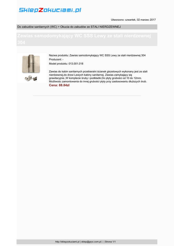 Utworzono: czwartek, 02 marzec 2017 Do zabudów sanitarnych (WC) > Okucia do zabudów ze STALI NIERDZEWNEJ Zawias samodomykający WC SSS Lewy ze stali nierdzewnej 304 Nazwa produktu: Zawias samodomykający WC SSS Lewy ze stali nierdzewnej 304 Producent: Model produktu: 013.001.018 Zawias do kabin sanitarnych przebieralni ścianek giszetowych wykonany jest ze stali nierdzewnej,do drzwi Lewych kabiny sanitarnej. Zawias zamykający się grawitacyjnie.,W komplecie śruby i podkładki,Do płyty grubości od 10 do 12mm. Możliwośc zamontowania do innej grubości płyty przy zastosowaniu dłuższych śrub. Cena: 88.84zł http://sklepzokuciami.pl | [email protected] | | Strona 1/1