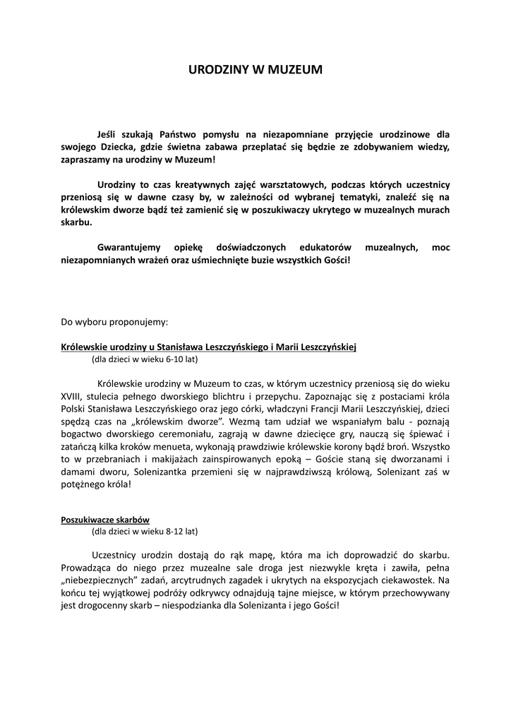 URODZINY W MUZEUM Jeśli szukają Państwo pomysłu na niezapomniane przyjęcie urodzinowe dla swojego Dziecka, gdzie świetna zabawa przeplatać się będzie ze zdobywaniem wiedzy, zapraszamy na urodziny w Muzeum! Urodziny to czas kreatywnych zajęć warsztatowych, podczas których uczestnicy przeniosą się w dawne czasy by, w zależności od wybranej tematyki, znaleźć się na królewskim dworze bądź też zamienić się w poszukiwaczy ukrytego w muzealnych murach skarbu. Gwarantujemy opiekę doświadczonych edukatorów niezapomnianych wrażeń oraz uśmiechnięte buzie wszystkich Gości! muzealnych, moc Do wyboru proponujemy: Królewskie urodziny u Stanisława Leszczyńskiego i Marii Leszczyńskiej (dla dzieci w wieku 6-10 lat) Królewskie urodziny w Muzeum to czas, w którym uczestnicy przeniosą się do wieku XVIII, stulecia pełnego dworskiego blichtru i przepychu. Zapoznając się z postaciami króla Polski Stanisława Leszczyńskiego oraz jego córki, władczyni Francji Marii Leszczyńskiej, dzieci spędzą czas na „królewskim dworze”. Wezmą tam udział we wspaniałym balu - poznają bogactwo dworskiego ceremoniału, zagrają w dawne dziecięce gry, nauczą się śpiewać i zatańczą kilka kroków menueta, wykonają prawdziwie królewskie korony bądź broń. Wszystko to w przebraniach i makijażach zainspirowanych epoką – Goście staną się dworzanami i damami dworu, Solenizantka przemieni się w najprawdziwszą królową, Solenizant zaś w potężnego króla! Poszukiwacze skarbów (dla dzieci w wieku 8-12 lat) Uczestnicy urodzin dostają do rąk mapę, która ma ich doprowadzić do skarbu. Prowadząca do niego przez muzealne sale droga jest niezwykle kręta i zawiła, pełna „niebezpiecznych” zadań, arcytrudnych zagadek i ukrytych na ekspozycjach ciekawostek. Na końcu tej wyjątkowej podróży odkrywcy odnajdują tajne miejsce, w którym przechowywany jest drogocenny skarb – niespodzianka dla Solenizanta i jego Gości! REGULAMIN IMPREZY - Urodziny w muzeum to przyjęcie dla dzieci połączone ze zwiedzaniem muzeum i warsztatem plastycznym Koszt imprezy jest jednocześnie opłatą za wstęp do muzeum i na wystawy - Urodziny trwają ok. 2 godzin - Wiek uczestników: 6 -10 lat (Królewskie urodziny) i 8-12 lat (Poszukiwacze skarbów), maksymalna liczba uczestników: 10 osób (wraz z Solenizantem); - Urodziny mogą odbywać się w piątki w godz. od 15:00 do 18:00 oraz w soboty w godz. od 11:00 do 14:00 - Przy organizacji urodzin obowiązuje zasada 1 impreza = 1 Solenizant (jedynym odstępstwem od tej reguły są urodziny rodzeństwa np. bliźniaków) Nie łączymy imprez urodzinowych różnych Solenizantów - Nie jest wymagana obecność rodziców - dzieci zostają pod opieką edukatorów muzealnych. Muzeum nie zapewnia organizacji czasu rodzicom, w soboty możliwe jest natomiast zwiedzenie Muzeum indywidualnie lub z przewodnikiem (cena biletów wstępu: 5 zł normalny, 3 zł ulgowy, 12 zł rodzinny; opłata za przewodnika wynosi 30 zł) . Prosimy, by na urodzinach pozostali jedynie opiekunowie Solenizanta. - Tort rodzice zamawiają we własnym zakresie w dowolnej cukierni – ze względów sanitarnych prosimy jednak o przedstawienie dowodu zakupu MUZEUM ZAPEWNIA: - Słone i słodkie przekąski (ciasteczka, chrupki) - Napoje (soki, woda mineralna) + szampan dla dzieci - Nakrycie stołu (jednorazowe talerzyki, kubeczki, serwetki), dekoracje, materiały plastyczne - Świeczki na tort - Oryginalne zaproszenia dla wszystkich uczestników. Zaproszenia do odbioru w Muzeum w indywidualnie uzgodnionym terminie - Solenizant otrzyma w prezencie płytę CD z fotografiami z imprezy oraz pamiątkowe zdjęcia w formacje 10x15: W wersji „Królewskie urodziny” każdy z uczestników otrzyma 2 pamiątkowe fotografie w strojach z epoki (1 zdjęcie portretowe + 1 zdjęcie grupowe) W wersji „Poszukiwacze skarbów” każdy z uczestników otrzyma 1 pamiątkową fotografię (zdjęcie grupowe). Zdjęcia do odbioru w Muzeum w indywidualnie uzgodnionym terminie. KOSZT IMPREZY 200 zł + tort opłaty dokonuje się w kasie muzeum* *Na tydzień przed wyznaczoną datą urodzin obowiązuje wpłacenie zaliczki w wysokości 50 zł ZGŁOSZENIA Zgłoszenia przyjmuje Dział Edukacji Tel. 65 5296140 wew. 27; E-mail: [email protected] Prosimy o rezerwację terminu urodzin z minimum dwutygodniowym wyprzedzeniem.