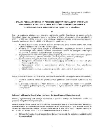 Załącznik nr 1 do uchwały Nr 130/2012 r. Senatu ASP w Gdańsku ZASADY PODZIAŁU DOTACJI NA POKRYCIE KOSZTÓW KSZTAŁCENIA W FORMACH STACJONARNYCH ORAZ OBLICZANIA KOSZTÓW KSZTAŁCENIA W FORMACH STACJONARNYCH W AKADEMII SZTUK PIĘKNYCH W GDAŃSKU §1 Przy wprowadzaniu pilotażowego programu rozliczania kosztów kształcenia na poszczególnych kierunkach stosuje się następujące zasady, wynikające z Ustawy o finansach publicznych (Dz. U. z 2009 r. Nr 157 poz. 1240 z późn. zm.) oraz z Ustawy o odpowiedzialności za naruszenie dyscypliny finansów publicznych (Dz. U. z 2005 r. Nr 14 poz. 114 z późn zm.): 1. Podstawę dysponowaniu środkami stanowi zatwierdzony przez rektora roczny plan (limit) wydatków podstawowej jednostki organizacyjnej. 2. Podstawę do podejmowania decyzji o wydatkowaniu przyznanych środków w ramach zatwierdzonego limitu stanowi imienne upoważnienie rektora do zaciągania zobowiązań finansowych w jednostce sektora finansów publicznych, 3. Z dysponowaniem środkami wiąże się podjęcie przez dysponenta odpowiedzialności zgodnie z przepisami Ustawy o odpowiedzialności z tytułu dyscypliny finansów publicznych, 4. Przekroczeniem dyscypliny finansów publicznych jest w szczególności: a) Zaciągniecie zobowiązań w kwocie przekraczającej zatwierdzony na dany rok plan finansowy jednostki, b) Wprowadzenie zmian w zatwierdzonym planie finansowym bez udzielonego upoważnienia, c) Udzielenie zamówienia z naruszeniem przepisów o zamówieniach publicznych. §2 Przy wydatkowaniu dotacji przyznanej na prowadzenie działalności obowiązują następujące zasady: 1. podstawą ustalenia limitów dla poszczególnych jednostek jest wysokość wydatków za rok 2011; 2. w pierwszej kolejności z dotacji pokrywane są w szczególności: koszty wynagrodzeń, zobowiązania publiczno-prawne, zobowiązania z tytułu zawartych umów z podmiotami zewnętrznymi. §3 I. Zasady obliczania dotacji algorytmicznej dla danej jednostki podstawowej Dotacją algorytmiczną jest dotacja wynikająca z podziału dotacji na działalność uczelni na poszczególne jednostki organizacyjne. Dotację algorytmiczną oblicza się na podstawie formuły opracowanej z wykorzystaniem algorytmu, opublikowanego w Rozporządzeniu Ministra Nauki i Szkolnictwa Wyższego z dnia 8 lutego 2012 r. w sprawie sposobu podziału dotacji z budżetu państwa dla uczelni publicznych i niepublicznych (Dz. U. z 2012 r. Nr 37 poz. 202), tj. z zastosowaniem następujących formuł: a) Obliczenie kwoty dotacji zasadniczej (algorytmicznej) dla podstawowej jednostki organizacyjnej: 1 Da,j - dotacja algorytmiczna dla podstawowej jednostki organizacyjnej Djp – dotacja dla jednostki w roku poprzednim Djo – dotacja dla jednostki w roku obecnym 0,70 – stała przeniesienia z roku poprzedniego 0,45 – waga składnika studencko-doktoranckiego Sj – składnik studencko-doktorancki dla podstawowej jednostki 0,40 – waga składnika kadrowego Kj – składnik kadrowy jednostki 0,05 – waga składnika zrównoważonego rozwoju Jj – składnik zrównoważonego rozwoju dla jednostki 0,05 – waga składnika badawczego Wj – składnik badawczy w podstawowej jednostce 0,05 – waga składnika uprawnień Uj – składnik uprawnień w podstawowej jednostce b) Obliczenie składnika organizacyjnej: studencko-doktoranckiego dla podstawowej 7 – liczba kierunków kształcenia w ASP 2,5 – wskaźnik kosztochłonności kierunków kształcenia w ASP/w jednostce Lsj – liczba studentów w podstawowej jednostce 1 – liczba dziedzin nauki uprawianych w ASP Ldj – liczba doktorantów w podstawowej jednostce Lscj – liczba studentów cudzoziemców w podstawowej jednostce 5 – liczba podstawowych jednostek w uczelni Lsu – liczba studentów w uczelni Ldu – liczba doktorantów w uczelni Lscu – liczba studentów cudzoziemców w uczelni 2 jednostki c) Obliczenie składnika kadrowego dla podstawowej jednostki organizacyjnej: Lprof,j – liczba profesorów w jednostce Lad,j – liczba adiunktów w jednostce Las,j – liczba asystentów w jednostce LZprof,j – liczba profesorów z zagranicy zatrudnionych w podstawowej jednostce Lprof,u – liczba profesorów w uczelni Lad,u – liczba adiunktów w uczelni Las,u – liczba asystentów w uczelni LZprof.,u – liczba profesorów z zagranicy zatrudnionych w uczelni d) Obliczenie składnika zrównoważonego rozwoju jednostki: Lprof,j – liczba profesorów zatrudnionych w jednostce Lad,j – liczba adiunktów zatrudnionych w jednostce SLj – suma liczb studentów stacjonarnych w jednostce Lprof,u – liczba profesorów w uczelni Lad,j – liczba adiunktów w uczelni SLu – suma liczb studentów e) Obliczenie składnika badawczego: LGj – liczba projektów badawczych jednostki LGu – liczba projektów badawczych uczelni f) Obliczenie składnika uprawnień: LUhab,j – liczba uprawnień do nadawania habilitacji w jednostce LUdr,j – liczba uprawnień do nadawania stopnia doktora w jednostce 3 LUhab,u – liczba uprawnień do nadawania habilitacji w uczelni LUdr,u – liczba uprawnień do nadawania stopnia doktora w uczelni II. Zasady obliczania kosztochłonności kierunku kształcenia Kosztochłonność kierunku kształcenia ustala się etapowo. Pierwszym etapem jest ustalenie kosztów całkowitych poprzez obliczenie sumy kosztów bezpośrednich i kosztów bezpośrednich i kosztów pośrednich: Kc=Kb+Kp Kc - koszty całkowite kształcenia na danym kierunku Kb – koszty bezpośrednie kształcenia na danym kierunku Kp – koszty pośrednie kształcenia na danym kierunku II a. Zasady obliczania kosztów bezpośrednich Kb=Kw+Km+Ke Kb – bezpośredni koszt kształcenia na kierunku X Kp – koszt pośredni kształcenia na kierunku X Kw - koszt wynagrodzeń z tytułu stosunku pracy i mianowania wraz z pochodnymi (ZUS, US, ZFŚS) oraz koszty wynagrodzeń z innych tytułów (w tym: godziny ponadwymiarowe) Km – koszt materiałów bezpośrednio przeznaczonych do prowadzenia zajęć dydakty