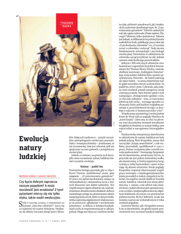 48 CORBIS TYGODNIK NAUKA Ewolucja natury ludzkiej MATEUSZ HOHOL I ŁUKASZ KWIATEK Czy bycie dobrym zaprzecza naszym popędom? A może moralność jest wrodzona? Z tymi pytaniami mierzy się nie tylko etyka, także nauki ewolucyjne. S pór o naturę ludzką, o odpowiedź na pytanie „kim jest człowiek?”, toczy się co najmniej od czasów Sokratesa. Niedawno do debaty toczonej dotąd przez filozo- tygodnik powszechny NEXTO : OrderID: 1848525 : Mateusz Hohol : [email protected] 31 | 3 sierpnia 2014 fów dołączyli naukowcy – przede wszystkim antropologowie ewolucyjni, prymatolodzy i neuropsycholodzy – przekonani, że nie zrozumiemy, kim jest człowiek, jeśli nie spojrzymy na nasz gatunek z perspektywy ewolucyjnej. Jednak, co ciekawe, na gruncie tych dyscyplin samo rozumienie natury ludzkiej również wyraźnie ewoluuje. Natura – padół łez Nowożytna biologia powstała, gdy w 1859 r. Karol Darwin opublikował swoje opus magnum – „O powstawaniu gatunków”. W pracy tej opisał mechanizmy stojące za różnorodnością i zmiennością życia, z których kluczowy jest dobór naturalny. We współczesnym ujęciu (Darwin nie znał mechanizmu dziedziczenia) działanie doboru naturalnego polega na promowaniu takich mutacji genetycznych, które w danym środowisku zapewnią organizmowi większą szansę na przeżycie, spłodzenie i wychowanie potomstwa – w efekcie, w kolejnych pokoleniach cechy te rozprzestrzenią się w całej populacji. Mogą one dotyczyć zarówno kształ- tu ciała, zdolności umysłowych, jak i tendencji do zachowań określonego typu. W „O powstawaniu gatunków” Darwin unikał jednak jak ognia rodowodu Homo sapiens. Dlaczego? Możemy tylko spekulować. Faktem jest jednak, że kilkanaście lat później Darwin nadrobił ten brak, publikując prace takie jak „O pochodzeniu człowieka” czy „O wyrazie uczuć u człowieka i zwierząt”. Stały się one fundamentem antropologii i psychologii ewolucyjnej. Darwinizm w odniesieniu do człowieka zaczął przybierać na sile. Jednak zarazem rosła liczba jego przeciwników. Jednym z XIX-wiecznych obrońców ewolucjonizmu i zagorzałym krytykiem kreacjonizmu był Thomas Henry Huxley, anatom, złośliwie nazywany „buldogiem Darwina”. Jego wizja natury ludzkiej była z gruntu pesymistyczna. Przyroda – do której zaliczają się także ludzie – to arena śmiertelnej walki, gdzie wszystkie chwyty są dozwolone. To padół łez, krwi i potu. Człowiek, jako jedyny twór ewolucji, potrafi zanegować swoją zwierzęcą naturę. Sam Huxley pisał o tym następująco: „Postępowanie zgodnie z tym, co etycznie najlepsze – tym, co nazywamy dobrocią lub cnotą – wymaga sposobu zachowania, który pod każdym względem pozostaje w przeciwieństwie do tego, co decyduje o sukcesie w kosmicznej walce o byt”. Współczesny prymatolog i ewolucjonista Frans de Waal zalicza poglądy Huxleya do „teorii fasady”. Głosi ona, że choć na pierwszy rzut oka jesteśmy istotami moralnymi, im głębiej wchodzimy w naturę ludzką, tym więcej widać w nas egoizmu i bezwzględności. Huxleyowska interpretacja darwinizmu w odniesieniu do natury ludzkiej nie była jednak jedyną. Piotr Kropotkin, znany dziś raczej jako „książę anarchistów”, a nie wybitny przyrodnik, opublikował w 1902 r. pracę „Pomoc wzajemna jako czynnik rozwoju społeczeństw”. Nawiązując bezpośrednio do darwinizmu, przekonany był on, że przyroda nie jest polem śmiertelnej walki, ale przestrzenią, w której organizmy koegzystują ze sobą harmonijnie, często wykazując się aktami altruizmu. Swoje poglądy Kropotkin wspierał obserwacjami współpracy wewnątrz- i międzygatunkowej (badania prowadził w trakcie ekspedycji na Syberię). Szczególny nacisk kładł na kwestię natury ludzkiej: człowiek jest istotą altruistyczną z natury, a nie wbrew niej. Innymi słowy, ludzki altruizm jest spontaniczny, a nie wynika z podporządkowania się odgórnym kodeksom etycznym czy przymusowi państwowemu. By być dobrymi, wcale nie musimy zaprzeczać wykształconym w toku ewolucji popędom. Zarówno Huxley, jak i Kropotkin uważali się za darwinistów, ale głosili jawnie przeciwstawne tezy na temat kondycji ludzkiej. Które poglądy są zatem rzeczywiście zgodne z teorią ewolucji? Jeden z najwybitniejszych współczesnych biologów, zmarły w 2005 r. Ernst Mayr, powiedział o Huxleyu, że „prawdziwie darwinowski sposób myślenia był mu całkowicie obcy”. Z drugiej strony, nawet pobieżna lektura prac Kropotkina pozwala się przekonać, że zbytnio idealizował on naturę ludzką, co wiązało się z jego poglądami politycznymi i postulatem uwolnienia ludzkości od przymusu państwowego. Egoistyczni altruiści Faktem jest jednak, że ewolucja samej teorii ewolucji przechyliła szalę zdecydowanie na korzyść optymistycznej wizji natury ludzkiej. Choć Darwin wskazał podstawowe mechanizmy ewolucji, był to dopiero początek. W pierwszej połowie XX w. darwinizm połączony został z genetyką, dzięki czemu powstała aktualna do dziś teoria określana jako „synteza ewolucyjna”. Wykorzystano w niej wyrafinowany aparat matematyczny (co czyni zadość ważnemu warunkowi „naukowości”: dobra teoria powinna być bowiem teorią zmatematyzowaną). Kolejna rewolucja dokonała się już w drugiej połowie ubiegłego stulecia za sprawą Williama Hamiltona. Pokazał on, że sukces ewolucyjny nie zależy tylko od pozostawienia jak największej liczby potomstwa. Hamilton zauważył, że podstawową jednostką, na którą działa opisany przez Darwina dobór naturalny, nie jest osobnik, ale gen. Ściśle rzecz biorąc, nie powinniśmy mówić więc o sukcesie ewolucyjnym osobnika, ale genów. Zważywszy na to, że nie tylko nasze potomstwo, ale i inni krewni (rodzeństwo, kuzyni) noszą kopie „naszych” genów, jesteśmy skłonni do opieki nad nimi, a czasem nawet do aktów heroizmu. Upraszczając: troszcząc się o krewnych