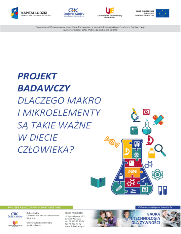 PROJEKT BADAWCZY DLACZEGO MAKRO I MIKROELEMENTY SĄ TAKIE WAŻNE W DIECIE CZŁOWIEKA? 1 Elżbieta Hoffmann-Guzik Barbara Rogala Nauka i technologia dla żywności szkoła podstawowa Tytuł projektu Dlaczego makro i mikroelementy są takie ważne w diecie człowieka? Wprowadzenie Składniki mineralne są to niezbędne do życia człowieka związki, zapewniające prawidłowy rozwój, reprodukcję oraz zdrowie przez cały okres trwania życia. Składnikami mineralnymi organizmów żywych nazywa się te składniki, które po spaleniu pozostają w postaci popiołu. Ze względu na zapotrzebowanie organizmu dzieli się je na dwie grupy: makroelementy i mikroelementy (pierwiastki śladowe). W przypadku człowieka makroelementami bywają nazywane pierwiastki, których zapotrzebowanie w diecie przekracza 100 mg na dobę. Mikroelementy, pierwiastki chemiczne występujące w bardzo małych (śladowych) ilościach w organizmach roślinnych i zwierzęcych. U ludzi zapotrzebowanie na te pierwiastki wynosi poniżej 100 mg na dobę. Do makroskładników należą : wapń, chlor, magnez, fosfor, potas, sód, siarka. Do mikroskładników zaliczamy: bor, kobalt, miedź, chrom, fluor, jod, żelazo, mangan, molibden, selen, krzem, cynk. Ludzki organizm nie ma możliwości wytwarzania składników mineralnych. Rośliny pozyskują je z gleby, a my z żywności, wody pitnej i wód mineralnych oraz suplementów diety. Zapewniają prawidłowy rozwój, reprodukcję oraz zdrowie przez cały okres trwania życia. Składniki mineralne w organizmie uczestniczą niemal we wszystkich procesach metabolicznych. Są nieodzowne w transporcie składników odżywczych, wytwarzaniu i odnowie jąder komórkowych, w syntezie niektórych witamin. Gdyby nie one, to człowiek byłby bezbronny wobec szkodliwego działania bakterii, wirusów lub wolnych rodników (selen, miedź). Są również budulcem kości, zębów, skóry i włosów (wapń, fosfor, magnez, siarka, fluor) oraz regulują gospodarkę wodno-elektrolitową i równowagę kwasowo-zasadową (sód, potas, chlor). Cel projektu: debata naukowa: „Makro i mikroelementy jakich nie znacie”: - prezentacja multimedialna - gazetka ścienna - plakat informacyjny - scenka tematyczna - quiz (gra karciana) - konkurs Cele kształcenia i wychowania - rozumienie pojęcia makro i mikroelementów, - rozpoznawanie pierwiastków chemicznych zaliczanych do makro i mikroelementów, - wskazywanie funkcji składników mineralnych w organizmie człowieka, - wskazywanie przykładów ( objawy i skutki) niedoboru makro i mikroelementów dla zdrowia człowieka, 2 - wskazywanie produktów żywnościowych będących źródłem konkretnych składników mineralnych, - ustalanie dziennego zapotrzebowania na makro i mikroelementy dziecka i dorosłego człowieka na podstawie tabeli żywieniowej, - odczytywanie wartości liczbowych zestawionych w tabelach, diagramach i wykresach, - analizowanie składu produktów żywnościowych zamieszczonego na etykiecie, opakowaniu, - tworzenie dziennego i tygodniowego menu dla ucznia szkoły podstawowej z uwzględnieniem zawartości makro i mikroelementów, - prezentowanie wyników badań z wykorzystaniem prezentacji przygotowanych z użyciem programu PowerPoint, - prezentowanie efektów własnej pracy i uzasadnianie swojego stanowiska, - współpraca w grupie (odpowiedzialne pełnienie przyjętych ról społecznych), - ocena pracy własnej i innych. Pytanie kluczowe Dlaczego makro i mikroelementy są tak ważne w codziennej diecie człowieka? 3 Etapy projektu Etapy Przygotowanie Planowanie Realizacja Prezentacja Działania 1. Zapoznanie uczniów z tematem, celami projektu i planowanym efektem końcowym. 2. Przedstawienie uczniom wstępnej instrukcji do realizacji szczegółowych zadań. 3. Podział uczniów na zespoły. 4. Dyskusja nad sposobami prezentacji 5. Przedstawienie nauczycieli czuwających nad konkretnym zdaniami 1. Analiza treści projektu 2. Ustalenie zadań dla zespołów 3. Omówienie zadań (praca samodzielna, dom, biblioteka, konsultacje z nauczycielami, zasady pracy w terenie i podczas przeprowadzania doświadczeń) 4. Ustalenie harmonogramu realizacji zadań. 5. Ustalenie terminów konsultacji . 6. Omówienie zasad współpracy w zespole. 7. Ustalenie zasad samooceny uczniów i oceny koleżeńskiej. 8. Podpisanie kontraktów. 1. Szukanie informacji na temat znaczenia makro i mikroelementów dla prawidłowego funkcjonowania organizmu człowieka. 2. Szukanie informacji na temat źródeł makro i mikroelementów. 3. Wskazanie miejsca makro i mikroelementów w układzie okresowym pierwiastków i określanie ich własności. 4. Układanie menu zapewniającego właściwą ilość składników mineralnych na podstawie informacji zawartych w tabelach żywieniowych. 5. Wykonanie prezentacji multimedialnych, gazetek, plakatów, innych form prezentacji. 1. Debata naukowa. Czyli każda grupa przygotowuje część wspólnej prezentacji i elementy typu gazetki, .. 2. Prezentacja multimedialna. 3. Wystawa połączona z degustacją. 4. Scenka tematyczna. 5. Quiz – gra karciana. 6. Konkurs. 4 Szczegółowy opis działań na etapie realizacji L.p. 1 Zespół Treści uczniów Wszyscy Znaczenie makro uczestnicy i mikroelementów projektu w funkcjonowaniu organizmu człowieka Źródła makro i mikroelementów w diecie człowieka. Sposób realizacji zadania Efekt realizacji zadania Wsparcie - Zajęcia z nauczycielem – skojarzenia i doświadczenia życiowe uczniów, burza mózgów. - Wyodrębnienie głównych „składowych” i problemów w ramach tematu: składniki mineralne w żywieniu, rola składników mineralnych w funkcjonowaniu organizmu człowieka, objawy i skutki niedoboru i nadmiaru składników mineralnych, źródła składników mineralnych w diecie człowieka. - Losowanie lub wybór zagadnień do realizacji przez poszczególne zespoły. - Omówienie sposobów realizacji zadań w poszczególnych grupach zadaniowych. - Ustalenie zasad oceny pracy uczniów i