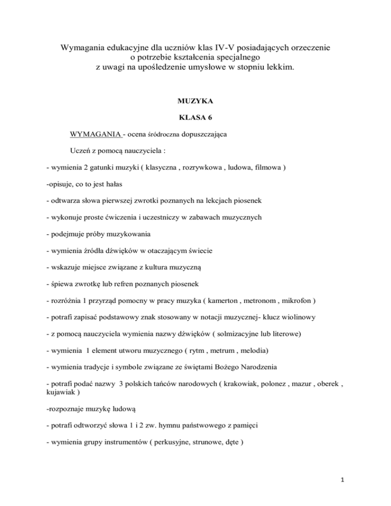 Wymagania edukacyjne dla uczniów klas IV-V posiadających orzeczenie o potrzebie kształcenia specjalnego z uwagi na upośledzenie umysłowe w stopniu lekkim. MUZYKA KLASA 6 WYMAGANIA - ocena śródroczna dopuszczająca Uczeń z pomocą nauczyciela : - wymienia 2 gatunki muzyki ( klasyczna , rozrywkowa , ludowa, filmowa ) -opisuje, co to jest hałas - odtwarza słowa pierwszej zwrotki poznanych na lekcjach piosenek - wykonuje proste ćwiczenia i uczestniczy w zabawach muzycznych - podejmuje próby muzykowania - wymienia źródła dźwięków w otaczającym świecie - wskazuje miejsce związane z kultura muzyczną - śpiewa zwrotkę lub refren poznanych piosenek - rozróżnia 1 przyrząd pomocny w pracy muzyka ( kamerton , metronom , mikrofon ) - potrafi zapisać podstawowy znak stosowany w notacji muzycznej- klucz wiolinowy - z pomocą nauczyciela wymienia nazwy dźwięków ( solmizacyjne lub literowe) - wymienia 1 element utworu muzycznego ( rytm , metrum , melodia) - wymienia tradycje i symbole związane ze świętami Bożego Narodzenia - potrafi podać nazwy 3 polskich tańców narodowych ( krakowiak, polonez , mazur , oberek , kujawiak ) -rozpoznaje muzykę ludową - potrafi odtworzyć słowa 1 i 2 zw. hymnu państwowego z pamięci - wymienia grupy instrumentów ( perkusyjne, strunowe, dęte ) 1 WYMAGANIA - ocena roczna dopuszczająca Uczeń : - rozpoznaje jeden z tańców i muzyki innych narodów - wymienia 2 instrumenty z grupy aerofonów - odtwarza słowa poznanych piosenek - podejmuje próby gry fragmentu prostych melodii na dzwonkach chromatycznych - potrafi wskazać dźwięk ze znakiem chromatycznym w zapisie - rozpoznaje brzmienie gamy dur - zna 2 rodzaje głosów w muzyce - wymienia jeden typ zespołu muzycznego - wymienia 1 poznanego kompozytora - śpiewa fragment poznanych piosenek WYMAGANIA - ocena śródroczna dostateczna Uczeń : - wymienia gatunki muzyki ( klasyczna , rozrywkowa , ludowa, filmowa ) - wyjaśnia pojęcie hałasu - odtwarza słowa poznanych na lekcjach piosenek - wykonuje proste ćwiczenia i uczestniczy w zabawach muzycznych - podejmuje próby muzykowania - wymienia źródła dźwięków w otaczającym świecie - wyjaśnia pojęcie hałasu - wskazuje miejsca związane z kultura muzyczną - śpiewa część poznanych piosenek - rozróżnia przyrządy pomocne w pracy muzyka ( kamerton , metronom , mikrofon ) 2 - potrafi zapisać podstawowe znaki stosowane w notacji muzycznej - z pomocą nauczyciela wymienia nazwy dźwięków ( solmizacyjne , literowe) - wymienia elementy utworu muzycznego ( rytm , metrum , melodia) - wymienia tradycje i symbole związane ze świętami Bożego Narodzenia - potrafi podać nazwy polskich tańców narodowych ( krakowiak, polonez , mazur , oberek , kujawiak ) - wie, co to jest muzyka ludowa - potrafi odtworzyć słowa hymnu państwowego z pamięci - wymienia grupy instrumentów ( perkusyjne, strunowe, dęte ) WYMAGANIA - ocena roczna dostateczna Uczeń : - rozpoznaje wybrane jeden z tańców i muzyki innych narodów - wymienia instrumenty z grupy aerofonów - odtwarza słowa poznanych piosenek - podejmuje próby gry prostych melodii na dzwonkach chromatycznych - potrafi wskazać dźwięk ze znakiem chromatycznym w zapisie - rozpoznaje brzmienie gamy dur i moll - zna rodzaje głosów w muzyce - wymienia jeden typ zespołu muzycznego - wymienia poznanych kompozytorów - śpiewa część poznanych piosenek 3 WYMAGANIA - ocena śródroczna dobra Uczeń : - potrafi wymienić i opisać dźwięki w otaczającym świecie - wskazuje źródła hałasu - wyjaśnia w jaki sposób należy dbać o środowisko przyrodnicze - wymienia elementy budowy dzieła muzycznego - śpiewa w całości poznane piosenki-wyjaśnia znaczenie dynamiki i tempa w utworze muzycznym - wymienia miejsca w których można posłuchać poszczególnych gatunków muzyki - rozróżnia znaki stosowane w notacji muzycznej i określa ich funkcje - wymienia wartości rytmiczne - prawidłowo określa położenie nut na pięciolinii - potrafi wskazać dźwięk ze znakiem chromatycznym - potrafi wytłumaczyć rolę poszczególnych elementów utworu muzycznego ( rytm, metrum , melodia) - podaje podstawowe schematy taktowania - wymienia podstawowe oznaczenia tempa i artykulacji oraz znaki dynamiczne WYMAGANIA - ocena roczna dobra Uczeń : - wymienia wybrane formy muzyczne ( pieśń , rondo , wariacja, opera ) - gra na instrumencie trójdźwięk i potrafi dowolny trójdźwięk zapisać - rozróżnia w brzmieniu tryb durowy i molowy gamy - wyjaśnia pojęcia : muzyka jednogłosowa i wielogłosowa - potrafi wymienić elementy folkloru oraz polskie regiony folklorystyczne - wyjaśnia znaczenie niektórych tradycji i symboli związanych ze świętem Wielkanocy 4 - potrafi podać przykłady grup instrumentów - wymienia różne typy zespołów wokalnych i instrumentalnych - przedstawia krótko sylwetkę jednego kompozytora muzyki polskiej lub światowej - aktywnie uczestniczy w ćwiczeniach i zabawach muzycznych - odtwarza słowa i melodię poznanych na lekcjach piosenek - muzykuje samodzielnie w prostych ćwiczeniach muzycznych - współpracuje w grupie WYMAGANIA - ocena śródroczna bardzo dobra Uczeń : - klasyfikuje źródła dźwięków w otaczającym świecie - dostrzega i analizuje problemy ekologiczne - wyjaśnia wpływ hałasu na samopoczucie i zdrowie człowieka - wyjaśnia pojęcia: skala , gama, interwał, cały ton, półton, akord - wyjaśnia zasady budowy dzieła muzycznego - potrafi wytłumaczyć czym się zajmuje etnograf - śpiewa z pamięci poznane piosenki - wyjaśnia pojęcia : skala, gama, interwał, cały ton, półton, akord - potrafi wytłumaczyć czym zajmuje się etnograf na przykładzie działalności Oskara Kolberga - opisuje wybrane instrumenty i przyporządkowuje je do odpowiedniej grupy - przedstawia sylwetki wybitnych kompozytorów muzyki polskiej i światowej - rozpoznaje wysłuchane wcześniej utwory muzyczne - chętnie śpiewa i muzykuje wykorzystują