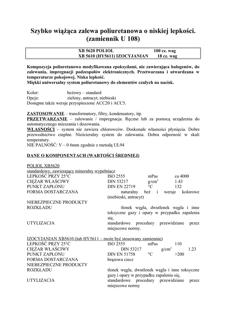 Szybko wiążąca zalewa poliuretanowa o niskiej lepkości. (zamiennik U 108) XB 5620 POLIOL XB 5610 (HY5611) IZOCYJANIAN 100 cz. wag 18 cz. wag Kompozycja poliuretanowa modyfikowana epoksydami, nie zawierająca halogenów, do zalewania, impregnacji podzespołów elektronicznych. Przetwarzana i utwardzana w temperaturze pokojowej. Niska lepkość. Miękki uniwersalny system poliuretanowy do elementów czułych na nacisk. Kolor: beżowy – standard Opcje: zielony, antracyt, niebieski Dostępne także wersje przyspieszone ACC20 i ACC5. ZASTOSOWANIE – transformatory, filtry, kondensatory, itp. PRZETWARZANIE – zalewanie / impregnacja. Ręczne lub za pomocą urządzenia do automatycznego mieszania i dozowania. WŁASNOŚCI – system nie zawiera chlorowców. Doskonałe własności płynięcia. Dobre przewodnictwo cieplne. Nieścieralny system do zalewania. Dobra odporność w skali temperatury. NIE PALNOŚĆ: V – 0 6mm zgodnie z metodą UL94 DANE O KOMPONENTACH (WARTOŚCI ŚREDNIEJ) POLIOL XB5620 standardowy, zawierający mineralny wypełniacz LEPKOŚĆ PRZY 25°C ISO 2555 mPas ca 4000 3 CIĘŻAR WŁAŚCIWY DIN 53217 g/cm 1.43 PUNKT ZAPŁONU DIN EN 22719 °C 132 FORMA DOSTARCZANA naturalny beż i wersje kolorowe (niebieski, antracyt) NIEBEZPIECZNE PRODUKTY ROZKŁADU tlenek węgla, dwutlenek węgla i inne toksyczne gazy i opary w przypadku zapalenia się, UTYLIZACJA standardowe procedury przewidziane przez miejscowe normy. IZOCYJANIAN XB5610 (lub HY5611 – może być stosowany zamiennie) LEPKOŚĆ PRZY 25°C ISO 2555 mPas 110 CIĘŻAR WŁAŚCIWY DIN 53217 g/cm3 1.23 PUNKT ZAPŁONU DIN EN 51758 °C >200 FORMA DOSTARCZANA brązowa ciecz NIEBEZPIECZNE PRODUKTY ROZKŁADU tlenek węgla, dwutlenek węgla i inne toksyczne gazy i opary w przypadku zapalenia się, UTYLIZACJA standardowe procedury przewidziane przez miejscowe normy PRZECHOWYWANIE: Przechowywać składniki w suchym miejscu w temperaturze 18 – 25 °C, w szczelnych opieczętowanych oryginalnych pojemnikach. W tych warunkach okres składowania będzie zgodny z datą na etykiecie, Po upływie tej daty, produkt może być przetwarzany tylko po ponownej analizie. Częściowo puste pojemniki powinny być szczelnie zamknięte natychmiast po użyciu. Informacje o usunięciu odpadów i niebezpiecznych produktów rozkładu w przypadku pożaru zawarte są w kartach bezpieczeństwa Material Safety Date Sheets (MSDS) dla poszczególnych produktów. STOSUNEK MIESZNIA XB 5620 Poliol XB 5610 Izocyjanin wagowo 100 18 objętościowo 100 21 UWAGA: Zmiana zawartości utwardzacza do żywicy powoduje zmiane końcowych parametrów mechanicznych utwardzonej kompozycji: a) proporcja XB5620/5610 100:15 cz.w. – kompozycja bardzo elastyczna (50ShA) b) proporcja XB5620/5610 100:25 cz.w. – kompozycja twarda (ok. 60 – 70 ShD) DANE PRZETWARZANIA ZMIESZANY SYSTEM LEKPOŚĆ PRZY 25°C ŻELOWANIE PRZY 25°C XB 5620/XB5610 XB 5620ACC20 / 5610 XB 5620ACC5 / 5610 DIN 53019 mPas (norma żelowania) min min min 2700 = 10S-1 110 20 5 ŻYWOTNOŚĆ / CZAS „ŻYCIA” MIESZANINY (czas osiągnięcia 5000 mPas) XB 5620/XB5610 min 138 XB 5620ACC20 / 5610 min ok. 5 XB 5620ACC5 / 5610 min ok. 1 MINIMALNE CYKLE UTWARDZANIA XB 5620 / 5610 24h w temp. Pokojowej lub 6h przy 80°C XB 5620 zawiera wypełniacz, który ma tendencję osadzania po pewnym czasie. Dlatego zaleca się starannie wymieszać całą zawartość pojemnika przed użyciem. W zbiornikach urządzenia produkcyjnego, produkty przed napełnieniem powinny być od czasu do czasu mieszane aby uniknąć sedymentacji i nieprawidłowości w zmieszaniu. MECHANICZNE I FIZYCZNE WŁAŚCIWOŚCI XB5620/XB5610 KOMPOZYCJA UTWARDZONA Określana na standardowych próbkach testowych przy 25°C Utwardzana przez 24h/23°C + 6h/80°C CIĘŻAR WŁAŚCIWY DIN 55990 g/cm3 1.46 TEMPERATURA ZASZKLENIA ISO 6721/94 °C -5 MAX TEMPERATURA PRACY IEC 85 °C 110 WYTRZYMAŁOŚĆ NA ROZCIĄGANIE ISO 527 Mpa 1.5 WYDŁUŻANIE DO ZERWANIA ISO 527 % 76 WSPÓŁCZYNNIK LINIOWEJ ROZSZERZALNOŚCI CIEPLNEJ (20 – 50°C) DIN 53752 ppm/K 158 TWARDOŚĆ W SKALI SHORE-A DIN 53505 ---70 ShA PALNOŚĆ V – 0 (6mm) według metody UL 94 Końcowe zatwierdzenia zadania UL ABSORBACJ WODY (próbka 50x50x4 mm) 1 dzień przy 23°C % 0.19 wagowych 10 dni przy 23°C % 0.56 wagowych 30 dni przy 23°C % 0.41 wagowych WŁAŚCIWOŚCI ELEKTRYCZNE Określana na standardowych testach próbek przy 25°C Utwardzana przez 24h/23°C + 6h/80° C WYTRZYMAŁOŚĆ DIELEKTRYCZNA (próbka 2mm) IEC 243-1 PRZEWODNOŚĆ CIEPLNA ISO 8894/90 WSPÓŁCZYNNIK STRATNOŚCI DIELEKTRYCZNEJ (tan , 50Hz, 25°C) IEC 250 STAŁA DIELEKTRYCZNA (r, 50Hz, 25°C) IEC 250 OPORNOŚĆ SKROŚNA (, 50Hz, 25°C) IEC 93cm KOROZJA ELEKTROLITYCZNA IEC 426 ODPORNOŚĆ NA PRĄDY PEŁZAJĄCE IEC 112 kV/mm W/mk 0.52 % ---stopień CTI>600 18.3 9.5 7.4 6.8x1012 A/1 UWAGI Aby określić czy stopień sieciowania został doprowadzony do końca i ostateczne właściwości są optymalne, konieczne jest wykonanie stosownych pomiarów na konkretnych przedmiotach lub zmierzyć temperaturę zeszklenia. Różne cykle żelowania i życia w procesie produkcji u klienta, może doprowadzić do różnych stopni sieciowania i wobec tego różnej temperatury zeszklenia. PRZEPISY BHP Obowiązkowe i zalecane przepisy higieny przemysłowej powinny być przestrzegane, kiedykolwiek reaktywne zestawy żywiczne są przenoszone i przetwarzane. Dodatkowe informacje należy szukać w broszurze „Hygenic proceutions for handling plastics products of Ciba – Geigy” HIGIENA PRZEMYSŁOWA Warunki bezpieczeństwa w miejscu pracy ubrania ochronne ogólne rękawice niezbędne zabezpieczenie ramion zalecane gdy istnieje możliwość kontaktu ze skóra gogle / okulary ochronne tak maska gazowa / pyłowa ---Ochrona skóry przed rozpoczęciem pracy nanieść warstwę kremu ochronnego na skórę po umyciu nanieść warstwę kremu ochronnego lub spożywczego Oczyszczanie pozostałości ze skóry zetrzeć papierem, umyć gorącą wodą i mydłem wolnym od 