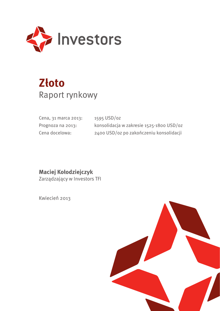 Złoto Raport rynkowy Cena, 31 marca 2013: 1595 USD/oz Prognoza na 2013: konsolidacja w zakresie 1525-1800 USD/oz Cena docelowa: 2400 USD/oz po zakończeniu konsolidacji Maciej Kołodziejczyk Zarządzający w Investors TFI Kwiecień 2013 „Przy braku standardu złota nie ma sposobu, by zabezpieczyć oszczędności przed konfiskatą przez inflację. Nie ma bezpiecznego sposobu na utrzymanie wartości.” Alan Greenspan, szef Zarządu Rezerwy Federalnej 1987-2006 Główne wnioski Trwa kontynuacja półtorarocznej konsolidacji. Po znaczących wzrostach w sierpniu i wrześniu 2012 roku do poziomu 1800 USD/oz, ceny złota powróciły w okolice 1600 USD/oz. Naszym zdaniem zakończy się ona zwyżkami cen złota, ze względu na następujące pozytywne czynniki: ▪▪ ▪▪ ▪▪ ▪▪ ▪▪ Ujemne realne stopy procentowe oraz zakupy złota przez banki centralne na potrzeby dywersyfikacji rezerw walutowych. Inwestycje banków centralnych w kruszec utrzymują się na poziomie najwyższym od ponad 40 lat. Bardzo wysoki dodruk pieniądza przez banki centralne doprowadzi w nadchodzących latach do inflacji. Wskaźniki sentymentu inwestorów kształtują się na bardzo niskich poziomach. Jest to tzw. wskaźnik przeciwstawny (ang. contrarian indicator), sugerujący wzrosty. Gwałtowne zbudowanie rekordowych pozycji krótkich przez fundusze na „papierowym” rynku futures. Fundusze zazwyczaj odkupują kontrakty terminowe po kilku miesiącach, co powinno wesprzeć ceny złota. Analiza techniczna wskazuje, że wciąż pozostajemy w osiemnastomiesięcznej konsolidacji, podobnej do trzech zanotowanych podczas 12 lat obecnej hossy. Najważniejszym obecnie zagrożeniem dalszych wzrostów byłby wzrost stóp procentowych spowodowany wzrostem gospodarczym w USA - takie ryzyko widzą analitycy zagranicznych banków inwestycyjnych. str. 2 Spis treści Główne wnioski 2 Czynniki fundamentalne 4 Stopy procentowe 4 Kreacja pieniądza 5 Złoto jako pieniądz 6 Inflacja 7 Popyt inwestycyjny 9 Banki centralne 9 Fundusze typu ETF 10 Chiny 11 Rynek futures 11 Sentyment inwestorów 12 Analiza techniczna 13 Cypr - niebezpieczny precedens 14 Podsumowanie i prognoza 14 str. 3 Czynniki fundamentalne wpływające na kurs złota W ciągu ostatnich kilku miesięcy analitycy gremialnie obniżyli prognozy ceny złota na 2013 i 2014 rok. Argumentami (przedstawionym przez banki inwestycyjne) przemawiającymi przeciwko wzrostom ceny kruszcu w 2013 roku miało być ożywienie gospodarcze w USA i związane z tym faktem wcześniejsze wzrosty stóp procentowych oraz kontynuowanie hossy na rynkach akcji. To z kolei spowodowałoby spadek atrakcyjności złota. O ile argument o wpływie wzrostów stóp procentowych ma duże znaczenie (jest to naszym zdaniem najważniejszy czynnik kształtujący popyt inwestycyjny w długim okresie), o tyle wiązanie spadków cen złota z wzrostem gospodarczym czy zwyżkami na rynkach akcji nie jest trafne. Przypomnijmy, że w latach 2001-2012 cena złota rosła 12 lat z rzędu. W tym czasie w USA przeważały okresy ekspansji gospodarczej (lata 2002-2007 oraz okres od drugiej połowy 2009 do końca 2012 roku). W sumie podczas tych 12 lat tylko około 2,5 roku charakteryzowało się obniżoną aktywnością gospodarczą (recesją) w USA. Jak widzimy, złoto może rosnąć podczas okresów ekspansji gospodarczej. Ba, podczas ostatnich kilkunastu lat 100% procent okresów ekspansji gospodarczej wiązało się ze wzrostami cen złota. Z drugiej strony lata 80-te i 90te XX wieku charakteryzowały się przeciwną dynamiką – rozwojowi gospodarczemu w USA towarzyszył powolne dryfowanie kursów złota w dół. Być może złoto w takim razie nie radzi sobie dobrze w okresach koniunktury na rynkach akcji w USA? Poniższa tabela podsumowuje zależności pomiędzy zmianą indeksu S&P 500, a sytuacją na rynku złota podczas ostatnich 12 lat (30 III 2001 – 12 III 2013). Tabela 1. Częstość występowania poszczególnych kombinacji wzrostów i spadków cen złota i zmian wartości indeksu S&P 500 (2001-2013, w okresach tygodniowych) Wzrost cen złota Spadek cen złota Wzrost indeksu S&P 500 33,7% 21,4% Spadek indeksu S&P 500 24,5% 20,4% Źródło: Obliczenia własne na podstawie danych stooq.pl Jak wynika z powyższych danych, przy założeniu, że ceny akcji będą rosnąć, powinniśmy się raczej spodziewać wzrostów ceny złota – działo się tak w około 61% przypadków (33,7%/(33,7%+21,4%) = 61%). Jednakże siła tej korelacji jest bardzo niska – wynosi zaledwie +4%. Jest to zgodne z wieloletnim doświadczeniem wskazującym, że zmiany indeksów akcji oraz ceny złota nie są skorelowane i mogą poruszać się zarówno w tym samym, jak i w przeciwnych kierunkach. Stawianie tezy, że kurs kruszcu spadnie w wyniku wzrostów cen akcji nie ma potwierdzenia w danych historycznych. Gdyby taka sytuacja miała zaistnieć, powodów należałoby szukać gdzie indziej niż we wzroście cen akcji. Niskie stopy procentowe sprzyjają wzrostom cen złota Jak wspomnieliśmy wcześniej, jednym z najważniejszych czynników wpływających na popyt inwestycyjny na złoto jest poziom realnych stóp procentowych. W ciągu ostatnich 12 lat hossy, podobnie jak podczas wzrostów w latach 70-tych ubiegłego stulecia, dominowały okresy charakteryzujące się ujemnymi realnymi stopami procentowymi. Amerykański bank centralny zakłada, że stopy procentowe będą utrzymywane na poziomie zbliżonym do zera przynajmniej do końca 2014 roku. Na posiedzeniu w marcu 2013 roku tylko jeden członek rady opowiadał się za zaostrzeniem polityki monetarnej w 2013 roku, czterech w 2014 roku, trzynastu optowało za 2015 rokiem, jeden za 2016 rokiem. Popyt inwestycyjny ma największy wpływ na kształtowanie się ceny złota. Wiąże się on z tradycyjną rolą kruszcu jako pieniądza, którą dzierżył od co najmniej 2700 lat. Czynnikami w największym stopniu wpływającymi na relatywne kursy różnych walut są podaż oraz sto