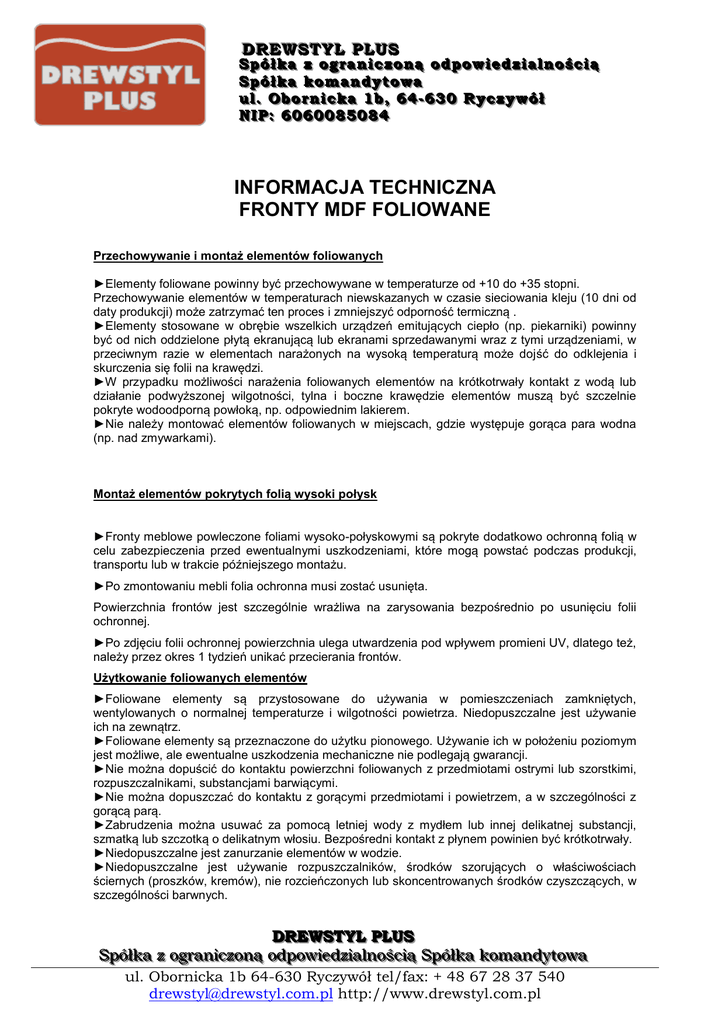 D DR RE EW WS ST TY YLL P PLLU US S SSppóółłkkaa zz ooggrraan niicczzoon nąą ooddppoow wiieeddzziiaalln noośścciiąą SSppóółłkkaa kkoom a n d y t o w a mandytowa uull.. O Obboorrn niicckkaa 1 1bb,, 664 4--663 30 0R Ryycczzyyw wóółł N I P : 6 0 6 0 0 8 5 0 8 4 NIP: 6060085084 INFORMACJA TECHNICZNA FRONTY MDF FOLIOWANE Przechowywanie i montaż elementów foliowanych ►Elementy foliowane powinny być przechowywane w temperaturze od +10 do +35 stopni. Przechowywanie elementów w temperaturach niewskazanych w czasie sieciowania kleju (10 dni od daty produkcji) może zatrzymać ten proces i zmniejszyć odporność termiczną . ►Elementy stosowane w obrębie wszelkich urządzeń emitujących ciepło (np. piekarniki) powinny być od nich oddzielone płytą ekranującą lub ekranami sprzedawanymi wraz z tymi urządzeniami, w przeciwnym razie w elementach narażonych na wysoką temperaturą może dojść do odklejenia i skurczenia się folii na krawędzi. ►W przypadku możliwości narażenia foliowanych elementów na krótkotrwały kontakt z wodą lub działanie podwyższonej wilgotności, tylna i boczne krawędzie elementów muszą być szczelnie pokryte wodoodporną powłoką, np. odpowiednim lakierem. ►Nie należy montować elementów foliowanych w miejscach, gdzie występuje gorąca para wodna (np. nad zmywarkami). Montaż elementów pokrytych folią wysoki połysk ►Fronty meblowe powleczone foliami wysoko-połyskowymi są pokryte dodatkowo ochronną folią w celu zabezpieczenia przed ewentualnymi uszkodzeniami, które mogą powstać podczas produkcji, transportu lub w trakcie późniejszego montażu. ►Po zmontowaniu mebli folia ochronna musi zostać usunięta. Powierzchnia frontów jest szczególnie wrażliwa na zarysowania bezpośrednio po usunięciu folii ochronnej. ►Po zdjęciu folii ochronnej powierzchnia ulega utwardzenia pod wpływem promieni UV, dlatego też, należy przez okres 1 tydzień unikać przecierania frontów. Użytkowanie foliowanych elementów ►Foliowane elementy są przystosowane do używania w pomieszczeniach zamkniętych, wentylowanych o normalnej temperaturze i wilgotności powietrza. Niedopuszczalne jest używanie ich na zewnątrz. ►Foliowane elementy są przeznaczone do użytku pionowego. Używanie ich w położeniu poziomym jest możliwe, ale ewentualne uszkodzenia mechaniczne nie podlegają gwarancji. ►Nie można dopuścić do kontaktu powierzchni foliowanych z przedmiotami ostrymi lub szorstkimi, rozpuszczalnikami, substancjami barwiącymi. ►Nie można dopuszczać do kontaktu z gorącymi przedmiotami i powietrzem, a w szczególności z gorącą parą. ►Zabrudzenia można usuwać za pomocą letniej wody z mydłem lub innej delikatnej substancji, szmatką lub szczotką o delikatnym włosiu. Bezpośredni kontakt z płynem powinien być krótkotrwały. ►Niedopuszczalne jest zanurzanie elementów w wodzie. ►Niedopuszczalne jest używanie rozpuszczalników, środków szorujących o właściwościach ściernych (proszków, kremów), nie rozcieńczonych lub skoncentrowanych środków czyszczących, w szczególności barwnych. D DR RE EW WS ST TY YLL P PLLU US S S Sppóółłkkaa zz ooggrraan niicczzoon nąą ooddppoow wiieeddzziiaalln noośścciiąą S Sppóółłkkaa kkoom maan nddyyttoow waa ul. Obornicka 1b 64-630 Ryczywół tel/fax: + 48 67 28 37 540 [email protected] http://www.drewstyl.com.pl D DR RE EW WS ST TY YLL P PLLU US S SSppóółłkkaa zz ooggrraan niicczzoon nąą ooddppoow wiieeddzziiaalln noośścciiąą SSppóółłkkaa kkoom a n d y t o w a mandytowa uull.. O Obboorrn niicckkaa 1 1bb,, 664 4--663 30 0R Ryycczzyyw wóółł N I P : 6 0 6 0 0 8 5 0 8 4 NIP: 6060085084 ►Zabrudzenia spowodowane substancjami o mocnym zabarwieniu, jak herbata, kawa, czerwone wino, curry, musztarda należy jak najszybciej spłukać wodą, lub przetrzeć wilgotną szmatką. ►Nie należy pozostawiać plam do zaschnięcia, gdyż mogą one na stałe przebarwić powierzchnię. ►Nie należy stosować szczotek o twardym włosiu, a także mocnych środków szorujących i wybielających. W przypadku elementów wysoko połyskowych ►Przez okres 1 tygodnia, od ściągnięcia folii ochronnej, następuje utwardzenie powierzchni i powinno się w tym okresie uniknąć przecierania elementów. ►Zaleca się zastosować preparat Hochglanz Mobelpolish. Tworząc cieniutką warstwę na froncie ulega utwardzeniu i podwyższa odporność powierzchni na zadrapania oraz zabezpiecza przed działaniem promieni słonecznych, środków czyszczących i tłustych plam. ►Produkt ten jest mocno skoncentrowany i powinien być nakładany w minimalnej ilości. Ilość 50 ml jest wystarczająca na 6-10 m2. Po nałożeniu należy całość wypolerować miękką szmatką bawełnianą lub z mikrofibry (dostępną wraz z pastą). Czynność tą zaleca się stosować średnio, co rok, w celu lepszego zabezpieczenia powierzchni. ►Środki czyszczące nie powinny zawierać substancji ściernych tj. cząsteczek ściernych znajdujących się w proszkach i różnego rodzaju mleczkach czyszczących, gdyż mogą one pozostawić rysy na powierzchni, a tym samym zmienić stopień połysku powierzchni. ►Środki czyszczące nie powinny zawierać substancji utleniających (np. chlorany, nadborany, wybielacze) oraz silnych alkaliów (koncentrat amoniaku, wodorotlenku sodu). ►Nie wolno stosować środków czyszczących zawierających dodatki pielęgnacyjne, takich jak woski lub dyspersje polimerowe, gdyż mogą one pozostać po wyschnięciu na powierzchni i zmienić połysk i kolor oklejonej powierzchni. ►Nie wolno stosować środków pielęgnujących drewno lub politurę, produkty te zawierają olejki i substancje, które mogą spowodować pęcznienie oraz przebarwienie powierzchni. ►Plamy, których nie można usunąć na pomocą roztworu mydlanego, można wyczyścić rozcieńczonym alkoholem, (etanol) lub środkami czyszczącymi zawierającymi alkohol (np. płyn do s