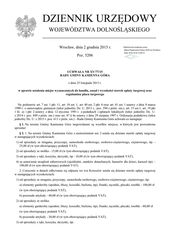 DZIENNIK URZĘDOWY WOJEWÓDZTWA DOLNOŚLĄSKIEGO Wrocław, dnia 2 grudnia 2015 r. Elektronicznie podpisany przez: Milena Pigdanowicz-Fidera; DUW we Wrocławiu Poz. 5206 Data: 2015-12-02 13:59:13 UCHWAŁA NR XV/77/15 RADY GMINY KAMIENNA GÓRA z dnia 25 listopada 2015 r. w sprawie ustalenia miejsc wyznaczonych do handlu, zasad i wysokości stawek opłaty targowej oraz regulaminu placu targowego Na podstawie art. 7 ust. 1 pkt 11, art. 18 ust. 1, art. 40 ust. 2 pkt 4 oraz art. 41 ust. 1 ustawy z dnia 8 marca 1990 r. o samorządzie gminnym (tekst jednolity Dz. U. 2013 r., poz. 594 z późn. zm.), art. 15 ust.1, art. 19 pkt 1 lit. a) i pkt 2 ustawy z dnia 12 stycznia 1991 r. o podatkach i opłatach lokalnych (tekst jednolity Dz. U. z 2014 r. poz. 849 z późn. zm.) oraz art. 47 § 4a ustawy z dnia 29 sierpnia 1997 r. Ordynacja podatkowa (tekst jednolity Dz. U. z 2015 r. poz. 613 z późn. zm.) - Rada Gminy Kamienna Góra uchwala co następuje: § 1. Na terenie Gminy Kamienna Góra targowiskami są wszelkie miejsca, w których jest prowadzona sprzedaż. § 2. 1. Na terenie Gminy Kamienna Góra z zastrzeżeniem ust. 2 ustala się dzienne stawki opłaty targowej w następujących wysokościach: 1) od sprzedaży ze straganu, przyczepy, samochodu osobowego, osobowo-ciężarowego, ciężarowego, itp. 25,00 zł (w tym obowiązujący podatek VAT), 2) od sprzedaży ze stolika - 15,00 zł (w tym obowiązujący podatek VAT), 3) od sprzedaży z ręki, koszyka, skrzynki, itp - 10,00 zł (w tym obowiązujący podatek VAT), 4) za ustawienie urządzeń zabawowych (zjeżdżalni, zamków dmuchanych, basenów dla dzieci, karuzel itp). 100,00 zł (w tym obowiązujący podatek VAT). 2. Corocznie w dniach odbywania się odpustu we wsi Krzeszów ustala się dzienne stawki opłaty targowej w następujących wysokościach: 1) od sprzedaży ze straganu, przyczepy, samochodu osobowego, osobowo-ciężarowego, ciężarowego, itp: a) elementy garderoby (spodnie, bluzy, koszulki, bielizna, itp), firanki, ręczniki, plecaki, torebki - 100,00 zł (w tym obowiązujący podatek VAT), b) pozostałe artykuły - 40,00 zł (w tym obowiązujący podatek VAT), 2) od sprzedaży ze stolika: a) elementy garderoby (spodnie, bluzy, koszulki, bielizna, itp), firanki, ręczniki, plecaki, torebki - 80,00 zł (w tym obowiązujący podatek VAT), b) pozostałe artykuły - 30,00 zł (w tym obowiązujący podatek VAT), 3) od sprzedaży z ręki, koszyka, skrzynki, itp: Dziennik Urzędowy Województwa Dolnośląskiego –2– Poz. 5206 a) elementy garderoby (spodnie, bluzy, koszulki, bielizna, itp), firanki, ręczniki, plecaki, torebki - 60,00 zł (w tym obowiązujący podatek VAT), b) pozostałe artykuły - 20,00 zł (w tym obowiązujący podatek VAT). § 3. W przypadku, gdy dla danej sprzedaży właściwa jest więcej niż jedna stawka opłaty targowej, stosuje się stawkę wyższą. § 4. 1. We wsi Krzeszów zarządza się pobór opłaty w drodze inkasa. 2. Na inkasenta opłaty targowej wyznacza się Pana Marka Piestrzyńskiego zamieszkałego 58-400 Kamienna Góra ulica Waryńskiego 15/1. 3. Ustala się wynagrodzenie inkasenta, o którym mowa w ust. 2, za pobór opłaty targowej w wysokości 25% pobranych i terminowo odprowadzanych kwot. 4. Inkasent pobierający opłatę targową odprowadza ją, za okresy miesięczne, w terminie do 5 każdego miesiąca za miesiąc poprzedni na rachunek Gminy Kamienna Góra. § 5. Na terenach poza wsią Krzeszów, w przypadku braku inkasenta, każdy handlujący obowiązany jest uiścić dzienną opłatę targową na rachunek Gminy Kamienna Góra - 02 8395 0001 0000 2075 2003 0026. § 6. Ustala się regulamin dla placu targowego zlokalizowanego we wsi Krzeszów w obrębie: od skrzyżowania ulic Kalwaria i Michała Willmanna do skrzyżowania ulic Michała Willmanna i Opata Bernarda Rosy w brzmieniu ustalonym w załączniku do niniejszej uchwały. § 7. Wykonanie uchwały powierza się Wójtowi Gminy Kamienna Góra. § 8. Z dniem wejścia w życie niniejszej uchwały, traci moc Uchwała Nr XLIII/216/10 Rady Gminy Kamienna Góra z dnia 27 stycznia 2010 r. § 9. Uchwała wchodzi w życie po upływie 14 dni od dnia ogłoszenia w Dzienniku Urzędowym Województwa Dolnośląskiego, nie wcześniej jednak niż z dniem 1 stycznia 2016. Przewodniczący Rady Gminy: P. Pawlik Dziennik Urzędowy Województwa Dolnośląskiego –3– Poz. 5206 Załącznik do Uchwały Nr XV/77/15 Rady Gminy Kamienna Góra z dnia 25 listopada 2015 r. Dziennik Urzędowy Województwa Dolnośląskiego –4– Poz. 5206 Dziennik Urzędowy Województwa Dolnośląskiego –5– Poz. 5206 Dziennik Urzędowy Województwa Dolnośląskiego –6– Poz. 5206