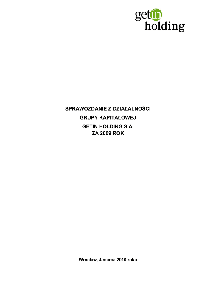 SPRAWOZDANIE Z DZIAŁALNOŚCI GRUPY KAPITAŁOWEJ GETIN HOLDING S.A. ZA 2009 ROK Wrocław, 4 marca 2010 roku Spis treści Zasady sporządzenia rocznego skonsolidowanego sprawozdania finansowego Grupy Kapitałowej Getin Holding S.A., opis organizacji Grupy Kapitałowej Getin Holding, ze wskazaniem jednostek podlegających konsolidacji oraz zmiany struktury Grupy w okresie sprawozdawczym. ................................................................................................. 4 1.1. Podstawowe dane Spółki................................................................................................... 4 1.2. Opis organizacji Grupy Kapitałowej Getin Holding ze wskazaniem jednostek podlegających konsolidacji ................................................................................................ 4 1.3. Zmiany w strukturze Grupy Kapitałowej Getin Holding w 2009 roku. ................................. 6 2. Informacja o działalności operacyjnej Grupy Kapitałowej Getin Holding oraz przewidywany dalszy rozwój spółek Grupy i przewidywana sytuacja finansowa. ............... 8 2.1. Grupa Getin Holding na rynku finansowym ........................................................................ 8 2.2. Rozwój działalności Grupy Kapitałowej Getin Holding w 2009 roku – linie biznesowe, podstawowe produkty, towary i usługi oraz rynki zbytu. ..................................................... 9 II. Ubezpieczenia.......................................................................................................... 14 III. Leasing .................................................................................................................... 15 IV. Pośrednictwo i doradztwo finansowe i inwestycyjne. ................................................ 16 2.3. Ważniejsze osiągnięcia w dziedzinie badań i rozwoju. .................................................... 17 2.4. Przewidywany dalszy rozwój Grupy Kapitałowej .............................................................. 17 3. Komentarz dotyczący wyników finansowych Spółki w 2009 roku wraz z charakterystyką struktury aktywów i pasywów skonsolidowanego bilansu, w tym z punktu widzenia płynności Spółki ............................................................................................................... 20 4. Ważniejsze czynniki i zdarzenia, w tym o nietypowym charakterze w 2009 roku, a także po jego zakończeniu, do dnia zatwierdzenia sprawozdania finansowego mające znaczący wpływ na działalność i wyniki finansowe w roku obrotowym lub których wpływ jest możliwy w następnych latach oraz ich ocena, z określeniem stopnia wpływu tych czynników lub nietypowych zdarzeń na osiągnięty wynik................................................. 22 5. Opis istotnych czynników ryzyka i zagrożeń dla rozwoju spółek Grupy, wraz z określeniem, w jakim stopniu spółki są na nie narażone. ................................................. 24 6. Zarządzanie zasobami finansowymi oraz ocena możliwości realizacji zamierzeń inwestycyjnych, w tym inwestycji kapitałowych, w porównaniu do wielkości posiadanych środków, z uwzględnieniem możliwych zmian w strukturze finansowania tej działalności.27 7. Objaśnienie różnic pomiędzy wynikami finansowymi wykazanymi w raporcie rocznym, a wcześniej publikowanymi prognozami wyników za dany rok. ........................................... 28 8. Informacje o istotnych transakcjach zawartych przez Spółkę lub jednostkę od niej zależną z podmiotami powiązanymi na warunkach innych niż rynkowe. ......................... 28 9. Informacje o udzielonych pożyczkach, ze szczególnym uwzględnieniem pożyczek udzielonych jednostkom powiązanym ze Spółką. ............................................................ 28 10. Informacje o udzielonych i otrzymanych w 2009 roku poręczeniach i gwarancjach, ze szczególnym uwzględnieniem poręczeń i gwarancji udzielonych jednostkom powiązanym ze Spółką. ................................................................................................... 29 11. Informacja o zaciągniętych i wypowiedzianych w 2009 roku umowach dotyczących kredytów i pożyczek. ....................................................................................................... 30 12. Instrumenty finansowe. .................................................................................................... 30 13. Opis istotnych pozycji pozabilansowych w ujęciu podmiotowym, przedmiotowym i wartościowym. ................................................................................................................. 30 14. Informacje o umowach znaczących dla działalności spółek Grupy Kapitałowej, w tym znanych umowach zwartych pomiędzy akcjonariuszami (wspólnikami) oraz umowach ubezpieczenia, współpracy lub kooperacji. ...................................................................... 30 1. 2 15. 16. 17. 18. 19. 20. 21. 22. 23. 24. Zmiany w podstawowych zasadach zarządzania przedsiębiorstwem Spółki. ................... 31 Informacja dotycząca nabycia akcji własnych. ................................................................. 31 Opis wykorzystania przez Spółkę wpływów z emisji. ....................................................... 32 Określenie łącznej liczby i wartości nominalnej wszystkich akcji Spółki, będących w posiadaniu osób zarządzających i nadzorujących Getin Holding S.A. – wg stanu na dzień 31.12.2008r. ........................................................................................................... 32 Wartość wynagrodzeń, nagród, korzyści, w tym wynikających z programów motywacyjnych lub premiowych opartych na kapitale Spółki wypłaconych lub należnych Członkom Zarządu i Rady Nadzorczej Spółki oraz informacja o wartości wynagrodzeń Członków Zarządu i Rady Nadzorczej Getin Holding S.A. z tytułu pełnienia funkcji we w
