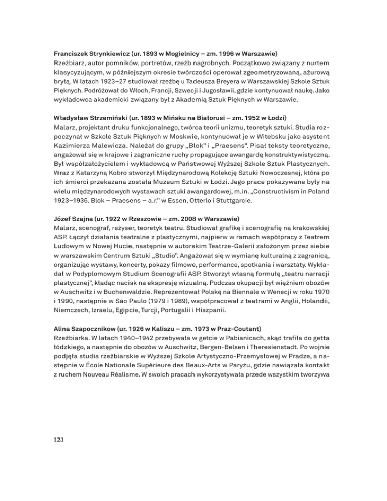 Franciszek Strynkiewicz (ur. 1893 w Mogielnicy – zm. 1996 w Warszawie) Rzeźbiarz, autor pomników, portretów, rzeźb nagrobnych. Początkowo związany z nurtem klasycyzującym, w późniejszym okresie twórczości operował zgeometryzowaną, ażurową bryłą. W latach 1923–27 studiował rzeźbę u Tadeusza Breyera w Warszawskiej Szkole Sztuk Pięknych. Podróżował do Włoch, Francji, Szwecji i Jugosławii, gdzie kontynuował naukę. Jako wykładowca akademicki związany był z Akademią Sztuk Pięknych w Warszawie. Władysław Strzemiński (ur. 1893 w Mińsku na Białorusi – zm. 1952 w Łodzi) Malarz, projektant druku funkcjonalnego, twórca teorii unizmu, teoretyk sztuki. Studia rozpoczynał w Szkole Sztuk Pięknych w Moskwie, kontynuował je w Witebsku jako asystent Kazimierza Malewicza. Należał do grupy „Blok” i „Praesens”. Pisał teksty teoretyczne, angażował się w krajowe i zagraniczne ruchy propagujące awangardę konstruktywistyczną. Był współzałożycielem i wykładowcą w Państwowej Wyższej Szkole Sztuk Plastycznych. Wraz z Katarzyną Kobro stworzył Międzynarodową Kolekcję Sztuki Nowoczesnej, która po ich śmierci przekazana została Muzeum Sztuki w Łodzi. Jego prace pokazywane były na wielu międzynarodowych wystawach sztuki awangardowej, m.in. „Constructivism in Poland 1923–1936. Blok – Praesens – a.r.” w Essen, Otterlo i Stuttgarcie. Józef Szajna (ur. 1922 w Rzeszowie – zm. 2008 w Warszawie) Malarz, scenograf, reżyser, teoretyk teatru. Studiował grafikę i scenografię na krakowskiej ASP. Łączył działania teatralne z plastycznymi, najpierw w ramach współpracy z Teatrem Ludowym w Nowej Hucie, następnie w autorskim Teatrze-Galerii założonym przez siebie w warszawskim Centrum Sztuki „Studio”. Angażował się w wymianę kulturalną z zagranicą, organizując wystawy, koncerty, pokazy filmowe, performance, spotkania i warsztaty. Wykładał w Podyplomowym Studium Scenografii ASP. Stworzył własną formułę „teatru narracji plastycznej”, kładąc nacisk na ekspresję wizualną. Podczas okupacji był więźniem obozów w Auschwitz i w Buchenwaldzie. Reprezentował Polskę na Biennale w Wenecji w roku 1970 i 1990, następnie w São Paulo (1979 i 1989), współpracował z teatrami w Anglii, Holandii, Niemczech, Izraelu, Egipcie, Turcji, Portugalii i Hiszpanii. Alina Szapocznikow (ur. 1926 w Kaliszu – zm. 1973 w Praz-Coutant) Rzeźbiarka. W latach 1940–1942 przebywała w getcie w Pabianicach, skąd trafiła do getta łódzkiego, a następnie do obozów w Auschwitz, Bergen-Belsen i Theresienstadt. Po wojnie podjęła studia rzeźbiarskie w Wyższej Szkole Artystyczno-Przemysłowej w Pradze, a następnie w École Nationale Supérieure des Beaux-Arts w Paryżu, gdzie nawiązała kontakt z ruchem Nouveau Réalisme. W swoich pracach wykorzystywała przede wszystkim tworzywa sztuczne (poliester, poliuretan, żywice syntetyczne), a także żeliwo i beton. Jej prace wystawiane były m.in. w Paryżu, Brukseli, Los Angeles, Nowym Jorku, w Warszawskiej Zachęcie, Muzeum Narodowym w Krakowie. Maciej Toporowicz (ur. 1958 w Białymstoku) Autor prac wideo, fotografii, performer. Ukończył krakowską Akademię Sztuk Pięknych. W latach 80. wspólnie z Piotrem Grzybowskim tworzył grupę performerską AWACS. W 1985 r. przeniósł się do Nowego Jorku. W 2002 r. zaprezentował pracę Obsession na wystawie „Mirroring Evil: Nazi Imagery / Recent Art” w Jewish Museum w Nowym Jorku. Wielokrotnie brał udział w innych wystawach zbiorowych i festiwalach organizowanych w tym muzeum. Jego prace były prezentowane ponadto m.in. w Instytucie Sztuki Wyspa w Gdańsku, Museo D’Arte Moderna w Bolsano, w Muzeum Sztuki Współczesnej MOCAK w Krakowie oraz w Centrum Sztuki Współczesnej w Warszawie. Wojciech Wilczyk (ur. 1961) Fotograf, poeta, autor tekstów krytycznych o sztuce. Autor książek poetycko-fotograficznych, a także cykli fotograficznych dokumentujących funkcjonowanie architektonicznych śladów przeszłości we współczesnym krajobrazie. Jego prace prezentowane były m.in. w Zachęcie, w Centrum Sztuki Współczesnej w Warszawie, a także na Art Forum w Berlinie. Praca Niewinne oko nie istnieje prezentowana była w Galerii Atlas Sztuki w Łodzi, a następnie również w Poznaniu, Krakowie, Jerozolimie, Paryżu i Chemnitz. Andrzej Wróblewski (ur. 1927 w Wilnie – zm. 1957 w Tatrach) Malarz, autor form przestrzennych, teoretyk i krytyk sztuki. Studiował u Zygmunta Radnickiego, Zbigniewa Pronaszki, Hanny Rudzkiej-Cybisowej i Jerzego Fedkowicza na Akademii Sztuk Pięknych w Krakowie, a równolegle historię sztuki na Uniwersytecie Jagiellońskim. Podczas studiów, w 1948 r. założył Grupę Samokształceniową, która programowo wystąpiła przeciw estetyce koloryzmu. W tym samym roku debiutował na I Wystawie Sztuki Nowoczesnej. Wśród dużych retrospektywnych wystaw Wróblewskiego należy wymienić te w krakowskiej Galerii Zderzak w 1993 r., warszawskiej Zachęcie w 1997 r., a także ostatnio w Muzeum Narodowym w Krakowie. Artur Żmijewski (ur. 1966 w Warszawie) Studiował na Wydziale Rzeźby Akademii Sztuk Pięknych w Warszawie, jest redaktorem artystycznym pisma „Krytyka Polityczna”, współpracuje z Fundacją Galerii Foksal. W 2005 r. reprezentował Polskę na Biennale w Wenecji, natomiast w 2012 został wybrany kuratorem na VII Biennale Sztuki Współczesnej w Berlinie. Jest uznawany za jednego z głównych przed- stawicieli „sztuki krytycznej”. Stara się wzmocnić i poszerzyć oddziaływanie sztuki, szukając jej społecznego zastosowania. Obecnie zajmuje się głównie fotografią i filmem. Wystawy jego prac można było oglądać m.in. w Londynie, Bostonie, Bazylei, Berlinie, Toronto, w warszawskiej Galerii Sztuki Współczesnej Zachęta, Centrum Sztuki Współczesnej w Warszawie oraz w Galerii Arsenał w Poznaniu.