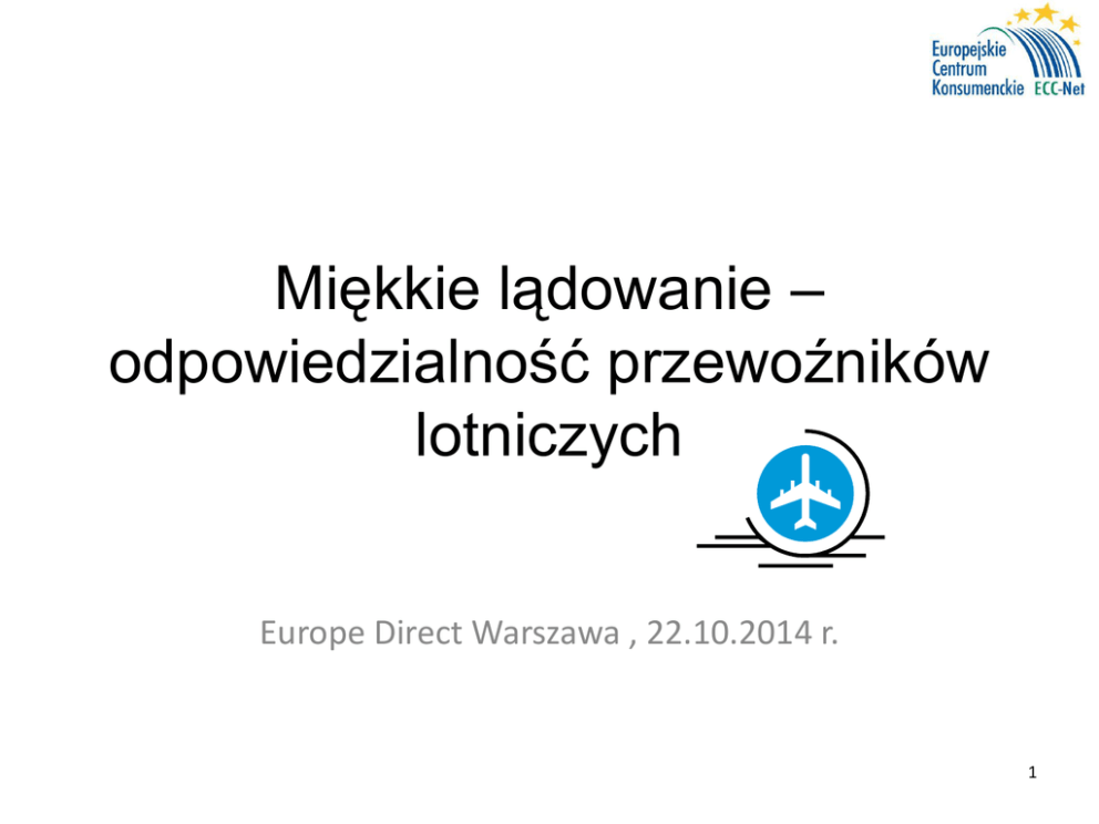 Miękkie lądowanie – odpowiedzialność przewoźników lotniczych Europe Direct Warszawa , 22.10.2014 r. 1 Plan prezentacji : • • • • • • • • Najważniejsze akty prawne + orzecznictwo Rynek lotniczy, pozycja pasażera Problem bagażowy + case studies Odwołanie lotu, opóźnienie lotu, overbooking + case studies Inne przykłady problemów pasażerskich Prawa pasażera niepełnosprawnego ECK a prawa pasażerów Gdzie znaleźć pomoc? 2 Ramy prawne(1): • Rozporządzenie nr 261/2004/WE Parlamentu Europejskiego i Rady z dnia 11 lutego 2004 roku ustanawiające wspólne zasady odszkodowania i pomocy dla pasażerów w przypadku odmowy przyjęcia na pokład albo odwołania lub dużego opóźnienia lotów • Rozporządzenie nr 2111/2006/WE Parlamentu Europejskiego i Rady z dnia 5 lipca 2006 roku w sprawie osób niepełnosprawnych oraz osób o ograniczonej sprawności ruchowej podróżujących drogą lotniczą 3 Ramy prawne (2): • Rozporządzenie nr 2111/2005/WE Parlamentu Europejskiego i Rady z dnia 14 grudnia 2005 roku w sprawie ustanowienia wspólnotowego wykazu przewoźników lotniczych podlegających zakazowi wykonywania przewozów w ramach Wspólnoty i informowania pasażerów korzystających z transportu lotniczego o tożsamości przewoźnika lotniczego wykonującego przewóz 4 Ramy prawne (3): • Konwencja Montrealska – o ujednoliceniu niektórych prawideł dotyczących międzynarodowego przewozu lotniczego z 28 maja 1999 roku • Prawo lotnicze – ustawa z 3 lipca 2002 roku • Kodeks cywilny z 23 kwietnia 1964 roku • Rozporządzenie Ministra Infrastruktury z 14 listopada 2003 roku w sprawie regulaminów przewoźników lotniczych 5 Wybrane orzecznictwo: • Wyrok ETS z dnia 13 października 2011 roku C-83/10 (dalsze odszkodowanie) • Wyrok ETS z dnia 19 listopada 2009 roku C402/07 (opóźnienie jak odwołanie) • Wyrok ETS z dnia 4 września 2014 roku C452/13 (otwarcie drzwi a opóźnienie) • Wyrok ETS z dnia 22 grudnia 2008 roku C549/07 (awaria samolotu) • Wyrok TSUE z dnia 19 września 2014 roku w sprawie C- 487/12 ( opłaty za bagaż ) 6 Rzut okiem na rynek lotniczy w Polsce: • Definicja przewoźnika lotniczego • Rodzaje przewoźników (połączenia regularne i nieregularne) • Najwięksi światowi i europejscy przewoźnicy • Największe porty lotnicze na świecie i w Polsce • Alianse lotnicze; Tanie latanie • W UE sektor lotnictwa zapewnia 5,1 mln miejsc pracy i wytwarza 365 mld EUR – 2,4 % europejskiego PKB ( dane na 2012 ) 7 Pasażer – konsument: • • • • • Umowa o przewóz lotniczy – charakter Najpopularniejsze destynacje w roku 2012 Główne destynacje czarterowe Skąd najczęściej odlatujemy? Szacuje się, że do 2015 r. ruch lotniczy w Polsce zwiększy się o ok. 28 % • Z których przewoźników lepiej zrezygnować (czarna lista Komisji Europejskiej)? 8 Zniszczenie, opóźnienie, zagubienie bagażu (1): • Bagaż i jego rodzaje; obowiązki przewoźnika • Czego nie można wnieść na pokład oraz pod pokład? • Oznaczenia bagażu stosowane przez przewoźników • Jak uniknąć problemów bagażowych? • Rodzaje problemów bagażowych 9 Zniszczenie, opóźnienie, zagubienie bagażu (2): • Zniszczenie, opóźnienie, zagubienie bagażu • Terminy, które obowiązują pasażera oraz czynności jakie winien powziąć • Odpowiedzialność przewoźnika jest niestety ograniczona do 1134 SDR (nie wyklucza to oddzielnego ubezpieczenia) • Problem powszechny – brak rachunków, paragonów • Po stwierdzeniu problemu bagażowego zaleca się kontakt z ECK 10 Case studies (1): • Konsumentka z Polski leciała węgierskimi liniami lotniczymi z Polski do Włoch. Na lotnisku w Mediolanie okazało się, że jej bagaż jest zniszczony – ma uszkodzoną strukturę wierzchnią. Skontaktowała się z przewoźnikiem, ale ten odmówił jej wypłaty jakichkolwiek środków, ponieważ konsumentka nie posiada zaświadczenia od eksperta w zakresie nieużywalności walizki. Szukała w Warszawie i w Łodzi, ale takiego eksperta nie znalazła. Znalazła osobę, która wystawiła jej opinię, ale linia lotnicza stwierdziła brak wiarygodności ekspertyzy. Skierowała sprawę do ECK Polska. Dzięki pomocy ECK Węgry przewoźnik zwrócił pasażerce kwotę 60 euro (koszt walizki plus koszt uzyskania ekspertyzy nie respektowanej przez przewoźnika). 11 Case studies (2): • Polska konsumentka leciała greckimi liniami lotniczymi ze Stambułu do Aten. Jej bagaż został zniszczony. Nie posiadała rachunku za walizkę (był to prezent od siostry), a zatem przewoźnik odmówił jej wypłaty odszkodowania. Procedura prowadzona przez ECK początkowo zdawała się nie zmierzać ku wyjaśnieniu problemu. W imieniu konsumentki napisaliśmy do Hellenic Civil Aviation Authority, aby zbadano rzetelność prowadzenia działalności przewoźnika. W odpowiedzi ECK Grecja i ECK Polska zostali powiadomieni o woli spełnienia roszczenia konsumentki w całości. Po tygodniu pasażerka otrzymała 65 euro. 12 Case studies ( 3 ) : • Polski pasażer leciał niemieckimi liniami lotniczymi na Dominikanę. Jego bagaż został zagubiony. Zaczął więc kupować najpotrzebniejsze rzeczy – jednak niewiele sklepów sprzedających podstawowe produkty wydawało jakiekolwiek potwierdzenia zakupu. Przewoźnik obiecał mu wypłacić 30 % roszczenia z uwagi na brak rachunków. Wskutek interwencji ECK Polska oraz ECK Niemcy, oferta zatrzymała się na granicy 85%, a zatem konsument otrzymał kwotę 350 euro. 13 Opóźnienie lotu: • Jakie opóźnienie rodzi odpowiedzialność przewoźnika? • Co powinna zapewnić linia lotnicza w wypadku opóźnienia lotu? • Jak wysokie możemy otrzymać odszkodowanie? • Co uniemożliwi nam otrzymanie odszkodowania? • Postępowanie reklamacyjne • Najnowsze orzecznictwo 14 Odwołanie lotu: • • • • • Czym jest odwołanie lotu? Obowiązki przewoźnika względem pasażera Odszkodowanie oraz dalsze odszkodowanie Prob