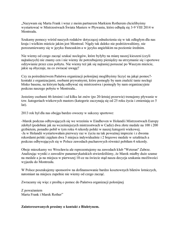 „Nazywam się Marta Frank i wraz z moim partnerem Markiem Rotherem chcielibyśmy wystartować w Mistrzostwach Świata Masters w Pływaniu, które odbędą się 3-9 VIII 2014 w Montrealu. Szukamy pomocy wśród naszych rodaków dotyczącej odnalezienia się w tak odległym dla nas kraju i wielkim mieście jakim jest Montreal. Nigdy tak daleko nie podróżowaliśmy, nie porozumiewamy się w języku francuskim a w języku angielskim na poziomie średnim. Nie wiemy od czego zacząć szukać noclegów, które byłyby na miarę naszej kieszeni (czyli najtańszych) nie znamy cen i nie wiemy ile potrzebujemy pieniędzy na utrzymanie się i sportowe odżywianie przez czas pobytu. Nie wiemy też jak się najtaniej poruszać po Waszym mieście, jakie są obyczaje, na co zwracać uwagę? Czy za pośrednictwem Państwa organizacji polonijnej moglibyśmy liczyć na jakąś pomoc?kontakt z organizacjami, osobami prywatnymi, które pomogły by nam znaleźć tanie noclegi blisko basenu, na którym będą odbywać się mistrzostwa i pomogły by nam organizacyjnie podczas naszego pobytu w Montrealu.. Jesteśmy osobami 46-letnimi i od kilku lat znów (po 20-letniej przerwie) trenujemy pływanie w tzw. kategoriach wiekowych masters (kategorie zaczynają się od 25 roku życia i zmieniają co 5 lat). 2013 rok był dla nas obojga bardzo owocny w sukcesy sportowe: -Marek podczas odbywających się we wrześniu w Eindhoven w Holandii Mistrzostwach Europy zdobył (podobnie jak na wcześniejszych mistrzostwach w Cadiz) dwa złote medale na 100 i 200 grzbietem, ponadto pobił w tym roku 4 rekordy polski w naszej kategorii wiekowej. -Ja w Holandii wystartowałam pierwszy raz w życiu na tak poważnej imprezie i z dwoma rekordami polski zajęłam dwa 5 miejsca indywidualnie i 2 brązowe medale w sztafetach a podczas odbywających się w Polsce zawodach pucharowych również pobiłam 4 rekordy. Oboje mieszkamy we Wrocławiu ale reprezentujemy na zawodach klub "Weteran" Zabrze. Analizując wyniki z zawodów panamerykańskich stwierdziliśmy, że Marek miałby duże szanse na medale a ja na miejsca w pierwszej 10-ce na świecie stąd nasza decyzja szukania możliwości wyjazdu do Montrealu. W Polsce poszukujemy sponsorów na dofinansowanie bardzo kosztownych biletów lotniczych, natomiast na miejscu zupełnie nie wiemy od czego zacząć. Zwracamy się więc z prośbą o pomoc do Państwa organizacji polonijnej Z poważaniem Marta Frank i Marek Rother” Zainteresowanych prosimy o kontakt z Biuletynem.