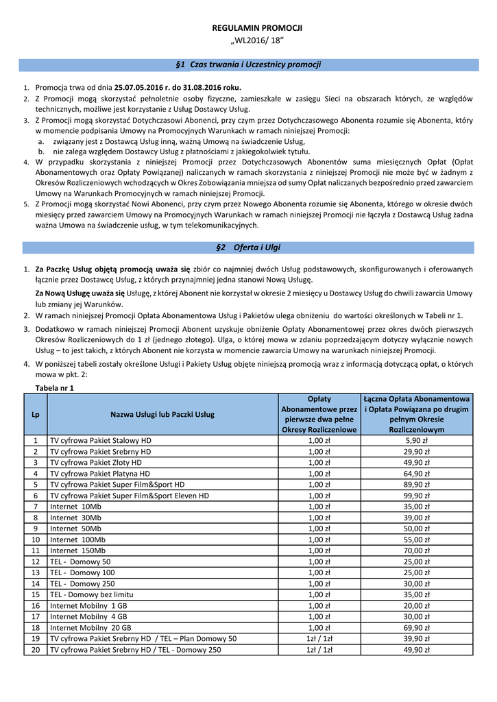 REGULAMIN PROMOCJI „WL2016/ 18” §1 Czas trwania i Uczestnicy promocji 1. Promocja trwa od dnia 25.07.05.2016 r. do 31.08.2016 roku. 2. Z Promocji mogą skorzystać pełnoletnie osoby fizyczne, zamieszkałe w zasięgu Sieci na obszarach których, ze względów technicznych, możliwe jest korzystanie z Usług Dostawcy Usług. 3. Z Promocji mogą skorzystać Dotychczasowi Abonenci, przy czym przez Dotychczasowego Abonenta rozumie się Abonenta, który w momencie podpisania Umowy na Promocyjnych Warunkach w ramach niniejszej Promocji: a. związany jest z Dostawcą Usług inną, ważną Umową na świadczenie Usług, b. nie zalega względem Dostawcy Usług z płatnościami z jakiegokolwiek tytułu. 4. W przypadku skorzystania z niniejszej Promocji przez Dotychczasowych Abonentów suma miesięcznych Opłat (Opłat Abonamentowych oraz Opłaty Powiązanej) naliczanych w ramach skorzystania z niniejszej Promocji nie może być w żadnym z Okresów Rozliczeniowych wchodzących w Okres Zobowiązania mniejsza od sumy Opłat naliczanych bezpośrednio przed zawarciem Umowy na Warunkach Promocyjnych w ramach niniejszej Promocji. 5. Z Promocji mogą skorzystać Nowi Abonenci, przy czym przez Nowego Abonenta rozumie się Abonenta, którego w okresie dwóch miesięcy przed zawarciem Umowy na Promocyjnych Warunkach w ramach niniejszej Promocji nie łączyła z Dostawcą Usług żadna ważna Umowa na świadczenie usług, w tym telekomunikacyjnych. §2 Oferta i Ulgi 1. Za Paczkę Usług objętą promocją uważa się zbiór co najmniej dwóch Usług podstawowych, skonfigurowanych i oferowanych łącznie przez Dostawcę Usług, z których przynajmniej jedna stanowi Nową Usługę. Za Nową Usługę uważa się Usługę, z której Abonent nie korzystał w okresie 2 miesięcy u Dostawcy Usług do chwili zawarcia Umowy lub zmiany jej Warunków. 2. W ramach niniejszej Promocji Opłata Abonamentowa Usług i Pakietów ulega obniżeniu do wartości określonych w Tabeli nr 1. 3. Dodatkowo w ramach niniejszej Promocji Abonent uzyskuje obniżenie Opłaty Abonamentowej przez okres dwóch pierwszych Okresów Rozliczeniowych do 1 zł (jednego złotego). Ulga, o której mowa w zdaniu poprzedzającym dotyczy wyłącznie nowych Usług – to jest takich, z których Abonent nie korzysta w momencie zawarcia Umowy na warunkach niniejszej Promocji. 4. W poniższej tabeli zostały określone Usługi i Pakiety Usług objęte niniejszą promocją wraz z informacją dotyczącą opłat, o których mowa w pkt. 2: Tabela nr 1 Lp 1 2 3 4 5 6 7 8 9 10 11 12 13 14 15 16 17 18 19 20 Nazwa Usługi lub Paczki Usług TV cyfrowa Pakiet Stalowy HD TV cyfrowa Pakiet Srebrny HD TV cyfrowa Pakiet Złoty HD TV cyfrowa Pakiet Platyna HD TV cyfrowa Pakiet Super Film&Sport HD TV cyfrowa Pakiet Super Film&Sport Eleven HD Internet 10Mb Internet 30Mb Internet 50Mb Internet 100Mb Internet 150Mb TEL - Domowy 50 TEL - Domowy 100 TEL - Domowy 250 TEL - Domowy bez limitu Internet Mobilny 1 GB Internet Mobilny 4 GB Internet Mobilny 20 GB TV cyfrowa Pakiet Srebrny HD / TEL – Plan Domowy 50 TV cyfrowa Pakiet Srebrny HD / TEL - Domowy 250 Opłaty Łączna Opłata Abonamentowa Abonamentowe przez i Opłata Powiązana po drugim pierwsze dwa pełne pełnym Okresie Okresy Rozliczeniowe Rozliczeniowym 1,00 zł 5,90 zł 1,00 zł 29,90 zł 1,00 zł 49,90 zł 1,00 zł 64,90 zł 1,00 zł 89,90 zł 1,00 zł 99,90 zł 1,00 zł 35,00 zł 1,00 zł 39,00 zł 1,00 zł 50,00 zł 1,00 zł 55,00 zł 1,00 zł 70,00 zł 1,00 zł 25,00 zł 1,00 zł 25,00 zł 1,00 zł 30,00 zł 1,00 zł 35,00 zł 1,00 zł 20,00 zł 1,00 zł 30,00 zł 1,00 zł 69,90 zł 1zł / 1zł 39,90 zł 1zł / 1zł 49,90 zł 21 22 23 24 25 26 27 28 29 30 31 32 33 34 35 36 37 38 39 40 41 42 43 TV cyfrowa Pakiet Srebrny HD / TEL - Domowy Bez Limitu TV cyfrowa Pakiet Złoty HD / TEL - Domowy 50 TV cyfrowa Pakiet Złoty HD / TEL - Domowy 250 TV cyfrowa Pakiet Złoty HD / TEL - Domowy Bez Limitu TV cyfrowa Pakiet Platynowy HD / TEL - Domowy 50 TV cyfrowa Pakiet Platynowy HD / TEL - Domowy 250 TV cyfrowa Pakiet Platynowy HD / TEL - Domowy Bez Limitu TV cyfrowa Pakiet SuperFilm&Sport HD / TEL - Domowy 50 TV cyfrowa Pakiet SuperFilm&Sport HD / TEL - Domowy 250 TV cyfrowa Pakiet SuperFilm&Sport HD / TEL - Domowy Bez Limitu TV cyfrowa Pakiet Srebrny HD / Internet 10Mb TV cyfrowa Pakiet Srebrny HD / Internet 30Mb TV cyfrowa Pakiet Srebrny HD / Internet 50Mb TV cyfrowa Pakiet Złoty HD / Internet 30Mb TV cyfrowa Pakiet Złoty HD / Internet 50Mb TV cyfrowa Pakiet Złoty HD / Internet 100Mb TV cyfrowa Pakiet Platynowy HD / Internet 30Mb TV cyfrowa Pakiet Platynowy HD / Internet 50Mb TV cyfrowa Pakiet Platynowy HD / Internet 100Mb TV cyfrowa Pakiet Platynowy HD / Internet 150Mb TV cyfrowa Pakiet SuperFilm&Sport HD / Internet 50Mb TV cyfrowa Pakiet SuperFilm&Sport HD / Internet 100Mb TV cyfrowa Pakiet SuperFilm&Sport HD /Internet 150Mb 1zł / 1zł 1zł / 1zł 1zł / 1zł 1zł / 1zł 1zł / 1zł 1zł / 1zł 1zł / 1zł 1zł / 1zł 1zł / 1zł 1zł / 1zł 1zł / 1zł 1zł / 1zł 1zł / 1zł 1zł / 1zł 1zł / 1zł 1zł / 1zł 1zł / 1zł 1zł / 1zł 1zł / 1zł 1zł / 1zł 1zł / 1zł 1zł / 1zł 1zł / 1zł 54,90 zł 59,90 zł 64,90 zł 69,90 zł 74,90 zł 79,90 zł 84,90 zł 104,90 zł 109,90 zł 114,90 zł 49,90 zł 59,90 zł 64,90 zł 74,90 zł 79,90 zł 84,90 zł 89,90 zł 94,90 zł 99,90 zł 109,90 zł 124,90 zł 129,90 zł 139,90 zł 5. Wysokość Opłat Abonamentowych oraz Opłat Powiązanych (w przypadku Usługi Telewizji), wysokość opłat jednorazowych (opłat instalacyjnych i/lub aktywacyjnych), wartość udzielonej Ulgi, Okres Zobowiązania, wysokość Opłat po Okresie Zobowiązania zostały przedstawione w Warunkach Umowy lub w Potwierdzeniu Zmiany Warunków Umowy, w przypadku dokonania zmiany Warunków Umowy za pomocą środków porozumiewania się na odległość. 6. Ceny podane w niniejszym regulaminie są cenami brutto. 7. W przypadku zawarcia Umowy lub dokonania zmiany Warunków Umowy na świadczenie Us