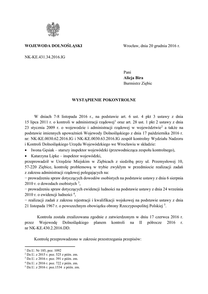 WOJEWODA DOLNOŚLĄSKI Wrocław, dnia 20 grudnia 2016 r. NK-KE.431.34.2016.IG Pani Alicja Bira Burmistrz Ziębic WYSTĄPIENIE POKONTROLNE W dniach 7-8 listopada 2016 r., na podstawie art. 6 ust. 4 pkt 3 ustawy z dnia 15 lipca 2011 r. o kontroli w administracji rządowej1 oraz art. 28 ust. 1 pkt 2 ustawy z dnia 23 stycznia 2009 r. o wojewodzie i administracji rządowej w województwie2 a także na podstawie imiennych upoważnień Wojewody Dolnośląskiego z dnia 17 października 2016 r. nr: NK-KE.0030.62.2016.IG i NK-KE.0030.63.2016.IG zespół kontrolny Wydziału Nadzoru i Kontroli Dolnośląskiego Urzędu Wojewódzkiego we Wrocławiu w składzie: Iwona Gęsiak – starszy inspektor wojewódzki (przewodnicząca zespołu kontrolnego), Katarzyna Lipke – inspektor wojewódzki, przeprowadził w Urzędzie Miejskim w Ziębicach z siedzibą przy ul. Przemysłowej 10, 57-220 Ziębice, kontrolę problemową w trybie zwykłym w przedmiocie realizacji zadań z zakresu administracji rządowej polegających na: − prowadzeniu spraw dotyczących dowodów osobistych na podstawie ustawy z dnia 6 sierpnia 2010 r. o dowodach osobistych 3, − prowadzeniu spraw dotyczących ewidencji ludności na podstawie ustawy z dnia 24 września 2010 r. o ewidencji ludności 4, − realizacji zadań z zakresu rejestracji i kwalifikacji wojskowej na podstawie ustawy z dnia 21 listopada 1967 r. o powszechnym obowiązku obrony Rzeczypospolitej Polskiej 5. Kontrola została zrealizowana zgodnie z zatwierdzonym w dniu 17 czerwca 2016 r. przez Wojewodę Dolnośląskiego planem kontroli na II półrocze 2016 r. nr NK-KE.430.2.2016.DD. Kontrolę przeprowadzono w zakresie przestrzegania przepisów: 1 Dz.U. Nr 185, poz. 1092 Dz.U. z 2015 r. poz. 525 z późn. zm. 3 Dz.U. z 2016 r. poz. 391 z późn. zm. 4 Dz.U. z 2016 r. poz. 722 z późn. zm. 5 Dz.U. z 2016 r. poz.1534 z późn. zm. 2 1. Ustawy z dnia 6 sierpnia 2010 r. o dowodach osobistych, tj.: - realizacji obowiązków organu gminy w zakresie wydawania dowodów osobistych, - udostępniania danych z Rejestru Dowodów Osobistych oraz z dokumentacji związanej z dowodami osobistymi. 2. Ustawy z dnia 24 września 2010 r. o ewidencji ludności, tj.: - prowadzenia postępowań administracyjnych w sprawach meldunkowych, - terminowości prowadzenia postępowań administracyjnych w sprawach meldunkowych, - wykonywania czynności materialno-technicznych w postaci przyjęcia i zarejestrowania zgłoszeń meldunkowych, - wydawania przez organ gminy zaświadczeń z rejestru mieszkańców i rejestru zamieszkania cudzoziemców, - terminowości załatwiania spraw dotyczących wydawania zaświadczeń z rejestru mieszkańców i rejestru zamieszkania cudzoziemców, - udostępniania danych z rejestru mieszkańców i rejestru zamieszkania cudzoziemców, oraz prowadzenie postępowań administracyjnych w przedmiocie odmowy udostępnienia danych osobowych. 3. Ustawy z dnia 21 listopada 1967 r. o powszechnym obowiązku obrony Rzeczypospolitej Polskiej, tj.: - realizacji obowiązków dotyczących rejestracji osób na potrzeby prowadzenia kwalifikacji wojskowej oraz założenia ewidencji wojskowej, - terminowości wykonywania obowiązków dotyczących rejestracji, - realizacji obowiązków dotyczących kwalifikacji wojskowej, - terminowości wykonywania obowiązków dotyczących kwalifikacji wojskowej. Okres objęty kontrolą: - od 1 marca 2015 r. do dnia kontroli w przedmiocie: dowody osobiste, ewidencja ludności, - od 1 stycznia 2015 r. do dnia kontroli w przedmiocie: rejestracja i kwalifikacja wojskowa. W okresie kontrolowanym funkcję kierownika Urzędu sprawowała Pani Alicja Bira – Burmistrz Ziębic. Sprawy z kontrolowanego zakresu prowadziły: - Pani Sylwia Huculak- zastępca Kierownika USC, - Pani Agata Ziółkowska – inspektor ds. dowodów osobistych i ewidencji ludności. Realizację przez Burmistrza Ziębic zadań z zakresu administracji rządowej należy ocenić: I. pozytywnie – w zakresie dowodów osobistych II. pozytywnie – w zakresie ewidencji ludności III. negatywnie – w zakresie rejestracji i kwalifikacji wojskowej Pismem nr NK-KE.431.34.2016.IG z dnia 2 grudnia 2016 r. przekazano kierownikowi jednostki kontrolowanej projekt wystąpienia pokontrolnego, do którego Burmistrz Ziębic w ustawowym terminie wniósł zastrzeżenia. Zostały one oddalone w całości. Stanowisko wobec wniesionych zastrzeżeń przekazano kierownikowi jednostki kontrolowanej. Wobec powyższego przekazuję niniejsze wystąpienie z dyspozycją art. 47 ustawy o kontroli w administracji rządowej. pokontrolne, zgodnie USTALENIA KONTROLI DOWODY OSOBISTE Realizacja obowiązków organu gminy w zakresie wydawania dowodów osobistych Kontroli poddano 20 kopert dowodowych dotyczących dowodów osobistych wydanych od 1 marca 2015 r. o następujących seriach i numerach: CBC ….., CAR ……., CBA ….., CAZ ……, CAW ….., CAD ….., CAB ……, CAY ……., CAW ……., CAX ….., CAT ……, CBR ….., CAD ……, CDJ ……., CAU ……., CCA ……., CDH ……, CBM …., CBN ……, CDG ……... Na tej podstawie ustalono, co następuje. Wnioski o wydanie dowodu osobistego składały uprawnione osoby, zgodnie z art. 25 ustawy z dnia 6 sierpnia 2010 r. o dowodach osobistych6, zwanej dalej u.d.o., w związku z §4 rozporządzenia Ministra Spraw Wewnętrznych z dnia 29 stycznia 2015 r. w sprawie wzoru dowodu osobistego oraz sposobu i trybu postępowania w sprawie wydawania dowodów osobistych, ich utraty, uszkodzenia, unieważnienia i zwrotu7, zwanego dalej r.d.o. W przypadku wydania dowodu osobistego dla osoby nieposiadającej pełnej zdolności do czynności prawnych (3 sprawy) wniosek składał rodzic. W sprawie nr CAY ……. wniosek został złożony przez opiekuna prawnego osoby ubezwłasnowolnionej całkowicie – w kopercie dowodowej znajduje się kopia stosownego zaświadczenia o ustanowieniu opiekuna prawnego (zgodnie z §4 pkt 3 r.d.o.). W wyniku analizy dokumentów stwierdzono, że wnioski