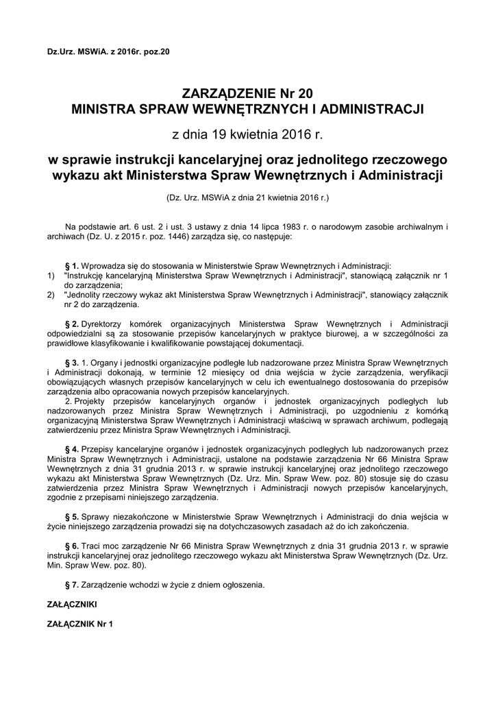 Dz.Urz. MSWiA. z 2016r. poz.20 ZARZĄDZENIE Nr 20 MINISTRA SPRAW WEWNĘTRZNYCH I ADMINISTRACJI z dnia 19 kwietnia 2016 r. w sprawie instrukcji kancelaryjnej oraz jednolitego rzeczowego wykazu akt Ministerstwa Spraw Wewnętrznych i Administracji (Dz. Urz. MSWiA z dnia 21 kwietnia 2016 r.) Na podstawie art. 6 ust. 2 i ust. 3 ustawy z dnia 14 lipca 1983 r. o narodowym zasobie archiwalnym i archiwach (Dz. U. z 2015 r. poz. 1446) zarządza się, co następuje: 1) 2) § 1. Wprowadza się do stosowania w Ministerstwie Spraw Wewnętrznych i Administracji: "Instrukcję kancelaryjną Ministerstwa Spraw Wewnętrznych i Administracji", stanowiącą załącznik nr 1 do zarządzenia; "Jednolity rzeczowy wykaz akt Ministerstwa Spraw Wewnętrznych i Administracji", stanowiący załącznik nr 2 do zarządzenia. § 2. Dyrektorzy komórek organizacyjnych Ministerstwa Spraw Wewnętrznych i Administracji odpowiedzialni są za stosowanie przepisów kancelaryjnych w praktyce biurowej, a w szczególności za prawidłowe klasyfikowanie i kwalifikowanie powstającej dokumentacji. § 3. 1. Organy i jednostki organizacyjne podległe lub nadzorowane przez Ministra Spraw Wewnętrznych i Administracji dokonają, w terminie 12 miesięcy od dnia wejścia w życie zarządzenia, weryfikacji obowiązujących własnych przepisów kancelaryjnych w celu ich ewentualnego dostosowania do przepisów zarządzenia albo opracowania nowych przepisów kancelaryjnych. 2. Projekty przepisów kancelaryjnych organów i jednostek organizacyjnych podległych lub nadzorowanych przez Ministra Spraw Wewnętrznych i Administracji, po uzgodnieniu z komórką organizacyjną Ministerstwa Spraw Wewnętrznych i Administracji właściwą w sprawach archiwum, podlegają zatwierdzeniu przez Ministra Spraw Wewnętrznych i Administracji. § 4. Przepisy kancelaryjne organów i jednostek organizacyjnych podległych lub nadzorowanych przez Ministra Spraw Wewnętrznych i Administracji, ustalone na podstawie zarządzenia Nr 66 Ministra Spraw Wewnętrznych z dnia 31 grudnia 2013 r. w sprawie instrukcji kancelaryjnej oraz jednolitego rzeczowego wykazu akt Ministerstwa Spraw Wewnętrznych (Dz. Urz. Min. Spraw Wew. poz. 80) stosuje się do czasu zatwierdzenia przez Ministra Spraw Wewnętrznych i Administracji nowych przepisów kancelaryjnych, zgodnie z przepisami niniejszego zarządzenia. § 5. Sprawy niezakończone w Ministerstwie Spraw Wewnętrznych i Administracji do dnia wejścia w życie niniejszego zarządzenia prowadzi się na dotychczasowych zasadach aż do ich zakończenia. § 6. Traci moc zarządzenie Nr 66 Ministra Spraw Wewnętrznych z dnia 31 grudnia 2013 r. w sprawie instrukcji kancelaryjnej oraz jednolitego rzeczowego wykazu akt Ministerstwa Spraw Wewnętrznych (Dz. Urz. Min. Spraw Wew. poz. 80). § 7. Zarządzenie wchodzi w życie z dniem ogłoszenia. ZAŁĄCZNIKI ZAŁĄCZNIK Nr 1 INSTRUKCJA KANCELARYJNA MINISTERSTWA SPRAW WEWNĘTRZNYCH I ADMINISTRACJI Rozdział 1. Postanowienia ogólne § 1. 1. Instrukcja kancelaryjna Ministerstwa Spraw Wewnętrznych i Administracji, zwana dalej "Instrukcją", określa szczegółowe zasady i tryb wykonywania czynności kancelaryjnych w Ministerstwie Spraw Wewnętrznych i Administracji, zwanym dalej "Ministerstwem", oraz reguluje postępowanie w tym zakresie z wszelką dokumentacją, jeżeli przepisy odrębne nie stanowią inaczej: 1) począwszy od wpływu lub powstania dokumentacji wewnątrz Ministerstwa do momentu uznania jej za część dokumentacji w komórce właściwej w sprawach archiwum oraz 2) niezależnie od techniki jej wytwarzania, postaci fizycznej oraz informacji w niej zawartych. 2. Przepisy Instrukcji stosuje się odpowiednio do postępowania z dokumentacją, w tym zawierającą informacje niejawne, wpływającą i powstającą w związku z użytkowaniem systemów teleinformatycznych dedykowanych do realizacji określonych wyspecjalizowanych usług oraz spraw, o ile w przepisach dotyczących obsługi tych systemów i prowadzenia czynności w tych systemach nie wskazano innego sposobu wykonywania czynności kancelaryjnych. 1) 2) 3) 4) 5) 6) 7) 8) 9) 10) 11) 12) 13) 14) § 2. Użyte w Instrukcji określenia oznaczają: bezpieczny podpis elektroniczny - podpis określony w art. 3 pkt 2 ustawy z dnia 18 września 2001 r. o podpisie elektronicznym (Dz. U. z 2013 r. poz. 262, z 2014 r. poz. 1662 oraz z 2015 r. poz. 1893). Dane w postaci elektronicznej opatrzone bezpiecznym podpisem elektronicznym weryfikowanym przy pomocy ważnego kwalifikowanego certyfikatu są równoważne pod względem skutków prawnych dokumentom opatrzonym podpisami własnoręcznymi; dekretacja - adnotację umieszczaną na piśmie lub do niego dołączaną, zawierającą wskazanie osoby lub komórki organizacyjnej, wyznaczonej do załatwienia sprawy, która może zawierać dyspozycje co do terminu i sposobu załatwienia sprawy; dekretacja zastępcza - adnotację umieszczaną na piśmie lub do niego dołączaną, odzwierciedlającą treść dekretacji elektronicznej dołączonej do pisma zarejestrowanego w systemie teleinformatycznym, służącym do realizacji elektronicznego zarządzania dokumentacją (EZD), potwierdzoną podpisem odręcznym przez osobę przenoszącą treść dekretacji na pismo; elektroniczna platforma usług administracji publicznej (ePUAP) - system teleinformatyczny, w którym instytucje publiczne udostępniają usługi przez pojedynczy punkt dostępowy w sieci Internet; elektroniczna skrzynka podawcza (ESP) - dostępny publicznie środek komunikacji elektronicznej służący do przekazywania dokumentów elektronicznych do Ministerstwa przy wykorzystaniu powszechnie dostępnego systemu teleinformatycznego; elektroniczny dziennik korespondencji - rejestr elektroniczny wykorzystywany przez pracowników Kancelarii Głównej oraz pracowników wykonujących czynności sekretarskie w komórkach organizacyjnych do ewidencjonowania wpływającej i wychodzącej korespondencji jawnej, jej treści i sposobu załatwienia; K