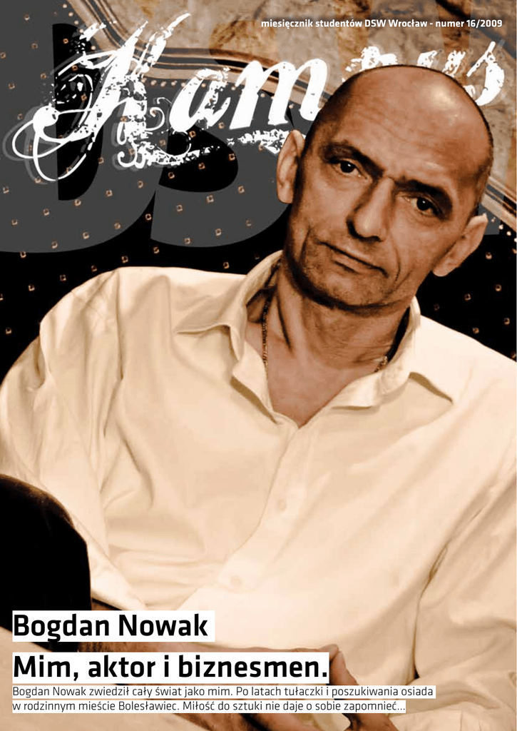 miesięcznik studentów DSW Wrocław - numer 16/2009 Bogdan Nowak Mim, aktor i biznesmen. Bogdan Nowak zwiedził cały świat jako mim. Po latach tułaczki i poszukiwania osiada w rodzinnym mieście Bolesławiec. Miłość do sztuki nie daje o sobie zapomnieć... i c s e r t s i p S tę krzyczeć o ch o m a m i m Czasa łosy? ąca się wniebog 3 4 5 6 10 iego roku dr Studentka drug z mieszkania... ychodzę wtedy W . Nie, nie wolno enta d Samotność stu stają w tyle. spomnienia zo zyjaciele i w a, prawdziwi pr in dz Ro . m sa Jesteś całkiem ę w bólu. ierasz, wijesz si Wewnętrznie um itne kino Chcica na amb i dowiedzieć eć, albo może pomni zy Warto sobie pr udyjnych... się, o kinach st nie apisana na ścia do zapamiętywania dat i wydarzeń. z i ri to is h a cj k Le nicza się affiti. ając uliczne gr zedmiotu ogra a tego pr storii czyt na uczyć się hi Zazwyczaj nauk metody – moż ne in ak dn je Istnieją Bogdan Nowak ie Bolesławiec. nym mieśc osiada w rodzin ia an iw uk sz czki i po Po latach tuła e zapomnieć... nie daje o sobi ki tu sz do ść Miło Wrocławian ć ś o rn a d li o S . ji ła ostrzał Wojna w Gruz tyleria rozpoczę iu osetyjska ar po połudn Dnia 7 sierpnia ronie granicy. ich po drugiej st sk iń uz gr i cj zy po 12 14 15 16 to Wrocław mias spotkań iedziami niedźw cokrajowców z jarzona przez ob ówić, ko m ła żo by du ka tu ls oli mijają. Co w Czasy, kiedy Po po ch ica ul mi się po przechadzający Rabastabarbar efekt wybryku ść słuchaczy, wyj erszego grona „Dotrzeć do sz ... ować swój styl a przy tym zach z „podziemia”, e w Recenzje płyto et Futbolowy targ - dzieciaki azują się niezw j w mediach uk rne wiadomości. ykle spektakula Coraz częście Sprzedaż dzieci Samotność studenta Jesteś całkiem sam. Rodzina, prawdziwi przyjaciele i wspomnienia zostają w tyle. Wewnętrznie umierasz, wijesz się w bólu. Nie dziwi mnie, że naprawdę docenia się to, co najpierw się straci. Nie jesteśmy maszynami, bezdusznymi szczurami i męczennikami kariery. Potrafimy czuć i chcemy czerpać ciepło od ludzi. Ale jak to robić skoro wypalamy się dzień po dniu? 2 Iluzoryczni znajomi, popadanie w nałogi (czytaj alkoholizm - najwspanialszy przyjaciel), patologia, brak autorytetów w szkole, problemy w życiu prywatnym i intymnym. Kto ci pomoże? Nikt. Na co składa się twój świat? Ile w nim jest ciebie? Komu możesz naprawdę zaufać? Sam musisz sobie pomóc. Zastanawiaj się dalej. Nie czekaj na to, aż ktoś w końcu ci pomoże, bo jest to idiotyczne myślenie. Nikogo tak naprawdę nie interesujesz dopóki nie ma w tym interesu. Obudź się. Fałszywych fundacji i pseudo ludzi dobrej woli jest tyle, że można tym rzygać. Żyjesz w takim świecie, jaki sobie sam stworzysz. RN Tak dla odmiany Czasami mam ochotę krzyczeć. Z dru- giej zaś wydaje mi się, że nie wypada. Studentka drugiego roku drąca się wniebogłosy? Nie, nie wolno. Wychodzę wtedy z mieszkania i idę przed siebie. Po drodze mijam tłumy ludzi. Każdy z nich ma chyba jakiś cel w życiu. A może jednak go nie posiada? Długo zastanawiałam się, o czym będzie ten felieton. O życiu i śmierci? Nie, zbyt oklepane. O wpływie księżyca na misie koala w Australii? We wrześniu zaczęłam pracę w pizzerii. Wszystko pięknie, gdyby nie fakt, że nigdy w życiu nie miałam styczności z gastronomią od tej „drugiej” strony. Męczący i wymagający klienci, którym musisz, z uśmiechem na twarzy, odpowiadać na grad często bezsensownych pytań. „Czemu w tym drinku są aż dwie rurki?”- usłyszałam ostatnio. Ręce mi opadły, a język rozrolował się na podłogę. Po 15-stu godzinach pracy człowiek nie ma siły nawet zastanawiać się nad odpowiedzią. „Żeby Pani mogła podzielić się nimi ze swoim mężem” - stwierdziłam. Albo pijany klient pytający po tysiąckroć, czy uregulował rachunek. Może zapłacić nawet pięć razy, lepiej dla mnie. Po pewnym czasie łapię się na tym, że wiem, kto w jaki dzień przyjdzie i co zamówi. Monotonia? Gdzież tam. W kuchni możesz oberwać czasami ciastem, podczas wojny pizzera z kucharzem. Tak dla odmiany. Pomazać się kredą z barmanem lub też poplotkować z kelnerkami. Żyć, nie umierać. Największa radość jest podczas płacenia rachunków przez gości. A nóż dostanie się jakiś niemały napiwek. Jaka przy tym satysfakcja, proszę Państwa. Spełnienie totalne. Wtedy właśnie okazuje się, że mój trud nie poszedł na marne. Ostatnio wszedł do nas zakrwawiony staruszek. Okazało się, że został napadnięty tuż przed pizzerią. Nie widział napastników, bo został uderzony w tył głowy i stracił przytomność. Okradziono go ze wszystkiego. Policja przyjechała dopiero po 20-stu minutach. Rozdygotany wsiadł do nieoznakowanego radiowozu. Strach się bać. Mówi się, że spadła przestępczość we Wrocławiu. Taa, szczególnie przy jednej z głównych ulic, gdzie miało miejsce całe zajście. Spotykam ludzi w różnym wieku. Starszych, młodszych, przysłowiowych meneli, jak i dobrze sytuowanych „panów”. Ci ostatni bywają najbardziej zadufani w sobie. Obsługując ich, często można jedynie pomarzyć o napiwku. Wydawałoby się, że to właśnie oni, ludzie na poziomie, swoim zachowaniem nie powinni powodować awersji u rozmówców. Nic bardziej mylnego. Rozumiem, że istnieją wyjątki od tej mojej reguły, jednak są one sporadyczne. Najbardziej „przystępnymi” klientami są ci, których ego nie sięga wyżej, niż ich czubek głowy. Można z nimi pożartować, a nawet porozmawiać o czymś innym, niż składniki pizzy. Po takim weekendzie trzeba wstać rano na zajęcia. Nie jest łatwo. Ciało odmawia posłuszeństwa. Nieprzytomna snuję się po uczelnianych korytarzach. Z czasem przestałam odróżniać niedzielę od wtorku, czy też środy. Cały tydzień w biegu. Moje pięciodniowe wakacje w tym roku, nie są w stanie wynagrodzić mi tej harówki. Od wypłaty do wypła