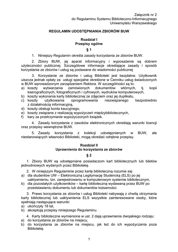 Załącznik nr 2 do Regulaminu Systemu Biblioteczno-Informacyjnego Uniwersytetu Warszawskiego REGULAMIN UDOSTĘPNIANIA ZBIORÓW BUW Rozdział I Przepisy ogólne §1 1. Niniejszy Regulamin określa zasady korzystania ze zbiorów BUW. 2. Zbiory BUW, jej aparat informacyjny i wyposażenie są dobrem użyteczności publicznej. Szczegółowe informacje określające zasady i sposób korzystania ze zbiorów i usług są podawane do wiadomości publicznej 3. Korzystanie ze zbiorów i usług Biblioteki jest bezpłatne. Użytkownik uiszcza jednak opłaty za usługi specjalne określone w Cenniku usług świadczonych w BUW wprowadzonym zarządzeniem Rektora. W szczególności są to: a) koszty wytwarzania zamówionych dokumentów wtórnych, tj. kopii kserograficznych, fotograficznych i cyfrowych, wydruków komputerowych, b) koszty wykonania karty bibliotecznej ze zdjęciem oraz jej duplikatu, c) koszty użytkowania oprogramowania niezwiązanego bezpośrednio z działalnością informacyjną, d) koszty obsługi konta kaucyjnego, e) koszty związane z realizacją wypożyczeń międzybibliotecznych, f) kary za przetrzymanie wypożyczonych książek. 4. Zasady korzystania z zasobów elektronicznych określają warunki licencji oraz przepisy wewnętrzne BUW. 5. Zasady korzystania z kolekcji udostępnianych w niestanowiących własności Biblioteki, mogą określać odrębne przepisy. BUW, ale Rozdział II Uprawnienia do korzystania ze zbiorów §2 1. Zbiory BUW są udostępniane posiadaczom kart bibliotecznych lub biletów jednodniowych wydanych przez Bibliotekę. 2. W niniejszym Regulaminie przez kartę biblioteczną rozumie się: a) dla studentów UW – Elektroniczną Legitymację Studencką (ELS) po jej uaktywnieniu, tzn. zarejestrowaniu w komputerowym systemie bibliotecznym, b) dla pozostałych użytkowników – kartę biblioteczną wydawaną przez BUW po przedstawieniu dokumentu lub dokumentów tożsamości. 3. Prawo korzystania ze zbiorów i usług Biblioteki nabywają z chwilą otrzymania karty bibliotecznej lub uaktywnienia ELS wszystkie zainteresowane osoby, które spełniają następujące warunki: a) ukończyły 18 lat, b) akceptują przepisy niniejszego Regulaminu. 4. Karty biblioteczne wymienione w ust. 2 dają uprawnienia dwojakiego rodzaju: a) do korzystania ze zbiorów na miejscu, b) do korzystania ze zbiorów na miejscu, jak też do ich wypożyczania poza Bibliotekę. 1 5. Uprawnień wynikających z posiadania karty nie wolno odstępować. Upoważnienie dla innej osoby może być wystawione tylko w wyjątkowych przypadkach (np. choroby, niepełnosprawności, w innych sytuacjach losowych) i na czas określony, nie dłuższy niż sześć miesięcy, na specjalnym formularzu. 6. Czytelnik ma prawo do posiadania jednej karty bibliotecznej. a) b) c) d) e) f) g) 7. Kartę, o której mowa w ust. 4 lit. b mają prawo otrzymać: wszyscy pracownicy UW, również emerytowani, studenci i doktoranci wszystkich rodzajów studiów prowadzonych w UW oraz słuchacze studiów podyplomowych, profesorowie wizytujący UW, samodzielni pracownicy nauki spoza UW, zameldowani w Warszawie, inni użytkownicy, na podstawie decyzji Dyrektora BUW, biblioteki jednostek organizacyjnych Uniwersytetu Warszawskiego, inne biblioteki naukowe warszawskie za zgodą kierownika Oddziału Udostępniania i Informacji Naukowej. 8. Kartę, o której mowa w ust. 4 lit. b mają prawo, po wniesieniu kaucji pieniężnej, otrzymać: pracownicy naukowo-dydaktyczni zatrudnieni na UW na czas określony na podstawie umów cywilnoprawnych oraz, za zgodą kierownika Oddziału Udostępniania i Informacji Naukowej, doktoranci, którzy są związani z UW osobą promotora, po przedstawieniu od niego rekomendacji. Konto kaucyjne jest ważne przez jeden rok. Zwrot kaucji, po potrąceniu opłaty za prowadzenie konta, następuje po uregulowaniu zobowiązań wobec Biblioteki. Wysokość kaucji oraz opłat za prowadzenie konta określa Cenniku usług świadczonych w BUW. Po upływie roku od zaprzestania korzystania z wypożyczalni, nieodebrana kaucja jest wpłacana na konto BUW. 9. Karty biblioteczne wydawane są na określony czas i podlegają prolongowaniu. Prolongowanie jest możliwe tylko w przypadku braku zobowiązań użytkownika wobec bibliotek systemu biblioteczno-informacyjnego UW. 10. BUW wydaje również bilety jednodniowe w przypadkach określonych w przepisach porządkowych. Rozdział III Udostępnianie zbiorów Zasady ogólne §3 a) b) c) d) 1. Zbiory BUW są udostępniane: na miejscu, poprzez wypożyczanie poza Bibliotekę, poprzez wypożyczanie międzybiblioteczne, poprzez sieć komputerową w przypadku zasobów elektronicznych. 2. Samodzielni nauczyciele akademiccy są obsługiwani w pierwszej kolejności, a rewersy złożone przez nich w Czytelni Ogólnej są realizowane niezwłocznie. 3. Sekcja Kopiowania Zbiorów BUW wykonuje dokumenty wtórne (kopie) ze zbiorów BUW, bibliotek jednostek organizacyjnych UW, a w uzasadnionych wypadkach również z dzieł sprowadzonych przez Wypożyczalnię Międzybiblioteczną. BUW udostępnia użytkownikom samoobsługowe kopiarki i drukarki. BUW ma prawo nie wyrazić zgody na kopiowanie niektórych materiałów bibliotecznych (zbiory XIX-wieczne, zniszczone itp.). 4. Przy wykonywaniu dokumentów wtórnych obowiązują przepisy prawa autorskiego. 2 Udostępnianie na miejscu §4 1. Ze zbiorów BUW na miejscu można korzystać w czytelniach, pracowniach, obszarze wolnego dostępu oraz w kabinach pracy indywidualnej i salach pracy grupowej. 2. Sposób korzystania z czytelni, pracowni, czytelni zbiorów specjalnych, innych kolekcji oraz kabin indywidualnych określają szczegółowe instrukcje Dyrektora BUW. 3. Ze zbiorów znajdujących się w wolnym dostępie oraz w Czytelni Ogólnej (oprócz zbiorów zamówionych z magazynu) czytelnicy mogą korzystać samodzielnie w obszarach publicznie dostępnych przeznaczonych do pracy. 4. Płyty CD, DVD, kasety audio zarówno samoistne, jak i dołączone do ksi
