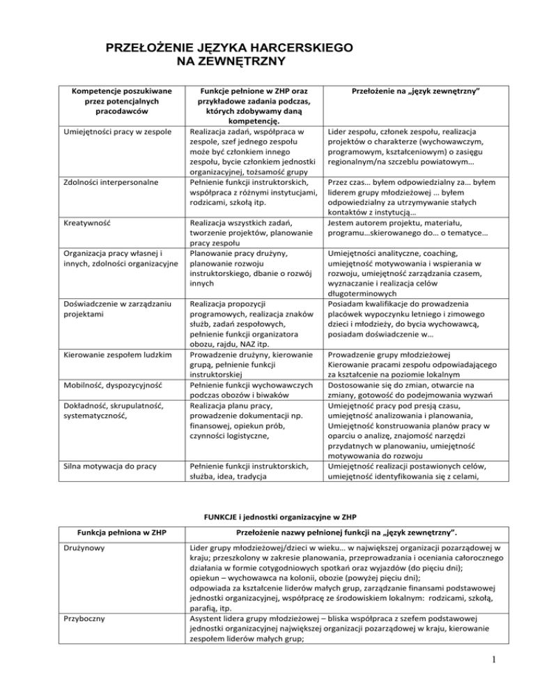 PRZEŁOŻENIE JĘZYKA HARCERSKIEGO NA ZEWNĘTRZNY KOMPETENCJE Kompetencje poszukiwane przez potencjalnych pracodawców Umiejętności pracy w zespole Zdolności interpersonalne Kreatywność Organizacja pracy własnej i innych, zdolności organizacyjne Doświadczenie w zarządzaniu projektami Kierowanie zespołem ludzkim Mobilność, dyspozycyjność Dokładność, skrupulatność, systematyczność, Silna motywacja do pracy Funkcje pełnione w ZHP oraz przykładowe zadania podczas, których zdobywamy daną kompetencję. Realizacja zadań, współpraca w zespole, szef jednego zespołu może być członkiem innego zespołu, bycie członkiem jednostki organizacyjnej, tożsamość grupy Pełnienie funkcji instruktorskich, współpraca z różnymi instytucjami, rodzicami, szkołą itp. Realizacja wszystkich zadań, tworzenie projektów, planowanie pracy zespołu Planowanie pracy drużyny, planowanie rozwoju instruktorskiego, dbanie o rozwój innych Realizacja propozycji programowych, realizacja znaków służb, zadań zespołowych, pełnienie funkcji organizatora obozu, rajdu, NAZ itp. Prowadzenie drużyny, kierowanie grupą, pełnienie funkcji instruktorskiej Pełnienie funkcji wychowawczych podczas obozów i biwaków Realizacja planu pracy, prowadzenie dokumentacji np. finansowej, opiekun prób, czynności logistyczne, Pełnienie funkcji instruktorskich, służba, idea, tradycja Przełożenie na „język zewnętrzny” Lider zespołu, członek zespołu, realizacja projektów o charakterze (wychowawczym, programowym, kształceniowym) o zasięgu regionalnym/na szczeblu powiatowym… Przez czas… byłem odpowiedzialny za… byłem liderem grupy młodzieżowej … byłem odpowiedzialny za utrzymywanie stałych kontaktów z instytucją… Jestem autorem projektu, materiału, programu…skierowanego do… o tematyce… Umiejętności analityczne, coaching, umiejętność motywowania i wspierania w rozwoju, umiejętność zarządzania czasem, wyznaczanie i realizacja celów długoterminowych Posiadam kwalifikacje do prowadzenia placówek wypoczynku letniego i zimowego dzieci i młodzieży, do bycia wychowawcą, posiadam doświadczenie w… Prowadzenie grupy młodzieżowej Kierowanie pracami zespołu odpowiadającego za kształcenie na poziomie lokalnym Dostosowanie się do zmian, otwarcie na zmiany, gotowość do podejmowania wyzwań Umiejętność pracy pod presją czasu, umiejętność analizowania i planowania, Umiejętność konstruowania planów pracy w oparciu o analizę, znajomość narzędzi przydatnych w planowaniu, umiejętność motywowania do rozwoju Umiejętność realizacji postawionych celów, umiejętność identyfikowania się z celami, FUNKCJE i jednostki organizacyjne w ZHP Funkcja pełniona w ZHP Drużynowy Przyboczny Przełożenie nazwy pełnionej funkcji na „język zewnętrzny”. Lider grupy młodzieżowej/dzieci w wieku… w największej organizacji pozarządowej w kraju; przeszkolony w zakresie planowania, przeprowadzania i oceniania całorocznego działania w formie cotygodniowych spotkań oraz wyjazdów (do pięciu dni); opiekun – wychowawca na kolonii, obozie (powyżej pięciu dni); odpowiada za kształcenie liderów małych grup, zarządzanie finansami podstawowej jednostki organizacyjnej, współpracę ze środowiskiem lokalnym: rodzicami, szkołą, parafią, itp. Asystent lidera grupy młodzieżowej – bliska współpraca z szefem podstawowej jednostki organizacyjnej największej organizacji pozarządowej w kraju, kierowanie zespołem liderów małych grup; 1 Zastępowy Szeregowy Komendant hufca Zastępca komendanta hufca ds. organizacyjnych Z-ca programowy Komenda Hufca Przewodniczący HKSI Szef Zespołu Kadry Kształcącej Członek Zespołu Kadry Kształcącej Namiestnik Skarbnik Kwatermistrz Przewodniczący Komisji Rewizyjnej Hufca Szef inspektoratu Szef biura Członek komisji historycznej Komendant kręgu akademickiego, kręgu instruktorskiego Komendant szczepu Szef kuchni obozowej Drużyna zastępca lidera w zakresie…; Kierowanie małą grupą (ok. 6 os.); komunikatywność; współpraca z przełożonym i ludźmi na równorzędnych stanowiskach; zmysł organizacyjny; występowanie z inicjatywą; przeszkolenie Członek największej organizacji pozarządowej w Polsce; współpraca w grupie; realizacja zadań zespołowych/projektów/swoich zainteresowań w zespole (np. turystyka); punktualność, obowiązkowość, odpowiedzialność, aktywność, asertywność, pewność siebie Szef zarządu jednostki terenowej (działającej na szczeblu powiatowym lub gminnym) stowarzyszenia/organizacji pozarządowej Kierownik ds. organizacyjnych, odpowiada za planowanie, organizowanie, ewaluację imprez masowych Osoba odpowiedzialna za działalność programowo-wychowawczą jednostki terenowej stowarzyszenia/organizacji pozarządowej Zarząd jednostki stowarzyszenia/organizacji poza stowarzyszenia/organizacji pozarządowej działający na szczeblu powiatowym lub gminnym Szef komisji działającej na szczeblu powiatowym lub gminnym, odpowiedzialnej za rozwój kadry wychowawczej w jednostce terenowej stowarzyszenia/organizacji pozarządowej Szef zespołu trenerskiego jednostki stowarzyszenia/organizacji pozarządowej działającej na szczeblu powiatowym lub gminnym; kierownik zespołu trenerów; szkolenie liderów grup młodzieżowych, koordynatorów pracy zespołów liderów, kierowników zespołu kontrolingu podnoszenie kwalifikacji Członek zespołu trenerskiego jednostki stowarzyszenia/organizacji pozarządowej działająca na szczeblu powiatowym lub gminnym Animator pracy liderów grup młodzieżowych, osoba wspierająca pracę liderów grup młodzieżowych, kierowania zespołem liderów grup (określić wiek) na poziomie powiatu; kreowanie programów; wydobywanie inicjatyw; wymiana doświadczeń i umiejętności; systematyczna, twórcza działalność z liderami Członek zarządu jednostki (działającej na szczeblu powiatowym lub gminnym) stowarzyszenia/organizacji