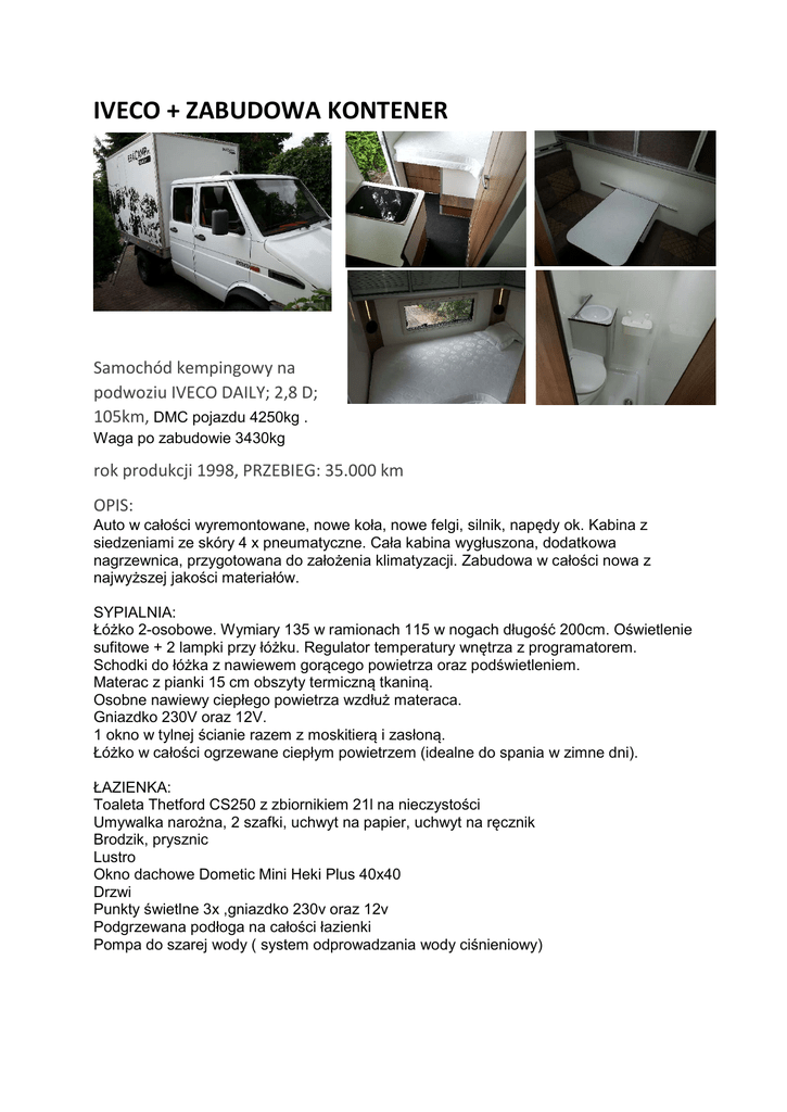 IVECO + ZABUDOWA KONTENER Samochód kempingowy na podwoziu IVECO DAILY; 2,8 D; 105km, DMC pojazdu 4250kg . Waga po zabudowie 3430kg rok produkcji 1998, PRZEBIEG: 35.000 km OPIS: Auto w całości wyremontowane, nowe koła, nowe felgi, silnik, napędy ok. Kabina z siedzeniami ze skóry 4 x pneumatyczne. Cała kabina wygłuszona, dodatkowa nagrzewnica, przygotowana do założenia klimatyzacji. Zabudowa w całości nowa z najwyższej jakości materiałów. SYPIALNIA: Łóżko 2-osobowe. Wymiary 135 w ramionach 115 w nogach długość 200cm. Oświetlenie sufitowe + 2 lampki przy łóżku. Regulator temperatury wnętrza z programatorem. Schodki do łóżka z nawiewem gorącego powietrza oraz podświetleniem. Materac z pianki 15 cm obszyty termiczną tkaniną. Osobne nawiewy ciepłego powietrza wzdłuż materaca. Gniazdko 230V oraz 12V. 1 okno w tylnej ścianie razem z moskitierą i zasłoną. Łóżko w całości ogrzewane ciepłym powietrzem (idealne do spania w zimne dni). ŁAZIENKA: Toaleta Thetford CS250 z zbiornikiem 21l na nieczystości Umywalka narożna, 2 szafki, uchwyt na papier, uchwyt na ręcznik Brodzik, prysznic Lustro Okno dachowe Dometic Mini Heki Plus 40x40 Drzwi Punkty świetlne 3x ,gniazdko 230v oraz 12v Podgrzewana podłoga na całości łazienki Pompa do szarej wody ( system odprowadzania wody ciśnieniowy) KUCHNIA - SALON: Kuchenka gazowa 1-palnikowa ze zlewem z pokrywą szklaną + instalacja gazowa oraz piezoelektrycznym iskrownikiem Gniazdka 220V, 12V Stolik kuchenny z systemem obniżania - możliwość uzyskania dodatkowych 2 miejsc do spania Lodówka Dometic CDF 25 sprężarkowa ( zasilanie 12v) Oświetlenie sufitowe Gniazdka 220V, 12V Szafki kuchenne wzmocnione aluminiowymi profilami Instalacja elektryczna, Instalacja wodna, Instalacja grzewcza Roleta FIAMMA F45S FAKTURA VAT METODY ZAKUPU: Gotówka Leasing CENA: 120.000 ZŁ brutto (98.000 ZŁ netto)