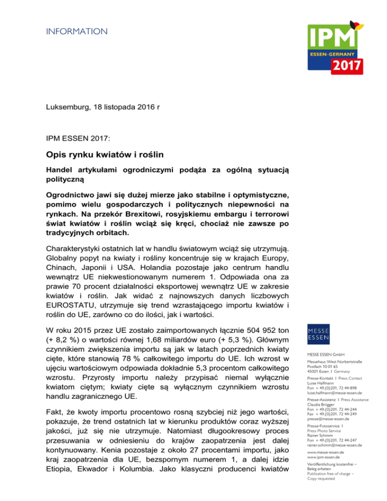 INFORMATION Luksemburg, 18 listopada 2016 r IPM ESSEN 2017: Opis rynku kwiatów i roślin Handel artykułami ogrodniczymi podąża za ogólną sytuacją polityczną Ogrodnictwo jawi się dużej mierze jako stabilne i optymistyczne, pomimo wielu gospodarczych i politycznych niepewności na rynkach. Na przekór Brexitowi, rosyjskiemu embargu i terrorowi świat kwiatów i roślin wciąż się kręci, chociaż nie zawsze po tradycyjnych orbitach. Charakterystyki ostatnich lat w handlu światowym wciąż się utrzymują. Globalny popyt na kwiaty i rośliny koncentruje się w krajach Europy, Chinach, Japonii i USA. Holandia pozostaje jako centrum handlu wewnątrz UE niekwestionowanym numerem 1. Odpowiada ona za prawie 70 procent działalności eksportowej wewnątrz UE w zakresie kwiatów i roślin. Jak widać z najnowszych danych liczbowych EUROSTATU, utrzymuje się trend wzrastającego importu kwiatów i roślin do UE, zarówno co do ilości, jak i wartości. W roku 2015 przez UE zostało zaimportowanych łącznie 504 952 ton (+ 8,2 %) o wartości równej 1,68 miliardów euro (+ 5,3 %). Głównym czynnikiem zwiększenia importu są jak w latach poprzednich kwiaty cięte, które stanowią 78 % całkowitego importu do UE. Ich wzrost w ujęciu wartościowym odpowiada dokładnie 5,3 procentom całkowitego wzrostu. Przyrosty importu należy przypisać niemal wyłącznie kwiatom ciętym; kwiaty cięte są wyłącznym czynnikiem wzrostu handlu zagranicznego UE. Fakt, że kwoty importu procentowo rosną szybciej niż jego wartości, pokazuje, że trend ostatnich lat w kierunku produktów coraz wyższej jakości, już się nie utrzymuje. Natomiast długookresowy proces przesuwania w odniesieniu do krajów zaopatrzenia jest dalej kontynuowany. Kenia pozostaje z około 27 procentami importu, jako kraj zaopatrzenia dla UE, bezspornym numerem 1, a dalej idzie Etiopia, Ekwador i Kolumbia. Jako klasyczni producenci kwiatów MESSE ESSEN GmbH Messehaus West Norbertstraße Postfach 10 01 65 45001 Essen I Germany Presse-Kontakt I Press Contact Luise Halfmann Fon + 49.(0)201. 72 44-898 [email protected] Presse-Assistenz I Press Assistance Claudia Brügger Fon + 49.(0)201. 72 44-244 Fax + 49.(0)201. 72 44-249 [email protected] Presse-Fotoservice I Press Photo Service Rainer Schimm Fon + 49.(0)201. 72 44-247 [email protected] www.messe-essen.de www.ipm-essen.de Veröffentlichung kostenfrei – Beleg erbeten Publication free of charge – Copy requested INFORMATION ciętych kraje te są odpowiedzialne za opisany przyrost importu przez UE. Nadal rozbudowują one swoją pozycję na rynku jako eksporterzy do UE. Natomiast kraje eksportujące, jak Izrael, USA i Kostaryka wykazują tendencję spadkową. Wartościowo eksport UE wzrasta – ilościowo nie Według EUROSTATU w roku 2015 wywieziono z UE kwiaty i rośliny w ilości 664 000 ton o wartości 1,98 miliardów euro. W porównaniu do roku poprzedniego jest to spadek ilościowy o 3,1 procent. Wzrastający zgodnie z tendencją od dziesięciu lat eksport UE jest tym samym od roku 2013 malejący po raz drugi z rzędu. Jednocześnie należy zauważyć przyrost wartości o 5,1 procent, który dotyczy wszystkich asortymentów kwiatów i roślin. Malejący wolumen eksportu przy wzrastającej wartości oznacza, że przez kraje członkowskie UE eksportowane są produkty coraz wyższej jakości. Nadwyżka handlowa pozostaje Pomimo rosnącego importu przez UE kwiatów ciętych a tym samym dalszego rozszerzenia ujemnego bilansu handlowego w segmencie kwiatów ciętych i ciętych roślin zielonych (2015: ok. - 620 mln € / 2014: ok. - 500 mln €) bilans handlowy UE jest dodatni. Całkowity bilans wykazuje nadwyżkę handlową w zakresie kwiatów i roślin w wysokości około 300 milionów euro. Nadwyżka handlowa jest zauważalna już od roku 2002 a należy ją przypisać przede wszystkim eksportowi cebulek kwiatowych i bulw z terenu UE. Rynki docelowe eksportu EU z małymi tylko zmianami Rynki docelowe eksportu UE wyglądają na pierwszy rzut oka podobnie jak w przeszłości. Rosja i Szwajcaria pozostają krajami zdecydowanie najsilniejszego popytu na europejskie kwiaty i rośliny ozdobne. W roku 2015 UE wyeksportowała każdorazowo 20,5 procent wartości eksportu do Rosji (por. 2014: 21,3 %) i Szwajcarii (por. 2014: 20,7 %), po których następują rynki eksportowe USA (11,2 %), Norwegii (8,2 %) i Chin (5,9 %). Przy wtórnym oglądzie widać, że spadki eksportu do Rosji kompensowane są przez wzrost na innych rynkach docelowych. Oznacza to, że państwa członkowskie UE rozbudowują swoje stałe rynki eksportowe. Odpowiednio intensywnie INFORMATION troszczą się obecnie poszczególne kraje eksportujące UE o to, żeby zdobyć przyczółek w krajach, które w przeszłości zaniedbały. Dlatego coraz bardziej zabiegać się będzie o takie kraje, jak Turcja, Ukraina, Zjednoczone Emiraty Arabskie czy nawet Japonia. Federalny minister rolnictwa Schmidt podkreślił niedawno chęć umacniania ścisłego partnerstwa Niemiec z Turcją w sektorze rolniczym, a firmy holenderskie potwierdziły na wystawie Flower Expo Ukraine 2016 chęć silniejszej współpracy z Ukrainą. Należy odnotować nieznaczne wzrosty, do jednego procenta, na wszystkich, z wyjątkiem Ukrainy, rynkach docelowych eksportu UE. Ranking różnych rynków sprzedaży w zakresie wartości sprzedaży pozostaje tym samym stały. W roku 2016 dominują dwa tematy rozmów Wzrastający import i eksport UE w zakresie kwiatów i roślin jest przejawem stabilnego do wzrastającego handlu w branży. Zwłaszcza wartości eksportu w Holandii, ale także w Niemczech, wykazują rekordowy poziom i mogłyby nastroić branżę optymistycznie. I tak pozytywny rozwój eksportu Holandii utrzymuje się także jesienią roku 2016, po tym jak już rok 2015 przyniósł rekordową wartość eksportu w postaci łącznie 5,6 miliardów euro. Niemniej jednak rok 2016 wprowadził na rynku europejskim powszechną niepewność. „Brexit“ i „