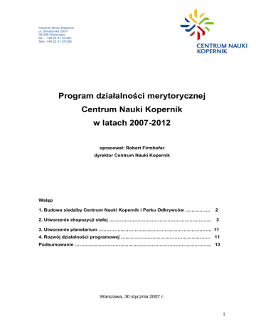 Centrum Nauki Kopernik ul. Senatorska 29/31 00-099 Warszawa tel.: +48 22 31 24 521 faks: +48 22 31 24 529 Program działalności merytorycznej Centrum Nauki Kopernik w latach 2007-2012 opracował: Robert Firmhofer dyrektor Centrum Nauki Kopernik Wstęp 1. Budowa siedziby Centrum Nauki Kopernik i Parku Odkrywców ……………. 2 2. Utworzenie ekspozycji stałej ……………………………………………………….. 3 3. Utworzenie planetarium ……………………………………………………………... 11 4. Rozwój działalności programowej ………………………………………………… 11 Podsumowanie …………………………………………………………………………... 13 Warszawa, 30 stycznia 2007 r. 1 Wstęp. 1. Centrum nauki jest nową w Polsce instytucją, zajmującą się tworzeniem i udostępnianiem interaktywnych urządzeń i eksponatów, umożliwiających zwiedzającym samodzielne przeprowadzenie doświadczeń lub obserwacji. Pierwsze centrum nauki pod nazwą Exploratorium powstało w 1969 roku w San Francisco, założone przez Franka Oppenheimera, profesora fizyki. Powodzenie tej formy edukacji, połączonej z nowatorską koncepcją wystawienniczą, spowodowało, że w ciągu następnych 37 lat stworzono ponad 500 centrów nauki, głównie w Ameryce Północnej, Australii i krajach Unii Europejskiej. W ostatnim czasie powstają coraz liczniejsze placówki tego typu w Azji, Afryce i wschodniej części Europy. 2. Warszawskie Centrum Nauki Kopernik (dalej: Centrum) wywodzi się z najważniejszych polskich działań popularnonaukowych – Pikników Naukowych i Festiwali Nauki. Ich ogromne powodzenie oraz wymierne efekty społeczne i poznawcze skłoniły władze Warszawy w porozumieniu z rządem RP do podjęcia inicjatywy przedstawionej po raz pierwszy w 1997 roku przez prof. Łukasza Turskiego (obecnie przewodniczącego Rady Programowej Centrum) i prof. Magdalenę Fikus (obecnie członka Rady Programowej). W 2004 roku prof. Lech Kaczyński, ówczesny prezydent Warszawy powołał Zespół d.s. Realizacji Projektu Centrum Nauki, kierowany od początku przez niżej podpisanego. Zespół, współpracując ściśle z Radą Programową, opracował koncepcję ekspozycji stałej oraz przygotował najważniejsze dokumenty dla przyszłej instytucji. W wyniku Porozumienia o intencji współpracy dla realizacji projektu „Eksploratorium” z dnia 17 marca 2004 pomiędzy Miastem st. Warszawa, Ministerstwem Nauki i Informatyzacji i Ministerstwem Edukacji Narodowej, a następnie Umowy z dnia 1.06.2005 r. o utworzeniu wspólnej instytucji kultury pn. Centrum Nauki Kopernik, podpisanej przez prezydenta Lecha Kaczyńskiego, ministra nauki i informatyzacji prof. Michała Kleibera i ministra edukacji narodowej Mirosława Sawickiego, po spełnieniu określonych umową warunków, w dniu 4 lipca 2006 r. Centrum Nauki Kopernik zostało wpisane do rejestru instytucji kultury prowadzonego przez Biuro Prezydenta Miasta st. Warszawy. 3. Podstawą działania Centrum jest przywołana wyżej umowa, wraz z aneksem z dnia 21.06.2006, Statut instytucji kultury pn. Centrum Nauki Kopernik z dnia 1.06.2005 wraz ze zmianami z dnia 21.06.2006 oraz Regulamin Rady Programowej Centrum Nauki Kopernik z dnia 1.06.2005 wraz ze zmianami z dnia 21.06.2006 r. Centrum działa w oparciu o ustawę z dnia 25 października 1991 roku o organizowaniu i prowadzeniu działalności kulturalnej. 4. Zgodnie ze Statutem celem działania centrum nauki jest upowszechnianie krajowych i światowych osiągnięć nauki i techniki, a w szczególności wyjaśnianie natury otaczających nas zjawisk i procesów przy pomocy naukowych narzędzi. Działalność centrum nauki przyczynia się do: • rozwijania zainteresowań nauką i kulturą poprzez ukazywanie ich jako obszaru atrakcyjnych poszukiwań, eksploracji i doświadczeń • wyjaśniania, jak ludzka wiedza może być wykorzystana dla rozwoju społeczeństwa • wspierania i uzupełniania szkolnych programów nauczania dla uczniów szkół różnego szczebla • tworzenia zaplecza edukacyjnego, poszerzającego lokalną, regionalną i ogólnopolską bazę edukacyjną 2 • • • • tworzenia i wyrównywania szans rozwoju i samorealizacji młodego pokolenia popularyzacji polskiej kultury i nauki w kontekście dokonań kultury i nauki światowej promocji idei kształcenia przez całe życie inspirowania debaty publicznej podejmującej społecznie istotne tematy naukowe i kulturalne 5. Cele sformułowane w statucie Centrum Nauki Kopernik będą realizowane przy pomocy interaktywnych ekspozycji, planetarium oraz bogatej działalności programowej. Interaktywna ekspozycja stała i planetarium pozwolą na przyciągnięcie w orbitę oddziaływania Centrum publiczności definiowanej w trzech podstawowych grupach celowych: zorganizowane grupy szkolne, rodziny dwu- lub trzypokoleniowe oraz młodzi dorośli. Poprzez rozbudowaną działalność programową Centrum docierać będzie z bardziej wyspecjalizowaną ofertą do różnych grup społecznych – począwszy od lokalnych społeczności w całej Polsce, przez szkolne i studenckie koła zainteresowań, nauczycieli, po intelektualistów i polityków. Powstała infrastruktura Centrum – zespół pracowników, sale konferencyjne, wolontariusze, biura wyposażone w komputery i telefony, a także osobowość prawna Centrum, umożliwiająca ubieganie się o różnego rodzaju środki finansowe - służyć będą wielu cennym inicjatywom edukacyjnym, kulturotwórczym i popularnonaukowym. 6. We wszystkich działaniach programowych, a także przy opracowywaniu koncepcji i projektów kolejnych działów ekspozycji stałej i planetarium, Centrum będzie blisko współpracowało z Radą Programową jako wyłonioną przez Organizatorów reprezentacją polskiego środowiska naukowego i dydaktycznego. 7. W niniejszym opracowaniu przedstawiono w czterech rozdziałach najważniejsze zadania w perspektywie 5 lat: