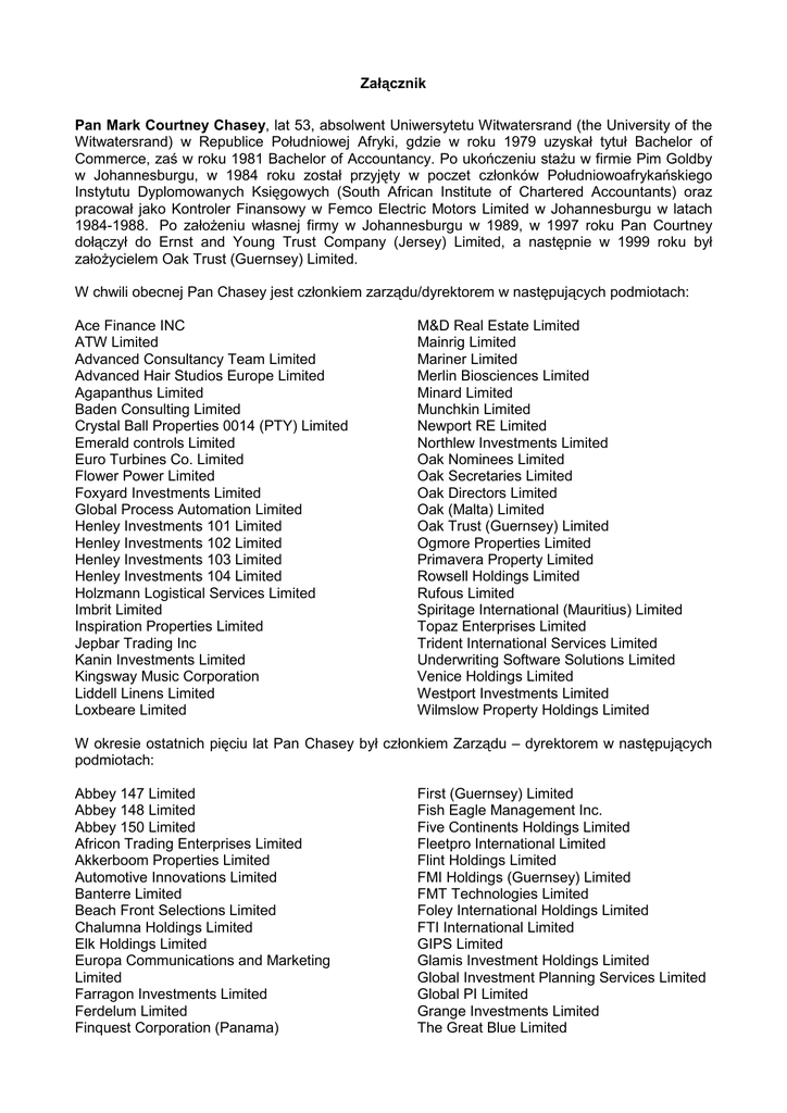 Załącznik Pan Mark Courtney Chasey, lat 53, absolwent Uniwersytetu Witwatersrand (the University of the Witwatersrand) w Republice Południowej Afryki, gdzie w roku 1979 uzyskał tytuł Bachelor of Commerce, zaś w roku 1981 Bachelor of Accountancy. Po ukończeniu staŜu w firmie Pim Goldby w Johannesburgu, w 1984 roku został przyjęty w poczet członków Południowoafrykańskiego Instytutu Dyplomowanych Księgowych (South African Institute of Chartered Accountants) oraz pracował jako Kontroler Finansowy w Femco Electric Motors Limited w Johannesburgu w latach 1984-1988. Po załoŜeniu własnej firmy w Johannesburgu w 1989, w 1997 roku Pan Courtney dołączył do Ernst and Young Trust Company (Jersey) Limited, a następnie w 1999 roku był załoŜycielem Oak Trust (Guernsey) Limited. W chwili obecnej Pan Chasey jest członkiem zarządu/dyrektorem w następujących podmiotach: Ace Finance INC ATW Limited Advanced Consultancy Team Limited Advanced Hair Studios Europe Limited Agapanthus Limited Baden Consulting Limited Crystal Ball Properties 0014 (PTY) Limited Emerald controls Limited Euro Turbines Co. Limited Flower Power Limited Foxyard Investments Limited Global Process Automation Limited Henley Investments 101 Limited Henley Investments 102 Limited Henley Investments 103 Limited Henley Investments 104 Limited Holzmann Logistical Services Limited Imbrit Limited Inspiration Properties Limited Jepbar Trading Inc Kanin Investments Limited Kingsway Music Corporation Liddell Linens Limited Loxbeare Limited M&D Real Estate Limited Mainrig Limited Mariner Limited Merlin Biosciences Limited Minard Limited Munchkin Limited Newport RE Limited Northlew Investments Limited Oak Nominees Limited Oak Secretaries Limited Oak Directors Limited Oak (Malta) Limited Oak Trust (Guernsey) Limited Ogmore Properties Limited Primavera Property Limited Rowsell Holdings Limited Rufous Limited Spiritage International (Mauritius) Limited Topaz Enterprises Limited Trident International Services Limited Underwriting Software Solutions Limited Venice Holdings Limited Westport Investments Limited Wilmslow Property Holdings Limited W okresie ostatnich pięciu lat Pan Chasey był członkiem Zarządu – dyrektorem w następujących podmiotach: Abbey 147 Limited Abbey 148 Limited Abbey 150 Limited Africon Trading Enterprises Limited Akkerboom Properties Limited Automotive Innovations Limited Banterre Limited Beach Front Selections Limited Chalumna Holdings Limited Elk Holdings Limited Europa Communications and Marketing Limited Farragon Investments Limited Ferdelum Limited Finquest Corporation (Panama) First (Guernsey) Limited Fish Eagle Management Inc. Five Continents Holdings Limited Fleetpro International Limited Flint Holdings Limited FMI Holdings (Guernsey) Limited FMT Technologies Limited Foley International Holdings Limited FTI International Limited GIPS Limited Glamis Investment Holdings Limited Global Investment Planning Services Limited Global PI Limited Grange Investments Limited The Great Blue Limited Grimes Associates Ltd Hale Investment Holdings Limited Heritage Africa Limited Hibern Trading Limited Hide Trade Limited Holzmann International Limited Hotten Limited Howley Limited I.D. Solutions Limited Informed Management Environment Limited Interfleur BV Limited International Petroleum Services Limited IMR Agencies Jacinta Holdings Limited Judogi Limited Kamida Trading Limited Lauzin Holdings Limited Lamont Investment Holdings Limited Linzee Investments Limited Londel Limited M & D Real Estate Limited Marcelline Trading Limited Mars International Limited Massey Holdings Limited Maze Limited M-Comm Holdings (Guernsey) Limited Medical Ventures Limited Medi Science Consultants Limited Menorah Communications Limited Myerconsult Limited Neath Limited No. 85 Imperial Wharf Limited Nohan Limited Northborough Enterprises Limited Northern Fruit Limited Oak Nominees Limited Oak Secretaries Limited Oakmore Investment Holdings Limited Orange Blossom Development Limited Orange Property Development Limited Pelham House Limited Pentahedron Holdings Limited Perrier Holdings Limited Peterborough Limited PR International Limited Purple Property Holdings Limited Quali Dent Prop Limited Quintec Investments Limited Raeworld Limited Relief Logistics Limited RFE Global (Guernsey) Limited Rhodium Holdings Limited Romer Investments Limited Roth Fairchild Equity Limited Roundwood Investments Limited S Limited Seeker Investments Limited Sistelle Limited Sports Management Associates Limited Starview Services UK Limited Stockford Limited Strategic Consolidated Investments Limited Sun Global Limited Synapp International Limited Talic Limited Tatum Development Limited Tokai Management Limited Topquip International Limited Tropicante Fuels (Pvt) LTD Tulie International Investments Limited Unique Cables Limited Viburnum Holdings Limited Virtual Management Group Limited Watkin Limited Wereld Wijede Agentschappen NV Wilson Holdings Limited Woodingdean Limtied Zucchero Limited Zuckero International Investments Limited Andrew Harvey Fox, lat 31, absolwent Uniwersytetu w Natal (the University of Natal), w Republice Południowej Afryki, gdzie w roku 1999 uzyskał tytuł Bachelor of Commerce, a następnie w roku 2000 ukończył studia podyplomowe Finanse, Bankowość i Zarządzanie Inwestycyjne (Post Graduate Diploma in Finance, Banking and Investment Management). W roku 2003 został przyjęty do Zrzeszenia Dyplomowanych Księgowych (the Association of Chartered Certified Accountants), gdzie w roku 2009 uzyskał status Członka (Fellow). Pan Fox dołączył do Oak Trust (Guernsey) Limited w 2001 roku, zaś w 2006 roku został wybrany jego Dyrektorem W chwili obecnej Pan Fox jest członkiem zarządu/dyrektorem w następujących podmiotach: Ace Finance Inc Agapanthus Limited Advanced Consultancy Team Limited Atlas Management Company Limited ATW Limited Emerald Controls Limited Euro Turbines Co. Limited Flower Power Limited Foxyard Investments Lim