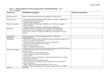 Załącznik nr 2 do SIWZ DG-2501/3359/603/11 Część 1 – komora laminarna II klasy bezpieczeństwa mikrobiologicznego – szt. 1 CPV: 38540000-2 Parametry Minimalne wymagania Przepływ powietrza pionowy, laminarny przepływ powietrza z recyrkulacją w stosunku 70:30 Wnętrze komory - zapewniające maksymalną ochronę produktu, operatora i powietrza - zabezpieczenie przed kontaminacją, brzegi zaokrąglone - wykonane ze stali nierdzewnej - wymiary zewnętrzne: 800 mm (gł.) x 1500mm (szer.) x 1300 (wys.), wysokość z podstawą: 2000 mm - wymiary wewnętrzne: 700mm (gł.) x 1500 mm(szer.) x 800mm (wys.) - blat roboczy 1200 mm, na wejściu komory V kształtny w celu dodatkowego zabezpieczenia nawiewu laminarnego, bez konieczności stosowania podpórek - blat roboczy ze stali najwyższej jakości AISI304 łatwy do utrzymania w czystości, dzielony, Wymiary maksymalne Blat roboczy Szyba przednia Okna boczne Wyposażenie Dodatkowe wymagania Zasilanie Oferowane parametry pochylona przednia ( 90) szyba gwarantująca komfortowe warunki pracy ze szkła bezpiecznego - 2 HEPA filtry z wydajnością min. 99,999% dla cząstek 0,3 um (każdy o grubości 11 cm, umieszczone w kasetach z podciśnieniem) - 3 silniki kontrolowane mikroprocesorowo, energooszczędne typu EC - podstawa antywibracyjna regulowaną wysokością - gniazdo elektryczne 2 sztuki - lampa UV z programatorem czasu pracy - dyfuzor światła: światło równomiernie rozproszone po całej powierzchni blatu roboczego - sterowanie mikroprocesorowe z cyfrowym wyświetlaczem parametrów pracy - łatwo przechodzi przez każde standartowe drzwi - szczelne zamknięcie komory po zakończeniu pracy - funkcja „stand by” - alarm wizualny i akustyczny informujący o zaburzeniach parametrów pracy z kodem identyfikującym rodzaj awarii - automatycznie kontrolowana prędkość nawiewu - otwór roboczy 20 cm, opcjonalnie może być podniesiony do 30 cm zachowaniem laminarności przepływu - światło > 2000 lux, regulowane, bezodblaskowe, nie razi w oczy, - głośność < 54 dBA w/g standardów TUV, UE, ISO, w funkcji „stand by < 48 dB(A) 230V/50Hz 1 Serwis Gwarancja Szkolenie Instrukcje obsługi Certyfikaty - serwis w Polsce - czas reakcji serwisu gwarancyjnego – do 48 godzin - dostępność części – co najmniej przez 10 lat od daty instalacji min. 24 miesiące szkolenie na miejscu, po instalacji i uruchomieniu urządzenia jedna kopia kompletu instrukcji w języku polskim deklaracja zgodności CE - świadcząca o zgodności urządzenia z europejskimi warunkami bezpieczeństwa Przez „czas reakcji” należy rozumieć czas, w którym serwisant, po otrzymaniu zgłoszenia, stawi się w siedzibie końcowego użytkownika i przystąpi do niezwłocznego usunięcia usterek Część 2 - inkubator CO2 z płaszczem wodnym – szt. 1 CPV: 33152000-0 Parametry Minimalne wymagania Pojemność Izolacja 180-185 litrów Płaszcz wodny o pojemności min. 40 litrów Zakres temperatury wewnątrz Jednorodność temp. od +5°C od temp. otoczenia do min. +55°C Stabilność temp. 0,1°C Zakres kontroli CO2 0-20% Czujnik CO2 T/C Wilgotność 95% przy 37°C Sterowanie mikroprocesorowe Oferowane parametry 0,2°C przy 37°C 2 Wyposażenie Komora robocza Wymiary zewnętrzne Gwarancja Szkolenie Instrukcje obsługi Certyfikaty Filtracja powietrza - oddzielne wyświetlacze dla temperatury i poziomu CO2 - wyświetlacz ze słownymi komunikatami o stanie urządzenia - przyciski membranowe - alarmy przekroczenia zadanej temp. i poziomu CO2 - szklane drzwi wewnętrzne – ogrzewane - minimum 4 półki na wyposażeniu - drzwi wewnętrzne wyposażone w autoklawowalną uszczelkę - drzwi zewnętrzne z możliwością zamiany strony zawieszenia - wykonana ze stali nierdzewnej 304 - wymiary nie mniejsze niż : 50 x 65 x 50cm (szer. x wys. x głęb.) - port dostępu do komory roboczej umiejscowiony na froncie urządzenia nie większe niż : - 105 cm (wys.) - 70 cm (szer.) - 65 cm (głęb.) min. 24 m-ce szkolenie na miejscu, po instalacji i uruchomieniu urządzenia jedna kopia kompletu instrukcji w języku polskim deklaracja zgodności CE - świadcząca o zgodności urządzenia z europejskimi warunkami bezpieczeństwa Ciągła filtracja powietrza poprzez wentylator z zamontowanym filtrem HEPA 3 Przez „czas reakcji” należy rozumieć czas, w którym serwisant, po otrzymaniu zgłoszenia, stawi się w siedzibie końcowego użytkownika i przystąpi do niezwłocznego usunięcia usterek Część 3 - zamrażarka niskotemperaturowa z systemem zasilania awaryjnego CO2 – szt. 1 CPV: 42513100-6 Parametry Minimalne wymagania Typ Pojemność szafowa - nie mniejsza niż 570 litrów Wymiary maksymalne - wewnętrzne: (szer.)800 mm x (gł.)600 mm x (wys.)1300mm - zewnętrzne: (szer.)1200mm x (gł.)900mm x (wys.)2000mm - zakres temperatur: od -50 do -86°C, - nastawa temperatury z dokładnością do 1°C, - mikroprocesorowa kontrola procesu chłodzenia oraz funkcji alarmowych, - hermetycznie zamknięty, kaskadowy system mrożenia o podwyższonej wydajności, - ciche kompresory gwarantujące bezawaryjną pracę zamrażarki do temperatury otoczenia +32°C, - warstwa izolacyjna komory wykonana z pianki poliuretanowej o grubości 130 mm. Temperatura i system chłodzenia Konfiguracja wnętrza - wnętrze komory wykonane z wysokiej jakości stali nierdzewnej odpornej na oksydacje, zadrapania i powstawanie rdzy, - komora zamrażarki podzielona na 5 sekcji z możliwością regulacji wysokości półek, - sekcje zamrażarki zamykane oddzielnymi drzwiami wewnętrznymi wyposażonymi w izolację, Wyposażenie - wyświetlacz zadanej i aktualnej temperatury oraz temperatur granicznych, przy których włącza się alarm umieszczony na wysokości wzroku użytkownika, - oprogramowanie diagnostyczne pozwalające na identyfikację usterek w pracy zamrażarki i ograniczenie kosztów obsługi serwisowej, - ogrzewany zawór zapobiegający powstawaniu podciśnienia w komorze, - wskaźnik informujący o koniecznoś