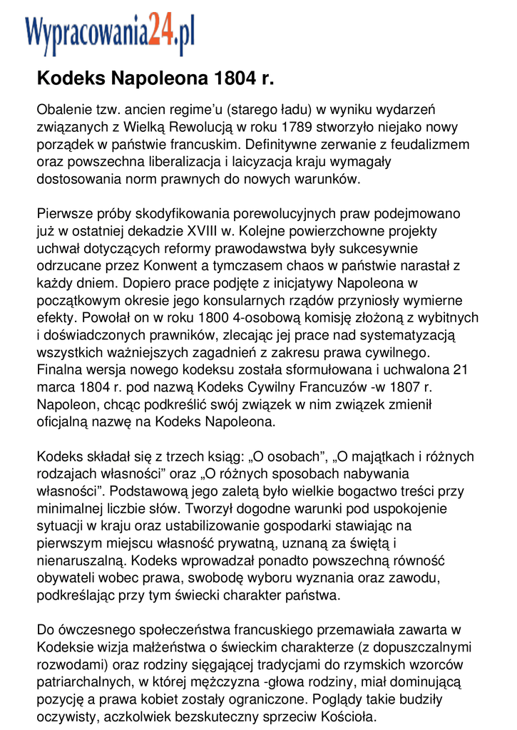 Kodeks Napoleona 1804 r. Obalenie tzw. ancien regime’u (starego ładu) w wyniku wydarzeń związanych z Wielką Rewolucją w roku 1789 stworzyło niejako nowy porządek w państwie francuskim. Definitywne zerwanie z feudalizmem oraz powszechna liberalizacja i laicyzacja kraju wymagały dostosowania norm prawnych do nowych warunków. Pierwsze próby skodyfikowania porewolucyjnych praw podejmowano już w ostatniej dekadzie XVIII w. Kolejne powierzchowne projekty uchwał dotyczących reformy prawodawstwa były sukcesywnie odrzucane przez Konwent a tymczasem chaos w państwie narastał z każdy dniem. Dopiero prace podjęte z inicjatywy Napoleona w początkowym okresie jego konsularnych rządów przyniosły wymierne efekty. Powołał on w roku 1800 4-osobową komisję złożoną z wybitnych i doświadczonych prawników, zlecając jej prace nad systematyzacją wszystkich ważniejszych zagadnień z zakresu prawa cywilnego. Finalna wersja nowego kodeksu została sformułowana i uchwalona 21 marca 1804 r. pod nazwą Kodeks Cywilny Francuzów -w 1807 r. Napoleon, chcąc podkreślić swój związek w nim związek zmienił oficjalną nazwę na Kodeks Napoleona. Kodeks składał się z trzech ksiąg: „O osobach”, „O majątkach i różnych rodzajach własności” oraz „O różnych sposobach nabywania własności”. Podstawową jego zaletą było wielkie bogactwo treści przy minimalnej liczbie słów. Tworzył dogodne warunki pod uspokojenie sytuacji w kraju oraz ustabilizowanie gospodarki stawiając na pierwszym miejscu własność prywatną, uznaną za świętą i nienaruszalną. Kodeks wprowadzał ponadto powszechną równość obywateli wobec prawa, swobodę wyboru wyznania oraz zawodu, podkreślając przy tym świecki charakter państwa. Do ówczesnego społeczeństwa francuskiego przemawiała zawarta w Kodeksie wizja małżeństwa o świeckim charakterze (z dopuszczalnymi rozwodami) oraz rodziny sięgającej tradycjami do rzymskich wzorców patriarchalnych, w której mężczyzna -głowa rodziny, miał dominującą pozycję a prawa kobiet zostały ograniczone. Poglądy takie budziły oczywisty, aczkolwiek bezskuteczny sprzeciw Kościoła. Napoleon chcąc wzmocnić swoje państwo potrzebował silnych i zdecydowanych rządów. Uważał, że jakąkolwiek formę władzy muszą sprawować osoby posiadające autorytet -prefekt w departamencie, generał w wojsku czy ojciec w rodzinie -tak wyobrażał sobie filary nowego, silniejszego i bardziej scentralizowanego państwa. Realizację tych zamierzeń ułatwiał mu wprowadzony w 1804 r. szczegółowy i dogłębnie regulujący problematyczne kwestie Kodeks. W opinii historyków i znawców prawa Kodeks Napoleona uchodzi za jeden z wzorcowych, spisanych zbiorów praw. Stawiany często na równi ze starożytnymi kodyfikacjami z czasów Hammurabiego czy Justyniana był bodaj najtrwalszą pozostałością panowania Napoleona, która przyjęła się nie tylko we Francji, ale także w nieco zmienionej formie w innych państwach europejskich.